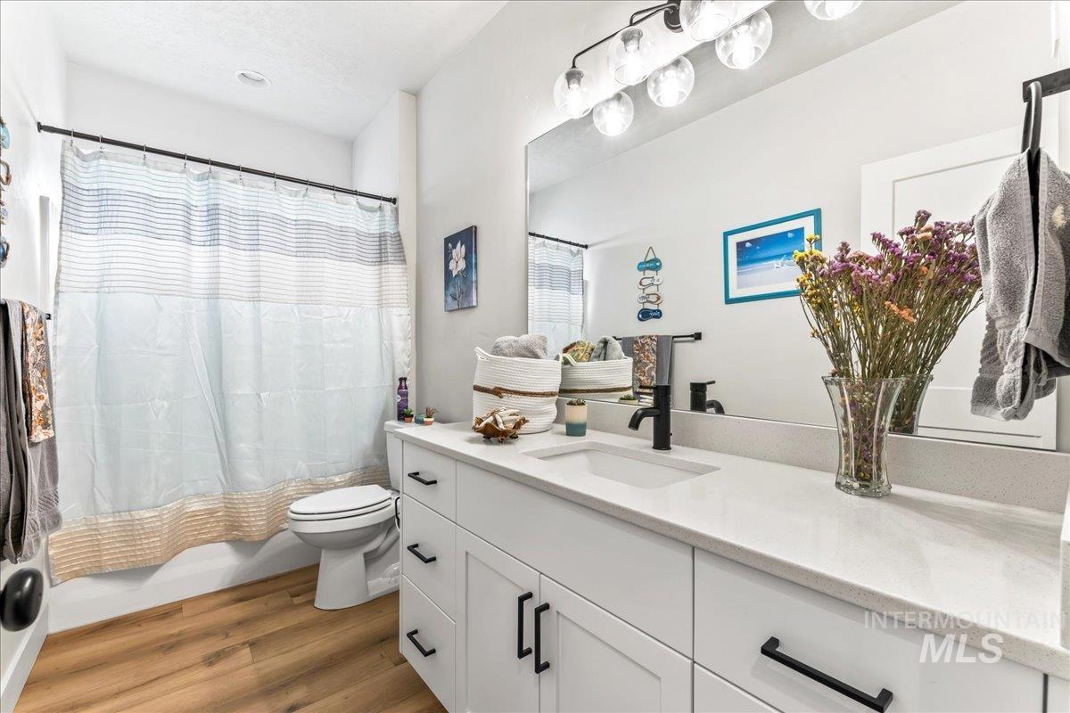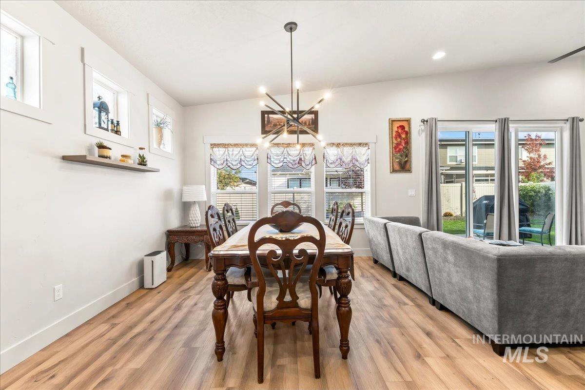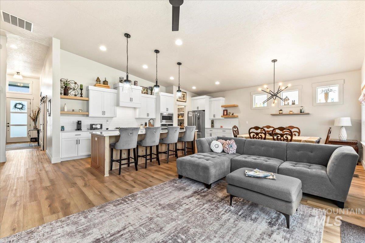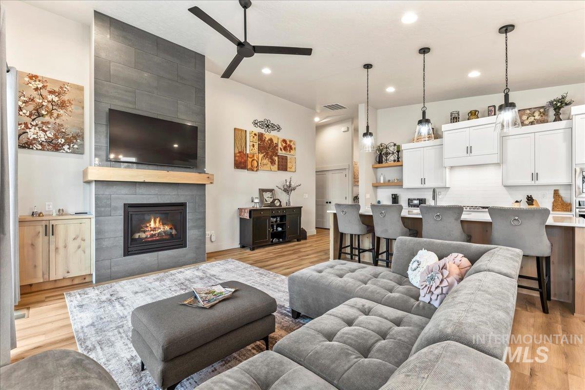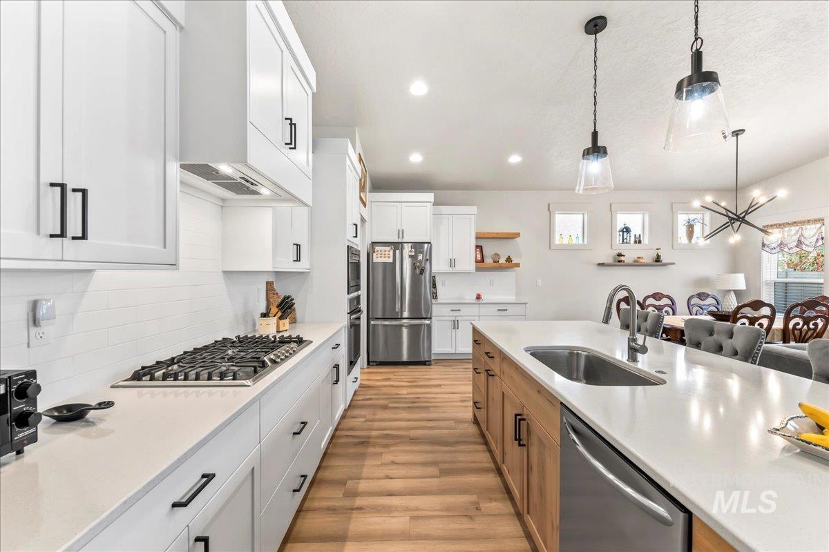 Modern living meets small-town charm! Welcome home to this gorgeous single-level in one of Kuna’s most vibrant communities. Featuring 3 bedrooms, 2 bathrooms, and an inviting open floor plan, this home is designed for effortless living and entertaining. You’ll love the bright, spacious great room with a cozy gas fireplace, elegant hard-surface flooring, and modern designer lighting throughout. The chef’s kitchen steals the show with sleek cabinetry, a built-in range, walk-in pantry, and a huge island—perfect for gatherings with friends and family. Step outside to your fully fenced, fully landscaped, low-maintenance yard with automatic sprinklers, creating a beautiful space to relax and enjoy Idaho evenings without the hassle of upkeep. Plus, the community pool and clubhouse are just minutes from your door, offering a resort-style lifestyle right in your neighborhood. Close to shopping, dining, and schools, with easy access to I-84, this home offers the perfect blend of comfort, convenience, and contemporary style.