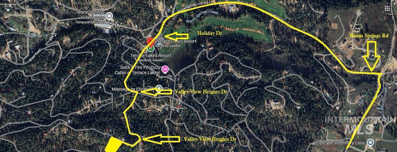 From Crouch take Middlefork Rd. N to Warm Springs Rd. Left on Warm Springs. Go past clubhouse to Holiday. Stay on asphalt up the hill and turn right on Valley Heights Dr. Stay right on Vally Heights Dr. When you come tpo Valley heights Drive and Valley View Circle street sign, turn right on Valley View Heights. Property is 4th lot on the left. Look for Real Estate Sign.
