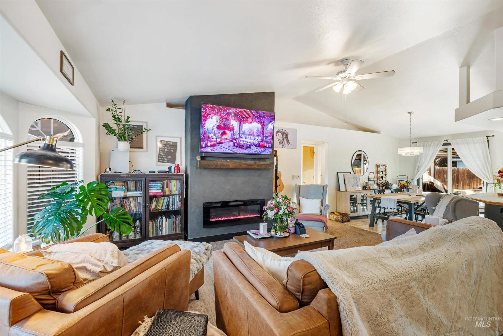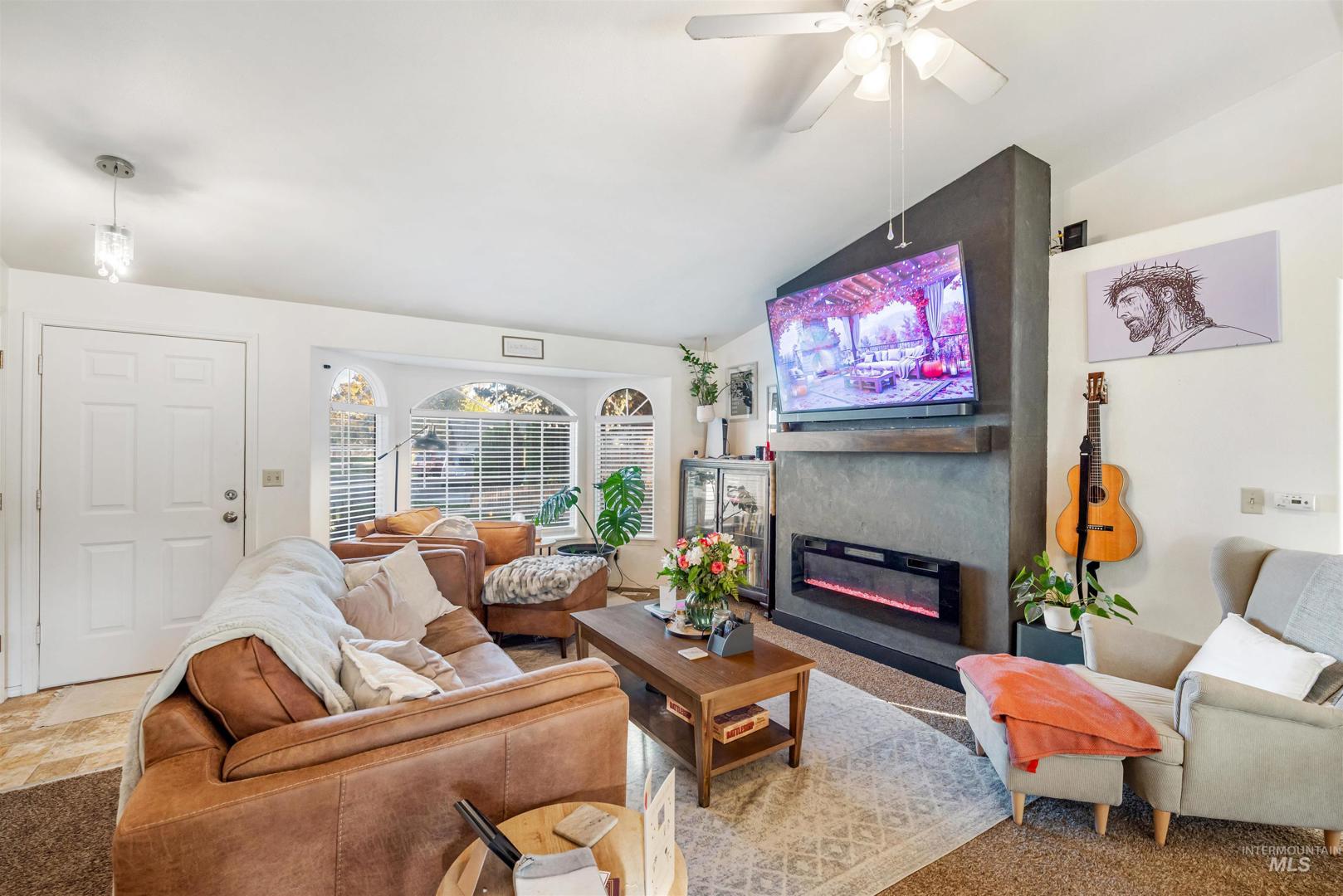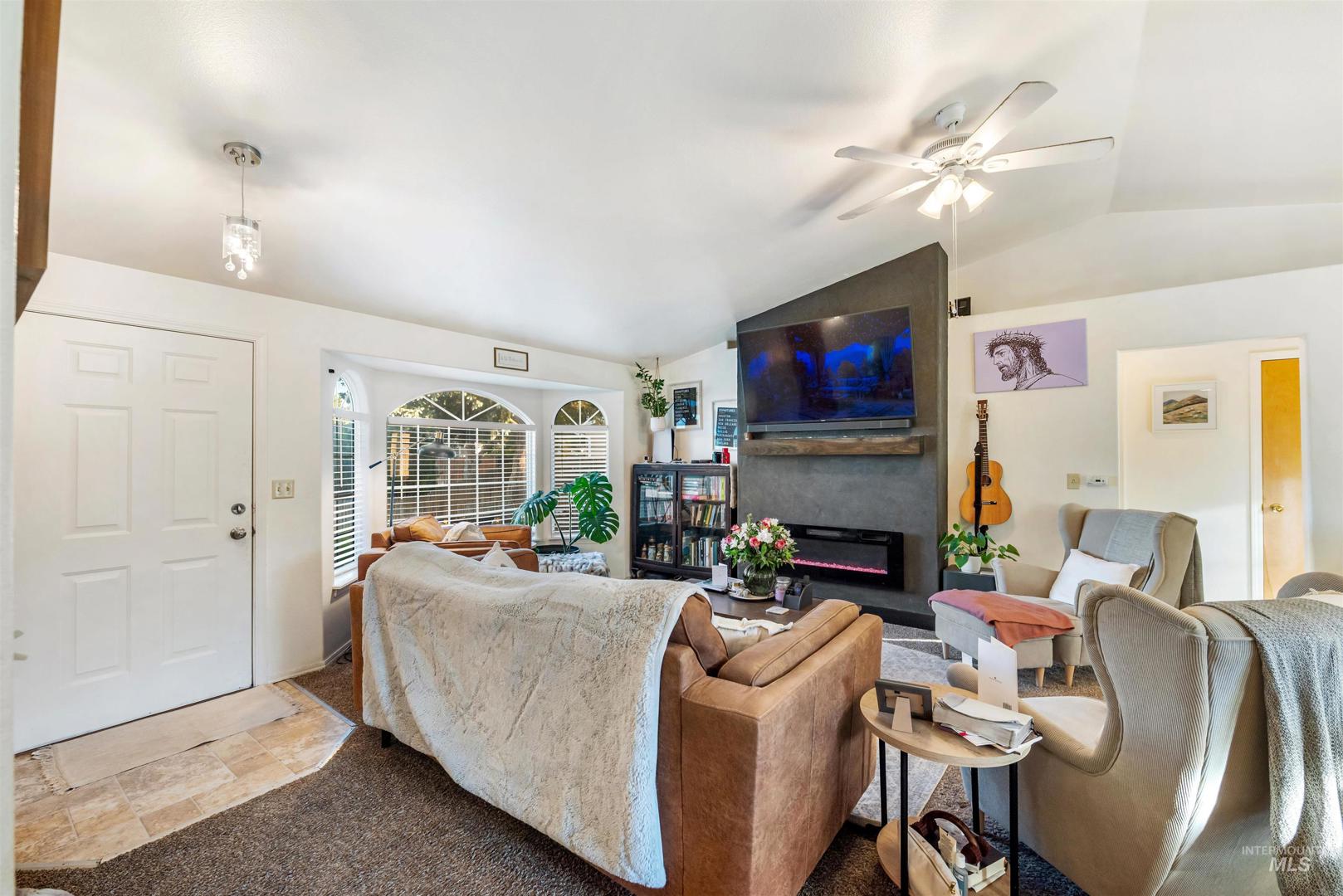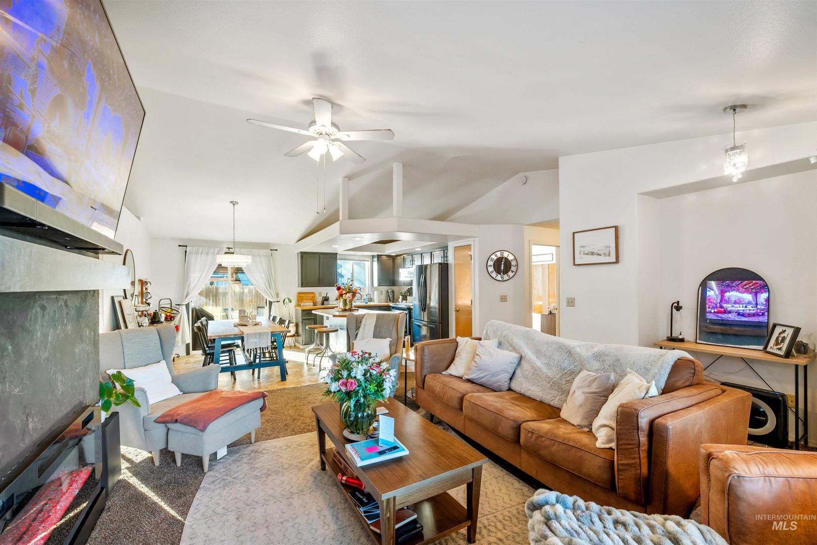 Beautiful Single-Level Home with Split Bedroom Design and Vaulted Ceilings! This move-in ready home offers a spacious open floorplan with a desirable split-bedroom layout for added privacy. Enjoy the airy feel of vaulted ceilings throughout the main living areas and a cozy electric fireplace that adds warmth and charm. The newly painted kitchen cabinets complement the newer stainless-steel appliances, including a gas range, pantry, and center island with breakfast bar—perfect for entertaining or casual meals. Step outside to a large, fully fenced yard with mature trees, offering both shade and privacy. The newer concrete driveway provides potential RV parking, and the roof has been recently replaced for added peace of mind. Located near schools with low HOA dues, this home combines comfort, convenience, and value.