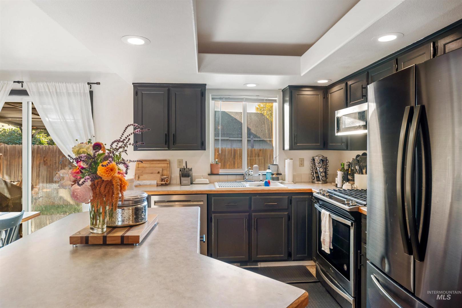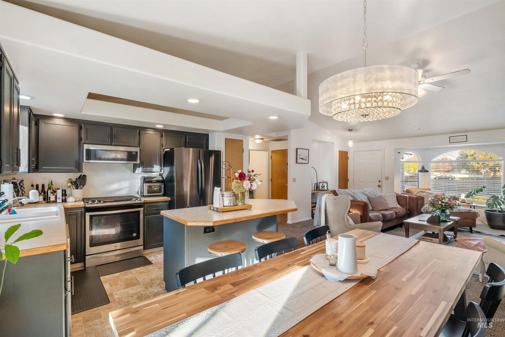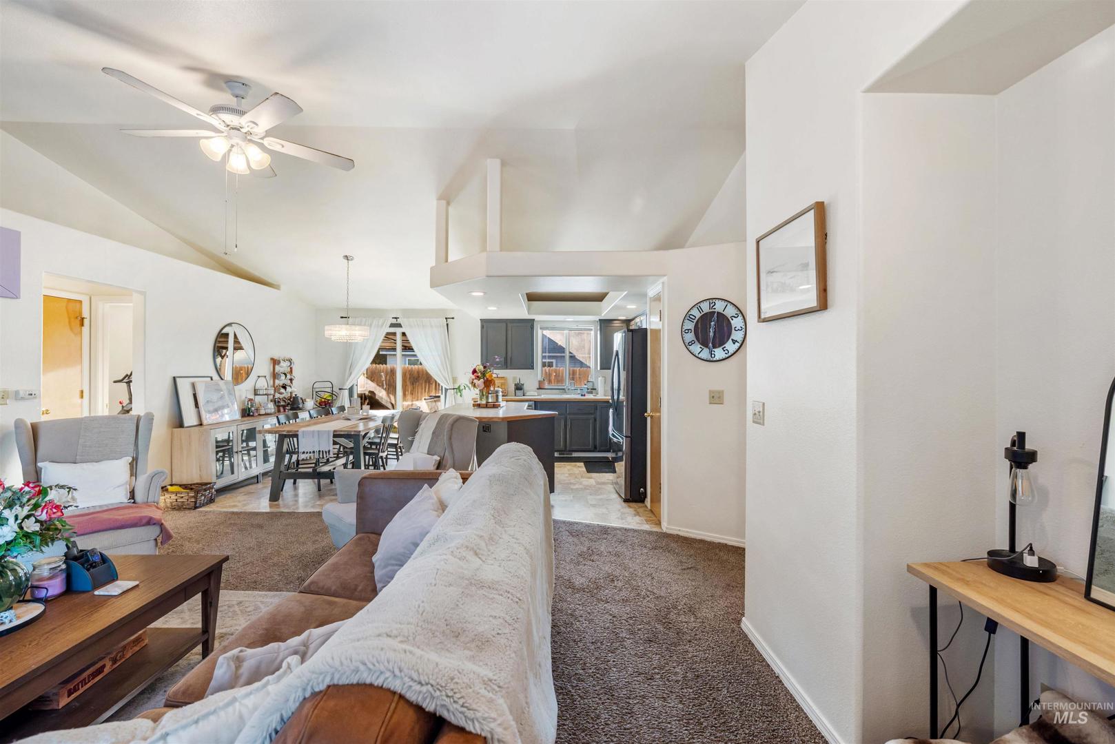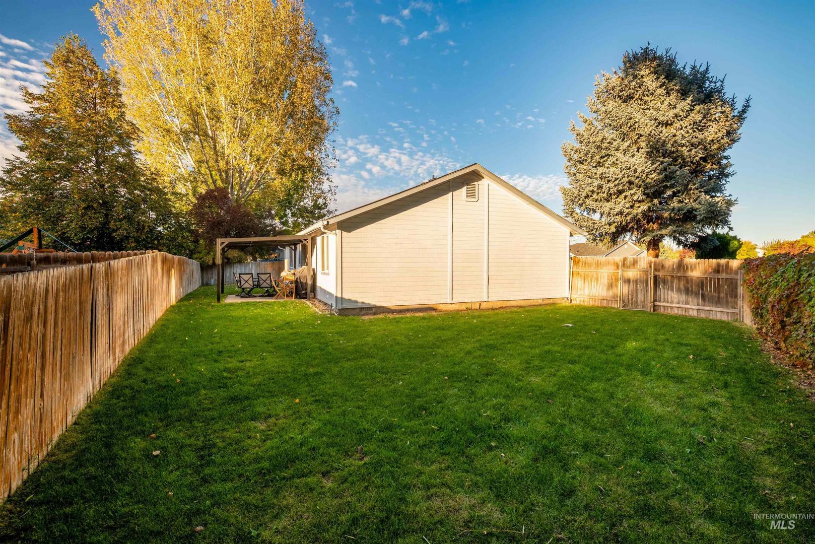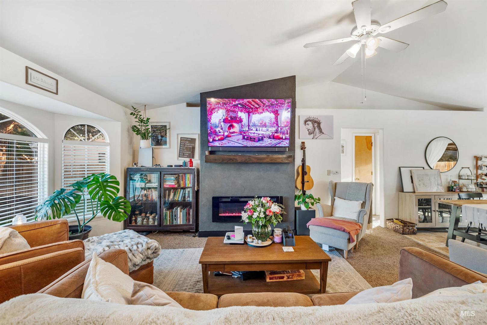 Beautiful Single-Level Home with Split Bedroom Design and Vaulted Ceilings! This move-in ready home offers a spacious open floorplan with a desirable split-bedroom layout for added privacy. Enjoy the airy feel of vaulted ceilings throughout the main living areas and a cozy electric fireplace that adds warmth and charm. The newly painted kitchen cabinets complement the newer stainless-steel appliances, including a gas range, pantry, and center island with breakfast bar—perfect for entertaining or casual meals. Step outside to a large, fully fenced yard with mature trees, offering both shade and privacy. The newer concrete driveway provides potential RV parking, and the roof has been recently replaced for added peace of mind. Located near schools with low HOA dues, this home combines comfort, convenience, and value.
