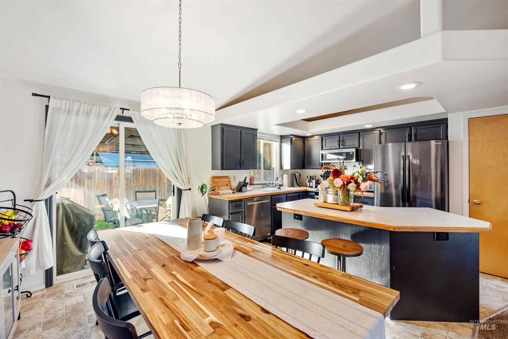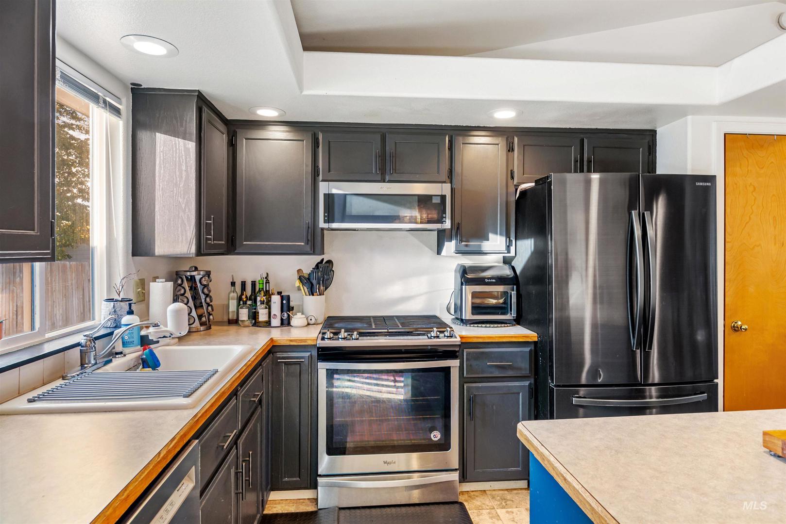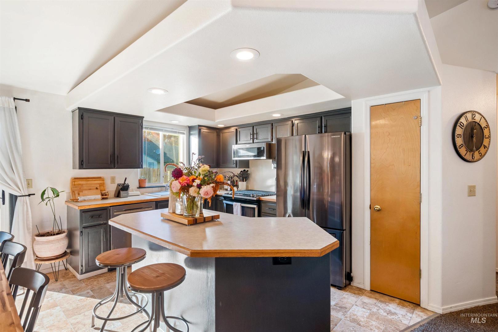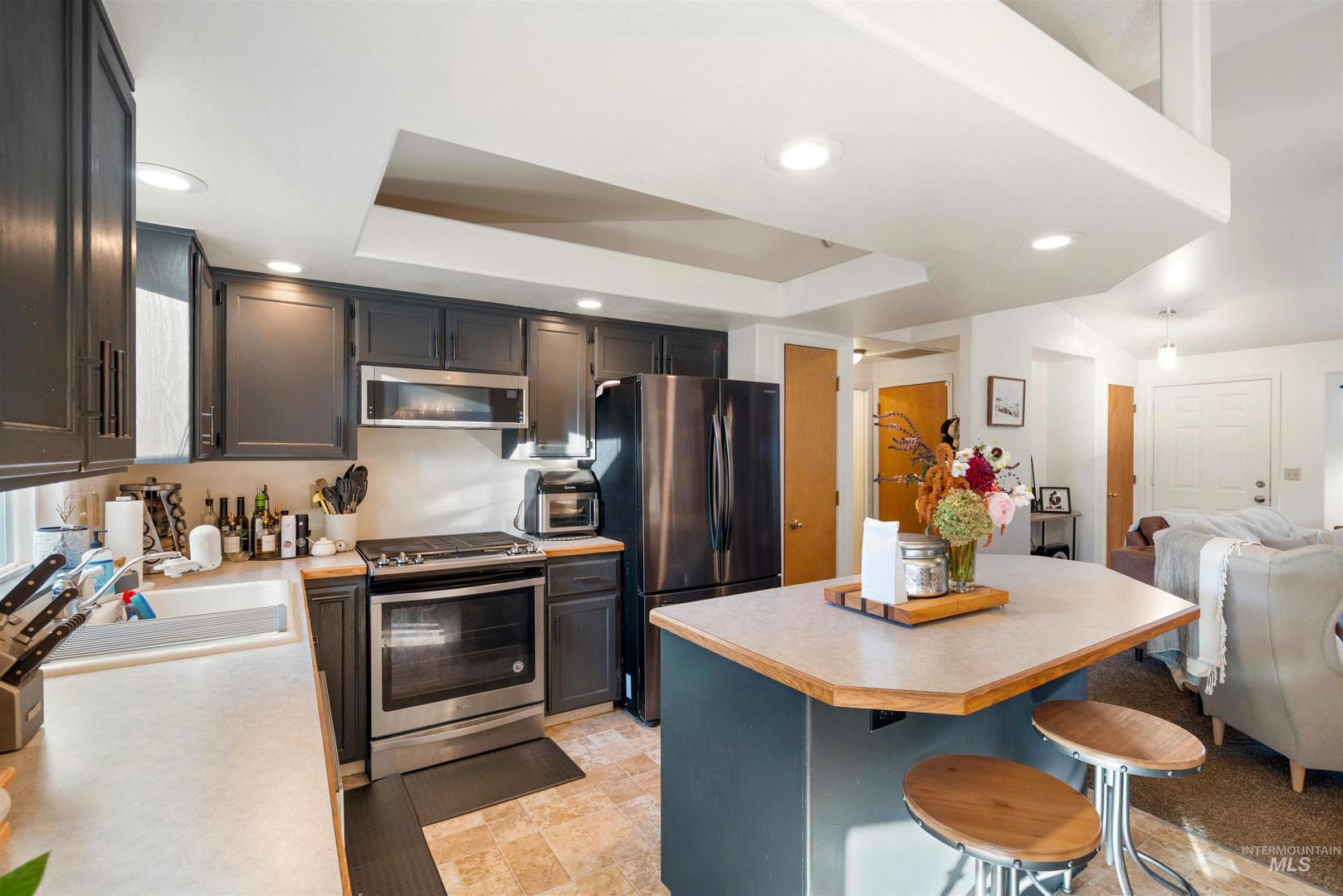 Beautiful Single-Level Home with Split Bedroom Design and Vaulted Ceilings! This move-in ready home offers a spacious open floorplan with a desirable split-bedroom layout for added privacy. Enjoy the airy feel of vaulted ceilings throughout the main living areas and a cozy electric fireplace that adds warmth and charm. The newly painted kitchen cabinets complement the newer stainless-steel appliances, including a gas range, pantry, and center island with breakfast bar—perfect for entertaining or casual meals. Step outside to a large, fully fenced yard with mature trees, offering both shade and privacy. The newer concrete driveway provides potential RV parking, and the roof has been recently replaced for added peace of mind. Located near schools with low HOA dues, this home combines comfort, convenience, and value.