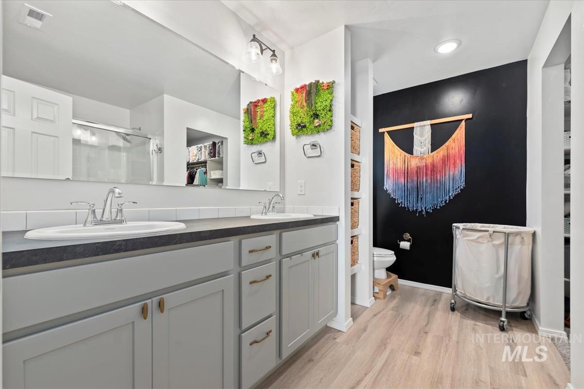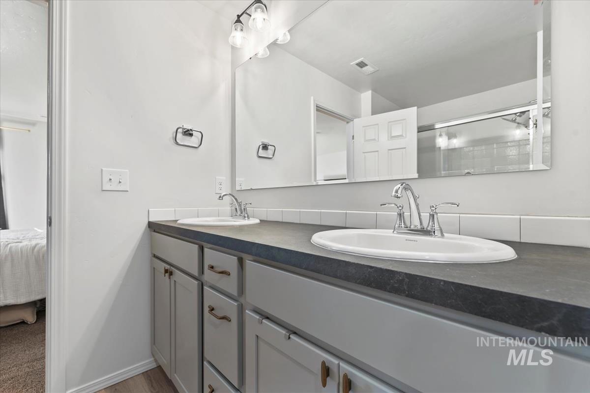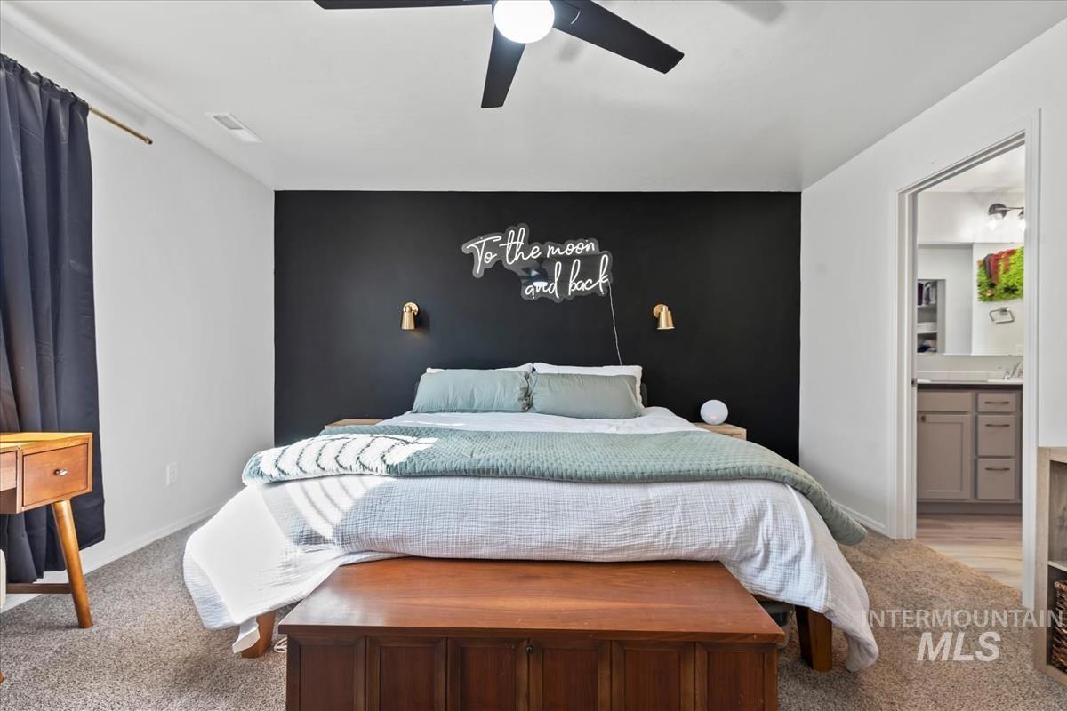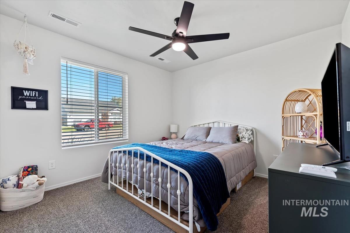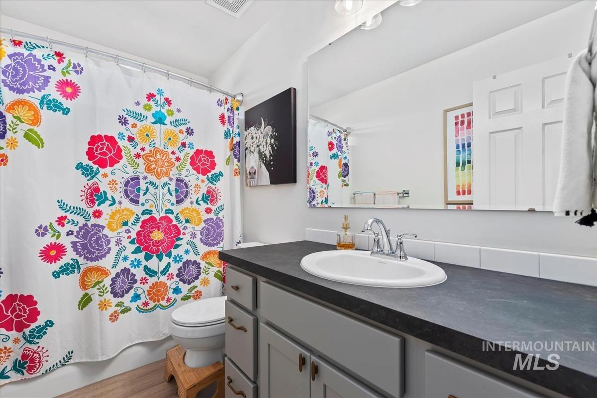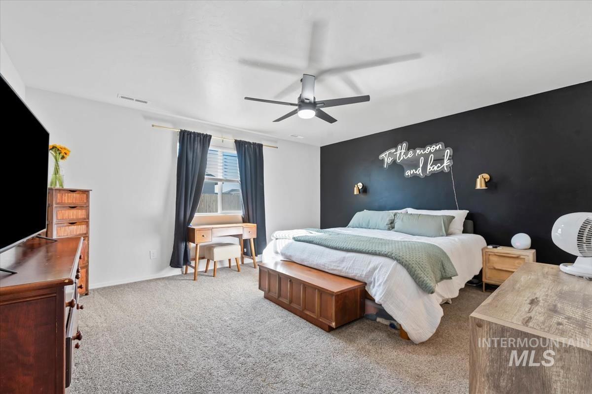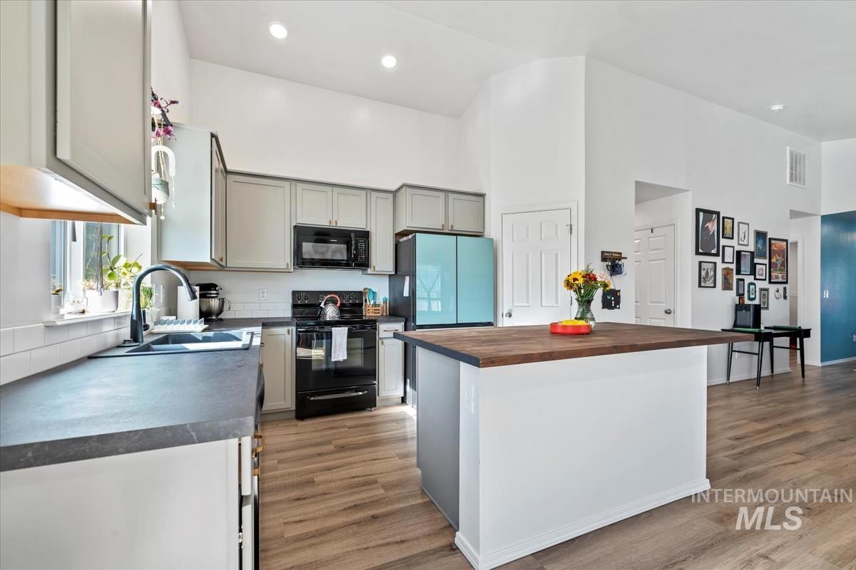 Welcome to this stunning 4-bedroom, 2-bath home perfectly situated on a corner lot near a cul-de-sac. Featuring vaulted ceilings and an open-concept floor plan, this home offers both comfort and style. The kitchen boasts a beautifully accented upgraded wooden countertop island, upgraded light fixtures throughout, upgraded kitchen pulls and plenty of space for entertaining. The primary suite includes a large walk-in closet with built-in shelving, and the ensuite bathroom offers dual sinks and a spacious vanity. Enjoy the outdoors in your fully fenced backyard, perfect for gatherings, pets, or simply relaxing in privacy. Additional features include a three-car garage and breathtaking mountain views—all while being tucked away from highway noise. Conveniently located within city limits, this home is just a quick 15-minute drive to MHAFB, close to shopping, and only 10 minutes from I-84. Don’t miss your chance to call this gorgeous property home!