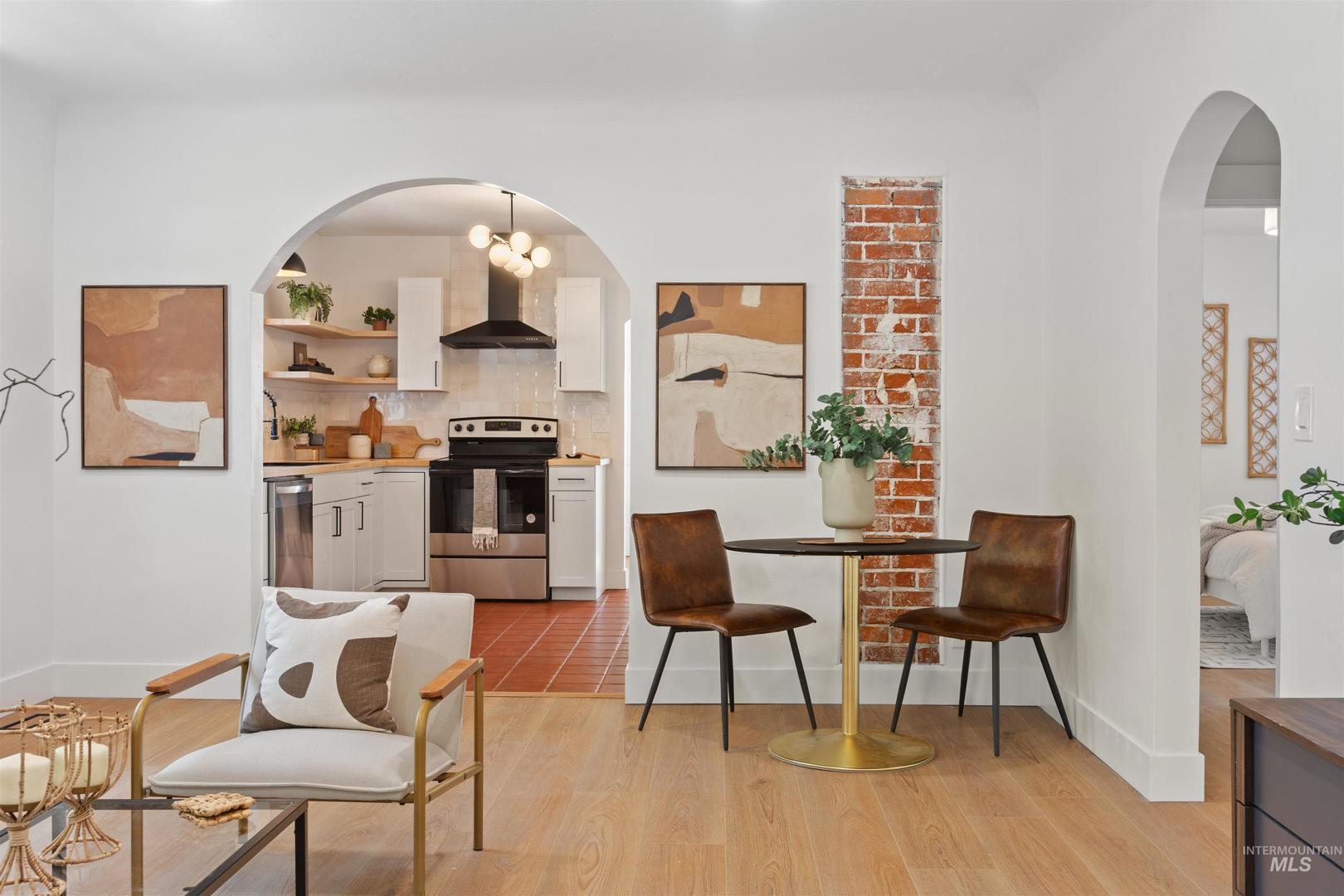 This beautifully remodeled bungalow captures the warmth of its era while offering the comfort and style of a modern home. Step inside to find sunlit spaces that highlight graceful arched doorways, charming built-ins, and touches of exposed brick. The layout flows effortlessly, with generous living areas and a spacious downstairs bonus room perfect for gathering or relaxing. A stylish new kitchen and updated bathrooms complement the home’s character, while a brand-new roof, HVAC, and detached two-car garage provide peace of mind. Outside, the zero-scaped front and back yards create a low-maintenance space. Set in a quiet, established neighborhood, this home is just a short stroll to Idaho’s largest private school and the dining, shopping, and community energy of downtown Meridian. Every detail has been thoughtfully completed, allowing you to simply move in and enjoy.