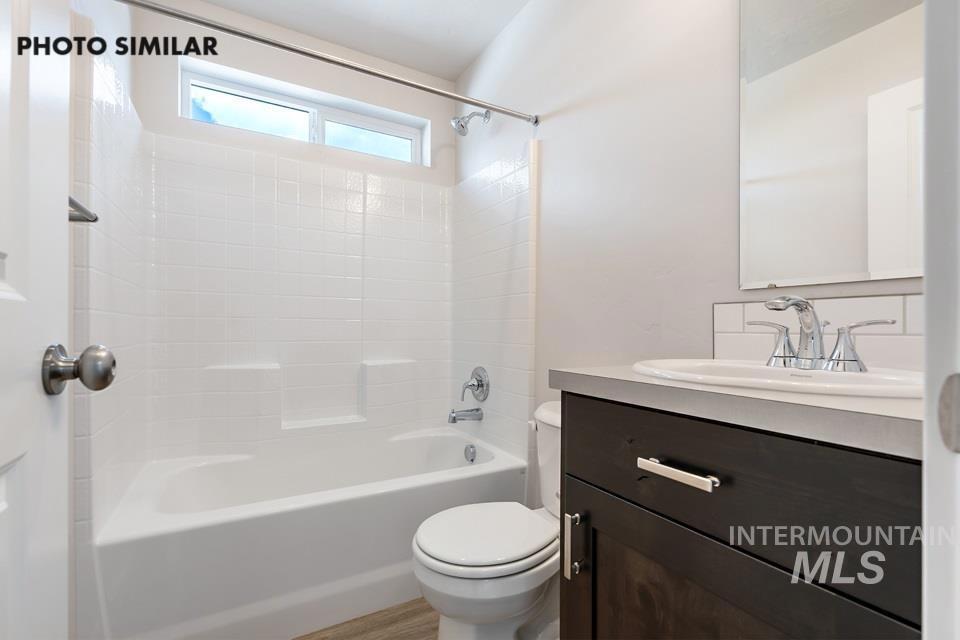 Welcome to the Chamberlain floor plan. This beautiful home is located in Emmett in the Dagger Falls Subdivision. Split floor plan featuring 3 bedroom and 2 bathrooms with 2 car garage. You`ll love the open concept that boasts a spacious kitchen with a large corner pantry, quartz countertops, a full-tile backsplash, custom cabinetry, stainless steel appliances, and a breakfast bar for additional seating and workspace. LVP flooring runs through high-traffic areas of the home for easy maintenance. The great room is designed for an open, grand feel with vaulted ceilings carrying into the living and dining areas. The 14x12 master bedroom has a generous walk-in closet, a master bathroom that has a step-in shower with glass doors, and a double vanity. Outside will include front and back sod, full automatic sprinklers, pressurized irrigation, and full gutters. Also includes low cost natural gas. Call for your private showing today! This home has an estimated completion date of 01-/23/26. ***Photos are Similar***