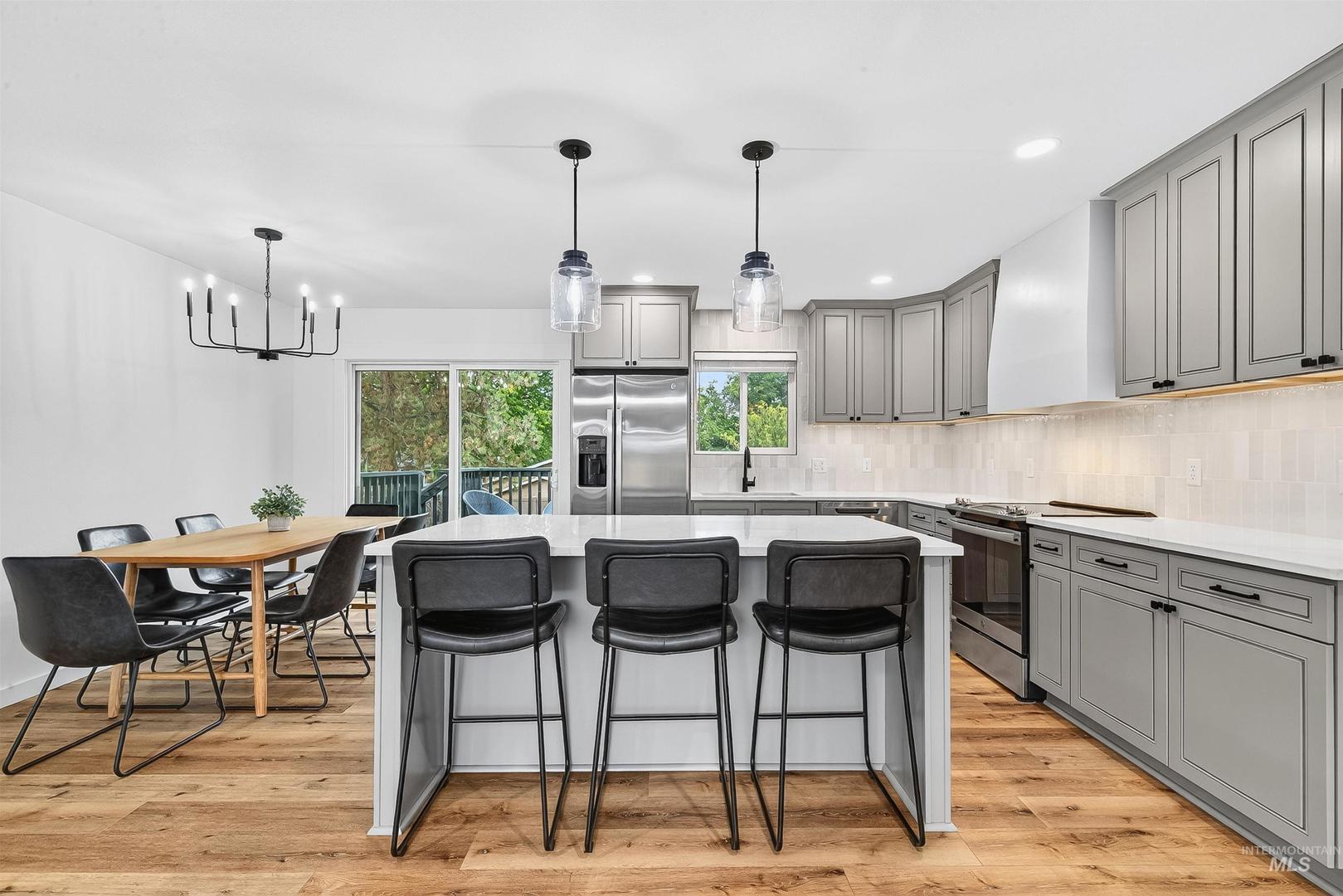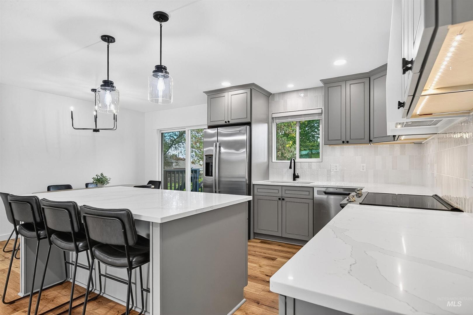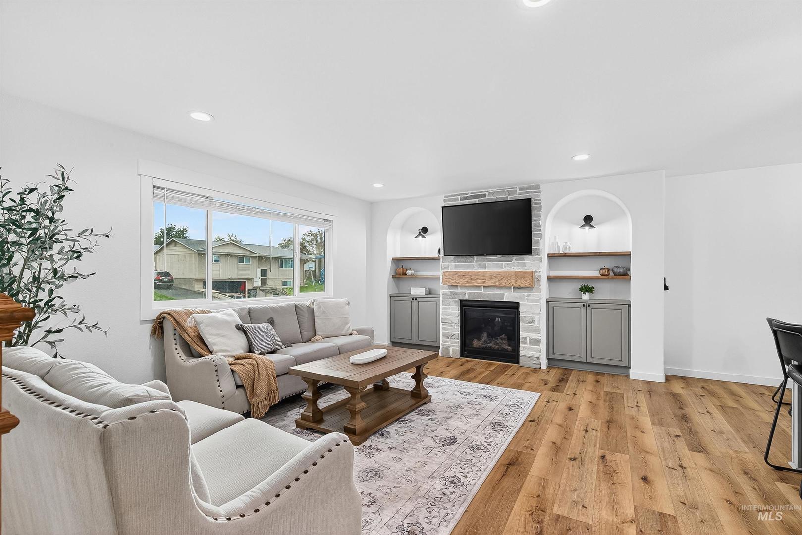 Tucked away on a quiet cul-de-sac, this four-bedroom, two-bath home has been completely reimagined from top to bottom. Every detail reflects thoughtful design, from the quartz countertops and custom tile backsplash to the rich plank flooring and stacked-stone gas fireplace framed by arched built-in bookshelves. The open living space balances modern finishes with warmth and character, creating a setting that feels both fresh and inviting. Downstairs, the fully finished basement expands your living options with a spacious family room, office or flex space, plus a convenient laundry room with direct access to the backyard. A dedicated two-car garage, BRAND NEW SPRINKLER SYSTEM, and extra space for a future shop. Outside, the quiet setting offers room to relax, unwind, and enjoy life at your own pace! Proof that when style meets vision, the results speak for themselves. Agent/Owner