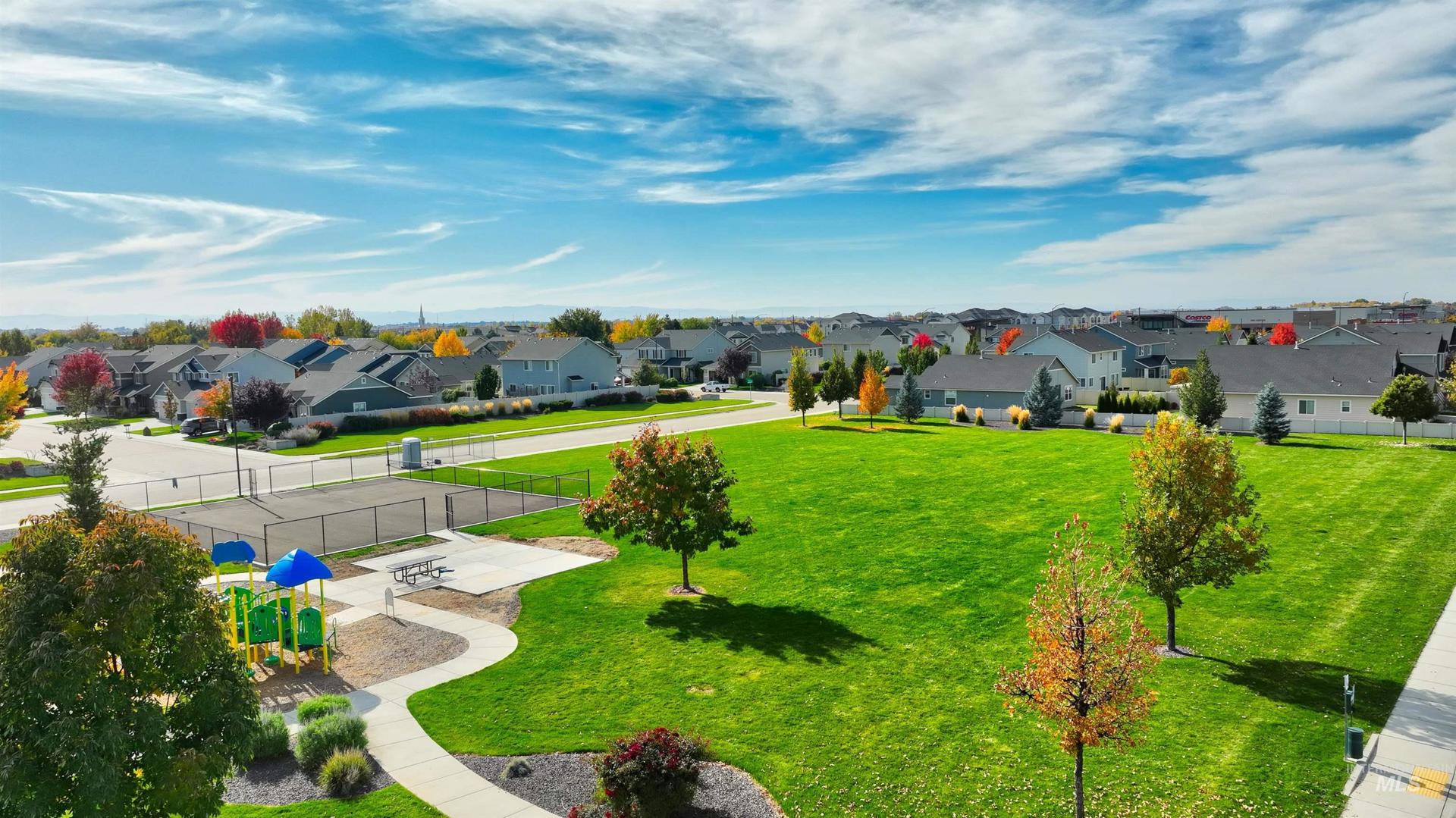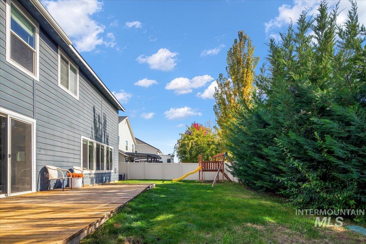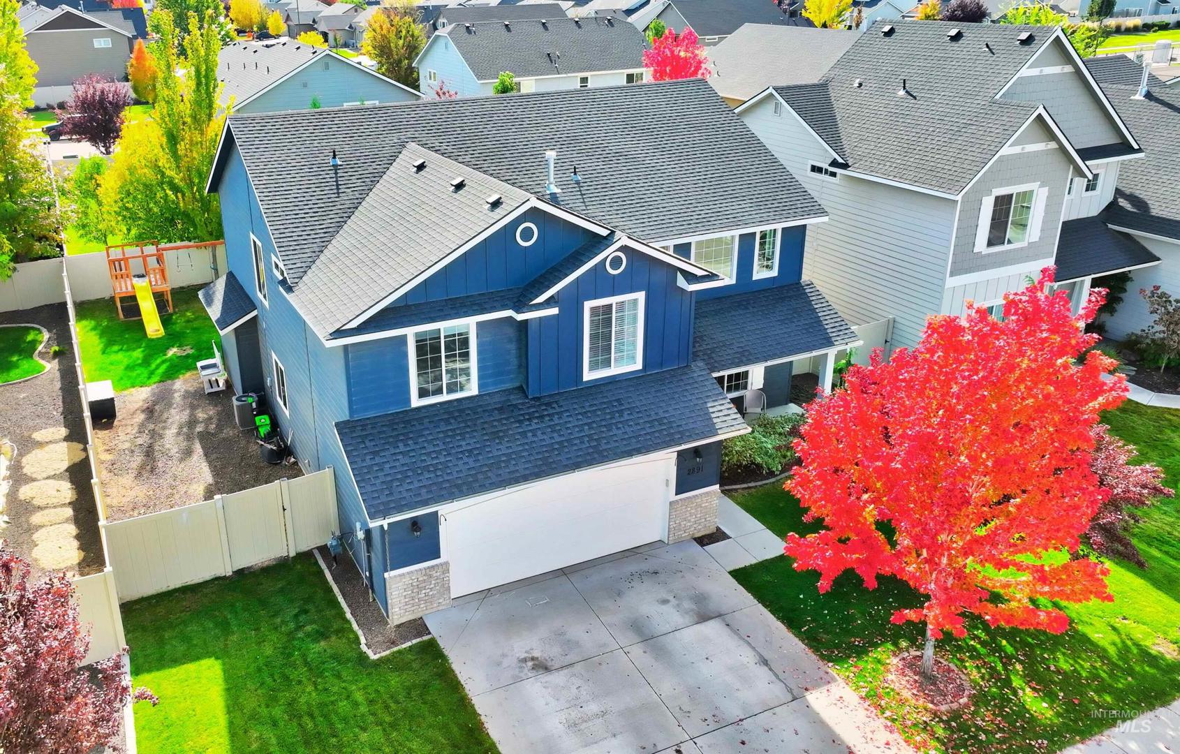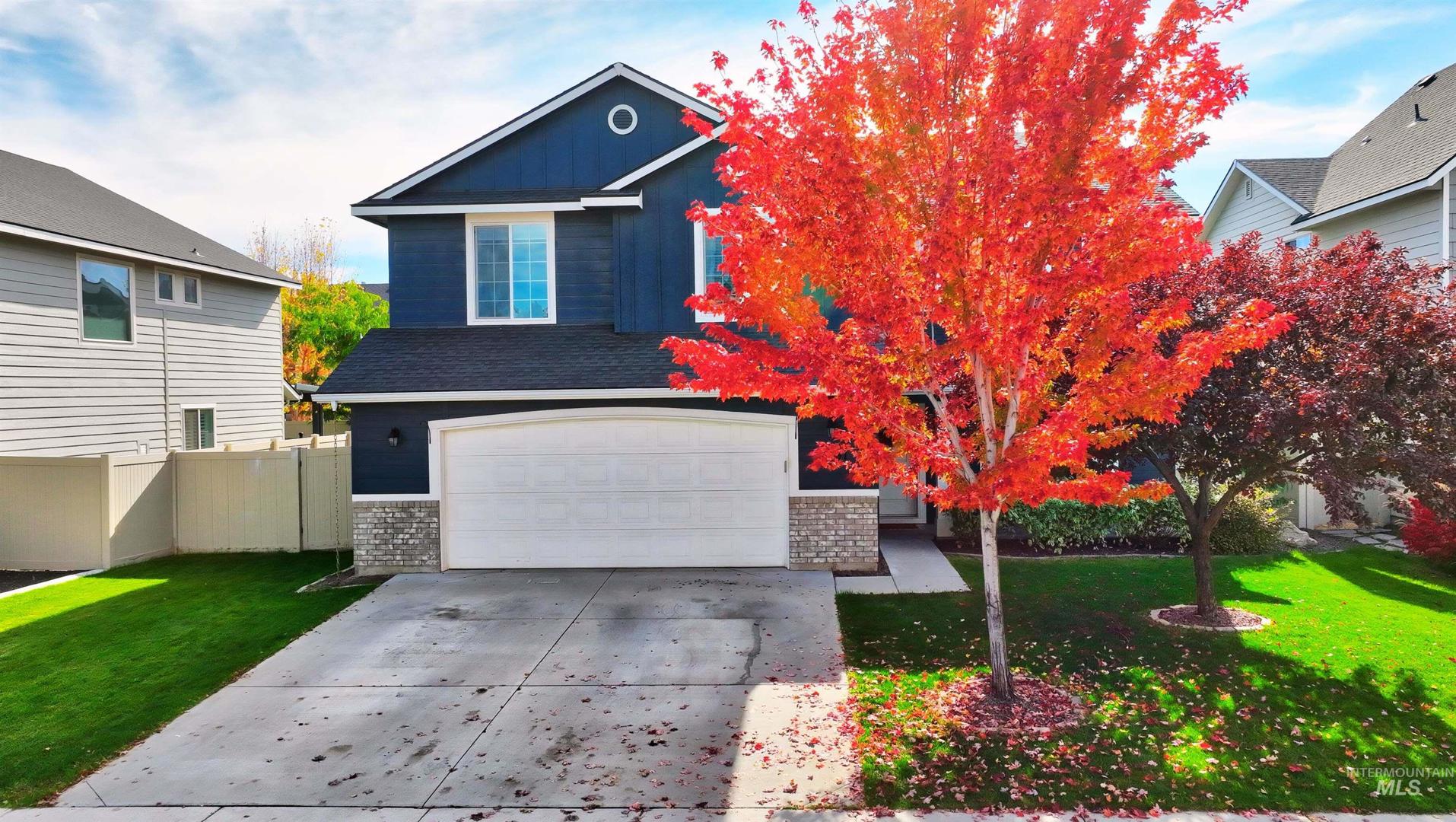 Welcome to this charming 4 bed, 2.5 bath home in this centrally located Meridian neighborhood. Built in 2018, this home perfectly blends comfort, modern style, and community living. As you enter, experience a bright and open two-story entry that flows into a spacious living area with laminate floors, a cozy fireplace, and large windows that fill the home with natural light. The kitchen features white cabinets, a large pantry, kitchen island and overlooks the inviting family room, ideal for entertaining or relaxed evenings at home. A convenient main-level bedroom offers flexibility for guests or a home office. Upstairs, you’ll find additional bedrooms, a loft and a comfortable primary suite, giving everyone their own space. Enjoy the outdoors on your welcoming front porch with gorgeous trees that glow with color in the fall or enjoy your private, mature backyard with deck and play structure. Located just down from the community park with pickleball courts, a playground, and a new splash pad coming next summer, this home offers the perfect balance of recreation and relaxation.