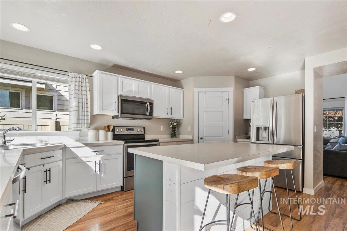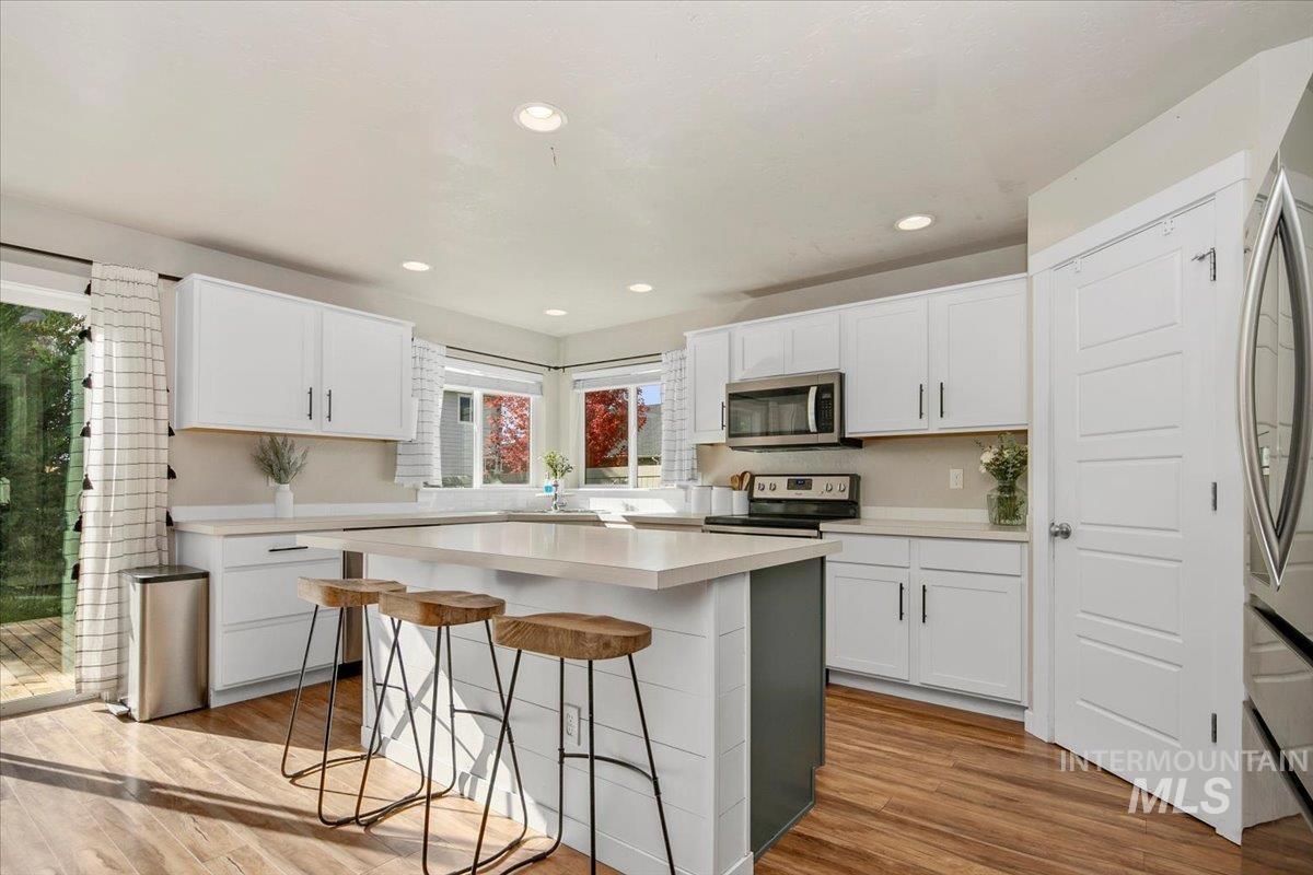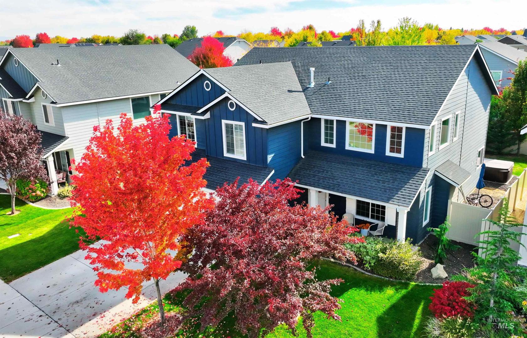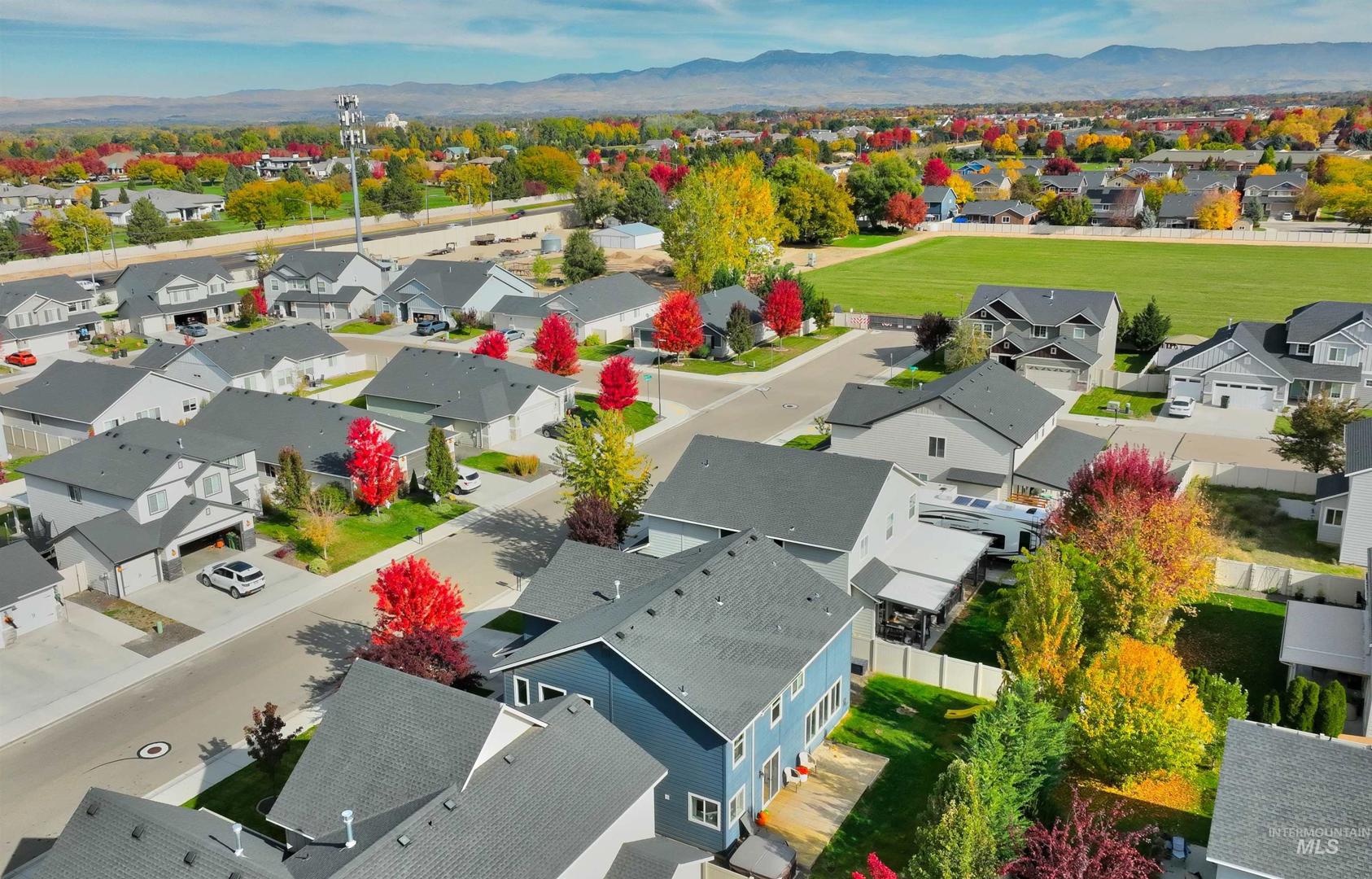 Welcome to this charming 4 bed, 2.5 bath home in this centrally located Meridian neighborhood. Built in 2018, this home perfectly blends comfort, modern style, and community living. As you enter, experience a bright and open two-story entry that flows into a spacious living area with laminate floors, a cozy fireplace, and large windows that fill the home with natural light. The kitchen features white cabinets, a large pantry, kitchen island and overlooks the inviting family room, ideal for entertaining or relaxed evenings at home. A convenient main-level bedroom offers flexibility for guests or a home office. Upstairs, you’ll find additional bedrooms, a loft and a comfortable primary suite, giving everyone their own space. Enjoy the outdoors on your welcoming front porch with gorgeous trees that glow with color in the fall or enjoy your private, mature backyard with deck and play structure. Located just down from the community park with pickleball courts, a playground, and a new splash pad coming next summer, this home offers the perfect balance of recreation and relaxation.