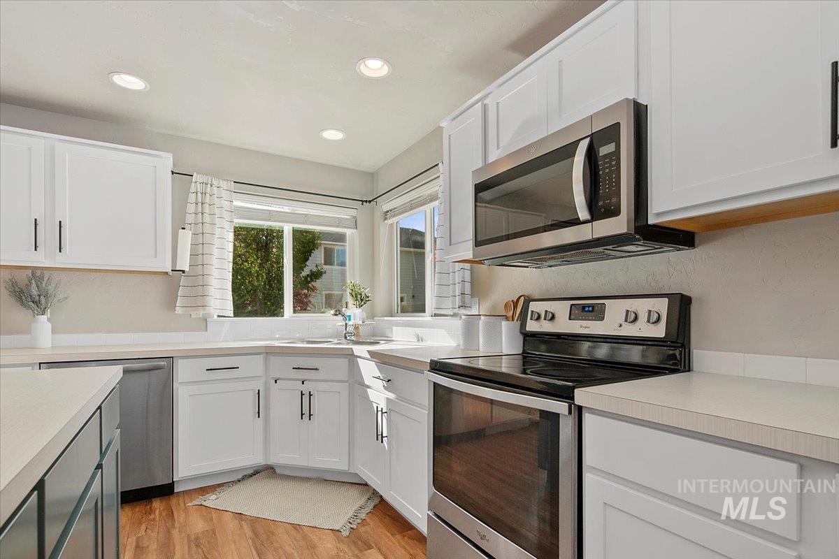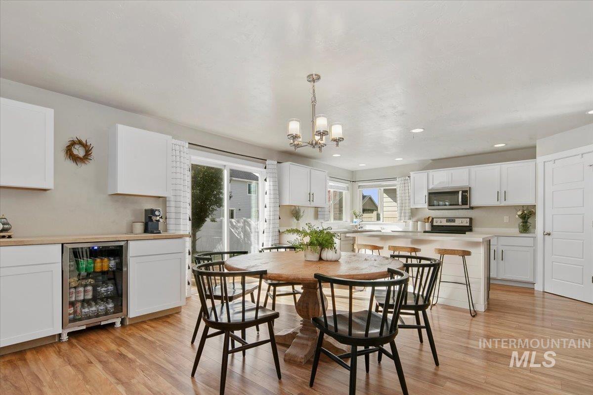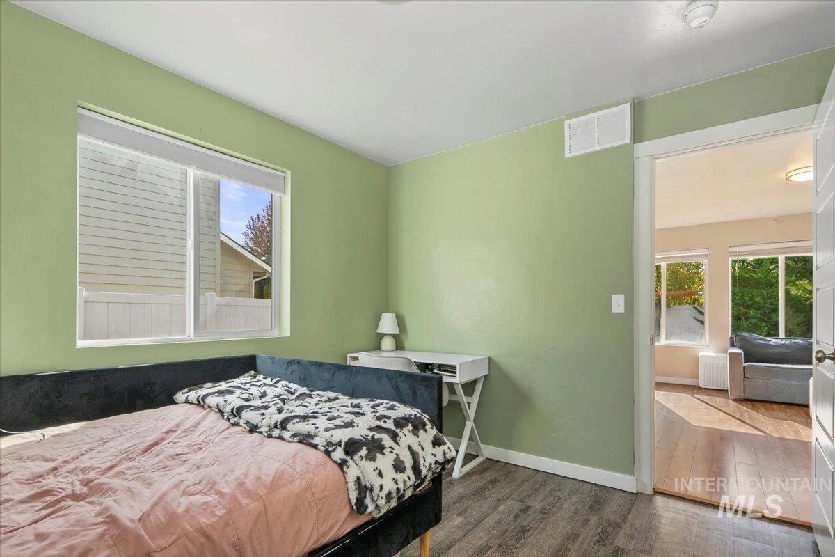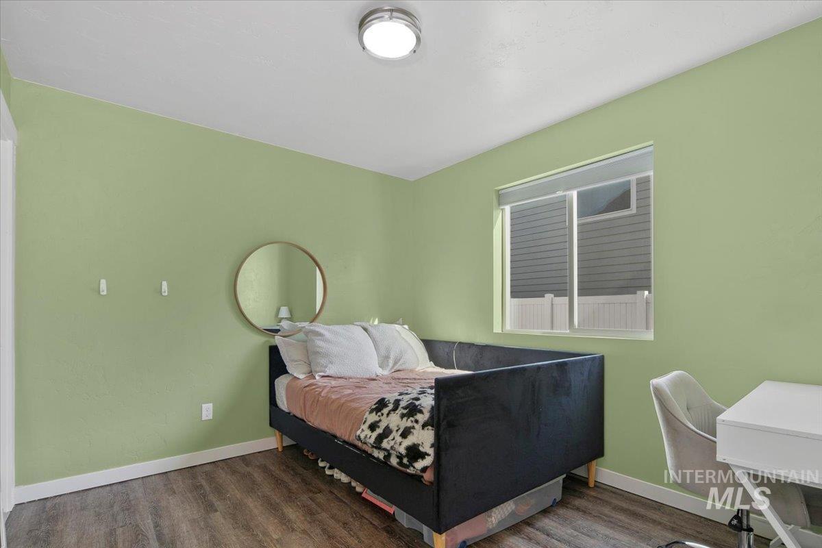 Welcome to this charming 4 bed, 2.5 bath home in this centrally located Meridian neighborhood. Built in 2018, this home perfectly blends comfort, modern style, and community living. As you enter, experience a bright and open two-story entry that flows into a spacious living area with laminate floors, a cozy fireplace, and large windows that fill the home with natural light. The kitchen features white cabinets, a large pantry, kitchen island and overlooks the inviting family room, ideal for entertaining or relaxed evenings at home. A convenient main-level bedroom offers flexibility for guests or a home office. Upstairs, you’ll find additional bedrooms, a loft and a comfortable primary suite, giving everyone their own space. Enjoy the outdoors on your welcoming front porch with gorgeous trees that glow with color in the fall or enjoy your private, mature backyard with deck and play structure. Located just down from the community park with pickleball courts, a playground, and a new splash pad coming next summer, this home offers the perfect balance of recreation and relaxation.