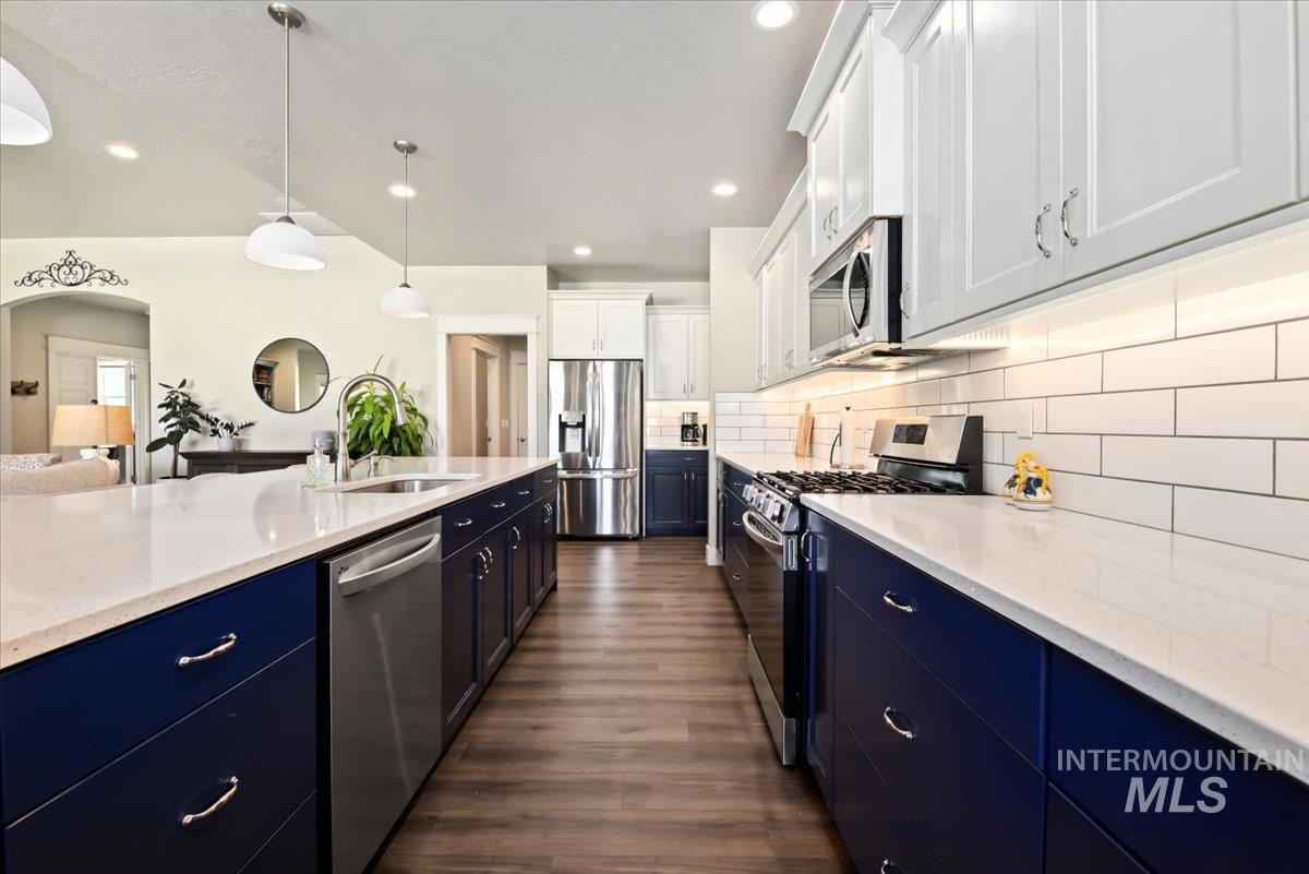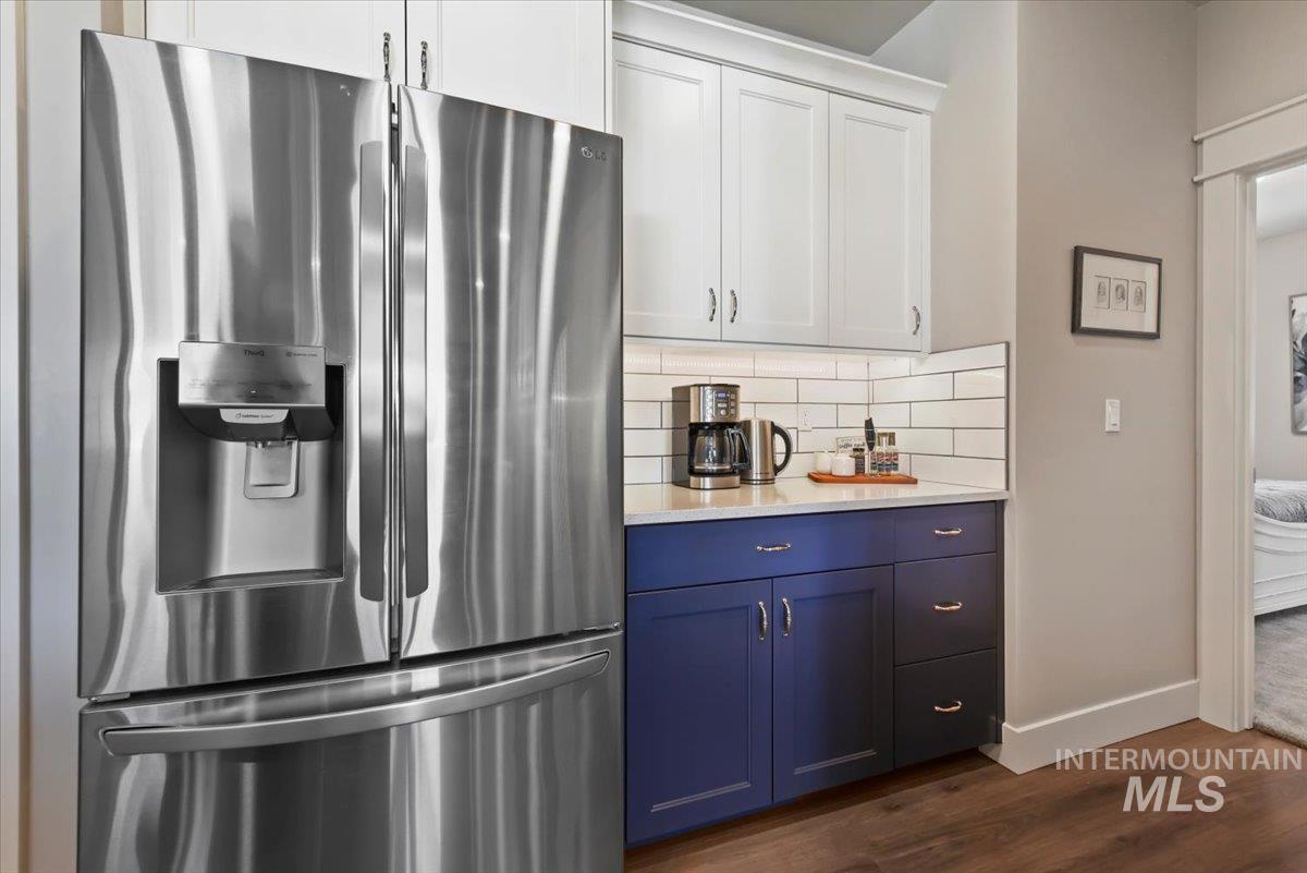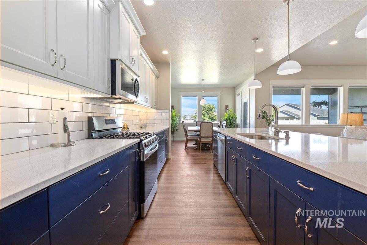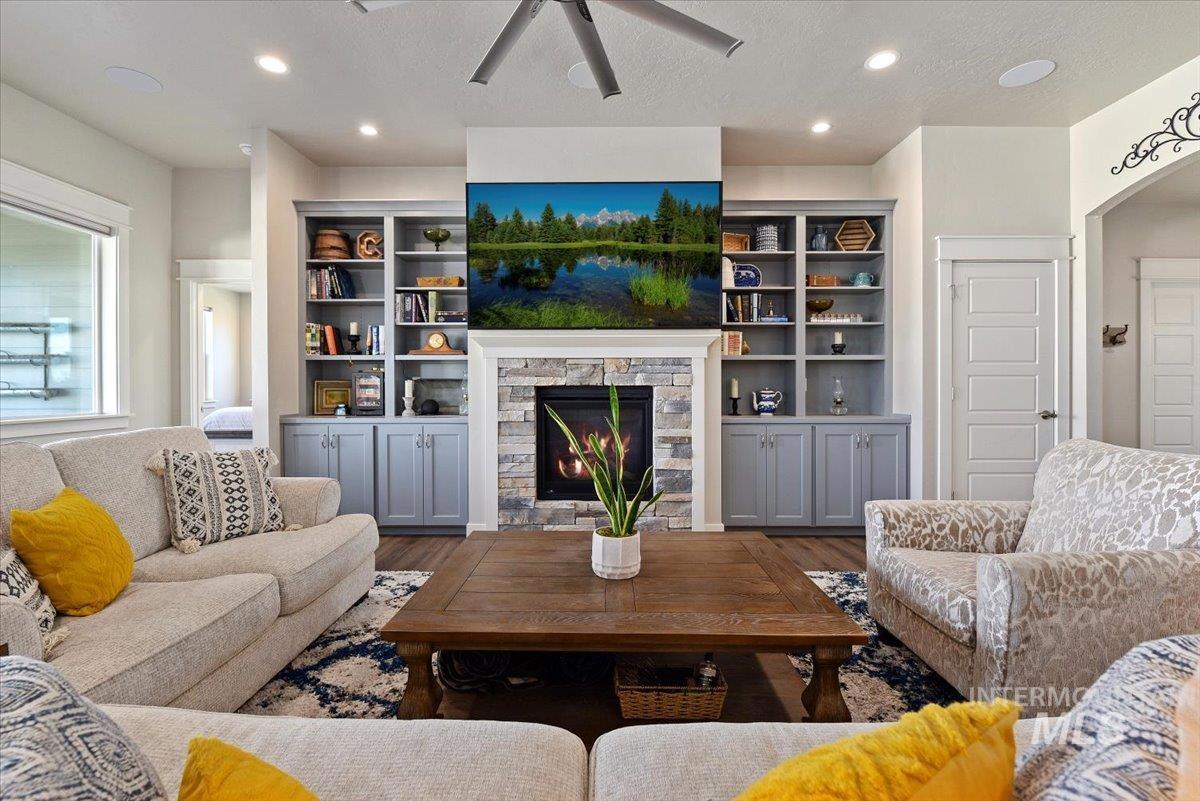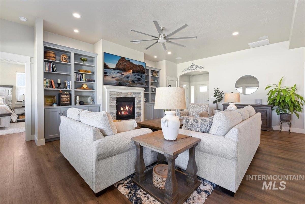 Beautiful, better than new single level residence set on a fully landscaped premier homesite offering privacy and no rear neighbors. You will love the spacious light and bright great room that is anchored by a stone gas fireplace with built-in bookcases, cabinetry and a prime built-in speaker system. Features include wide plank luxury vinyl flooring, 9’ and 10’ coffered ceilings throughout and plenty of windows with 11 automated window shades. The kitchen is a showstopper with an 11’ x 4’ island with sparkle white quartz countertops, white subway tile backsplash, sophisticated blue and grey cabinetry, coffee bar, gas stove top, LG refrigerator and don’t miss the large walk-in pantry. Enjoy the private primary suite with a spa-like bathroom with an extra deep soaker tub, fully tiled 6’ x 4’ shower and spacious walk-in closet. Wonderful split bedroom design with double door Jack and Jill bathroom. 4th bedroom could be a great office with closet and double doors. Laundry room includes sink, cabinetry and Samsung washer and dryer. Backyard is private and has covered patio with extended stamped concrete, built-in bench seating, raised garden beds, drip lines, 220v and gas line hookup. Extra-long garage with one bay at 28’ to accommodate your pickup!