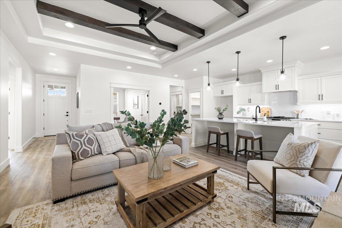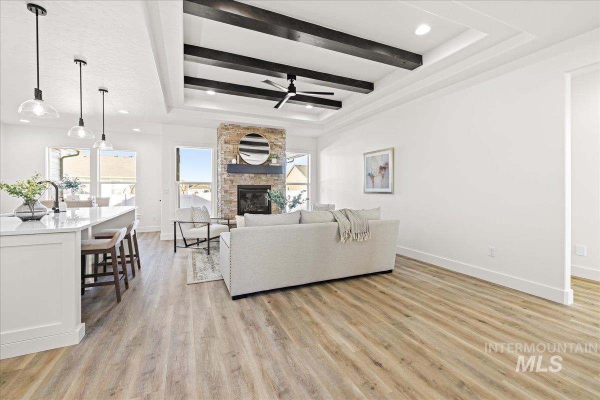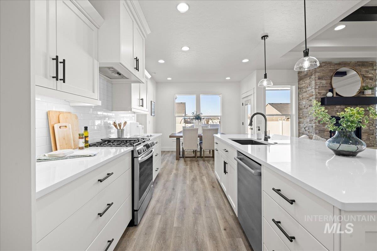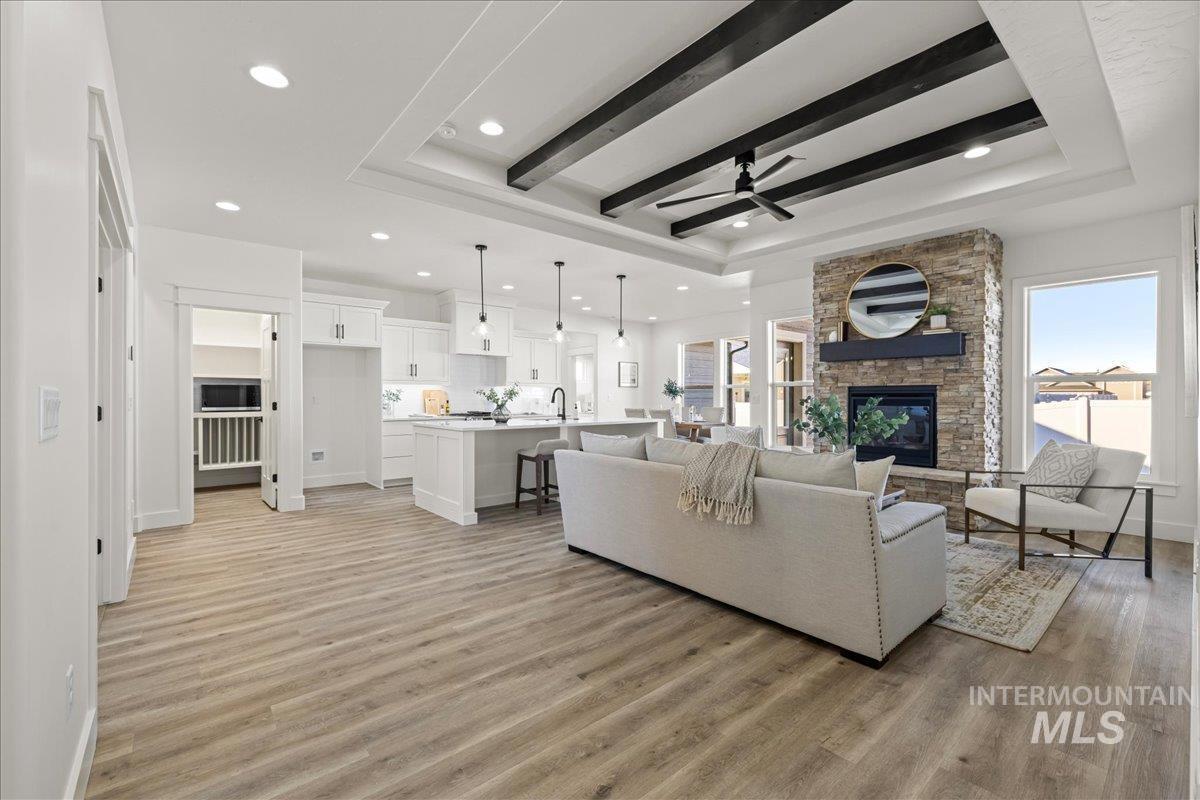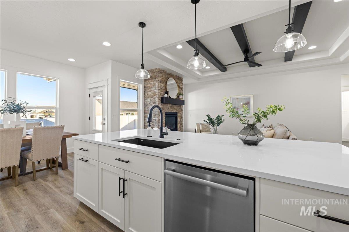 The Denali by Sunrise Home. This efficient single level home has a spacious open concept perfect for entertaining. Enjoy the open great room detailed with a 10 foot coffered ceilings with beams & large windows to provide abundant natural light to flow throughout the main living areas. The split bedroom design features 3 bedrooms and a large office space. In the kitchen you will find custom cabinetry with ample storage & counter space, quartz countertops, a full-tiled backsplash, stainless steel appliances and a large walk in pantry. The primary suite boasts dual vanities and custom tiled walk in shower. Come store all your toys in the large 42 foot deep RV bay. You`ll come to love using nearly 1000 sq ft of garage space. Outside you will get full landscaping front and back with automated sprinkler systems. This home is located in Emmett in the new Dagger Falls Subdivision. Photos are similar/not the actual home.