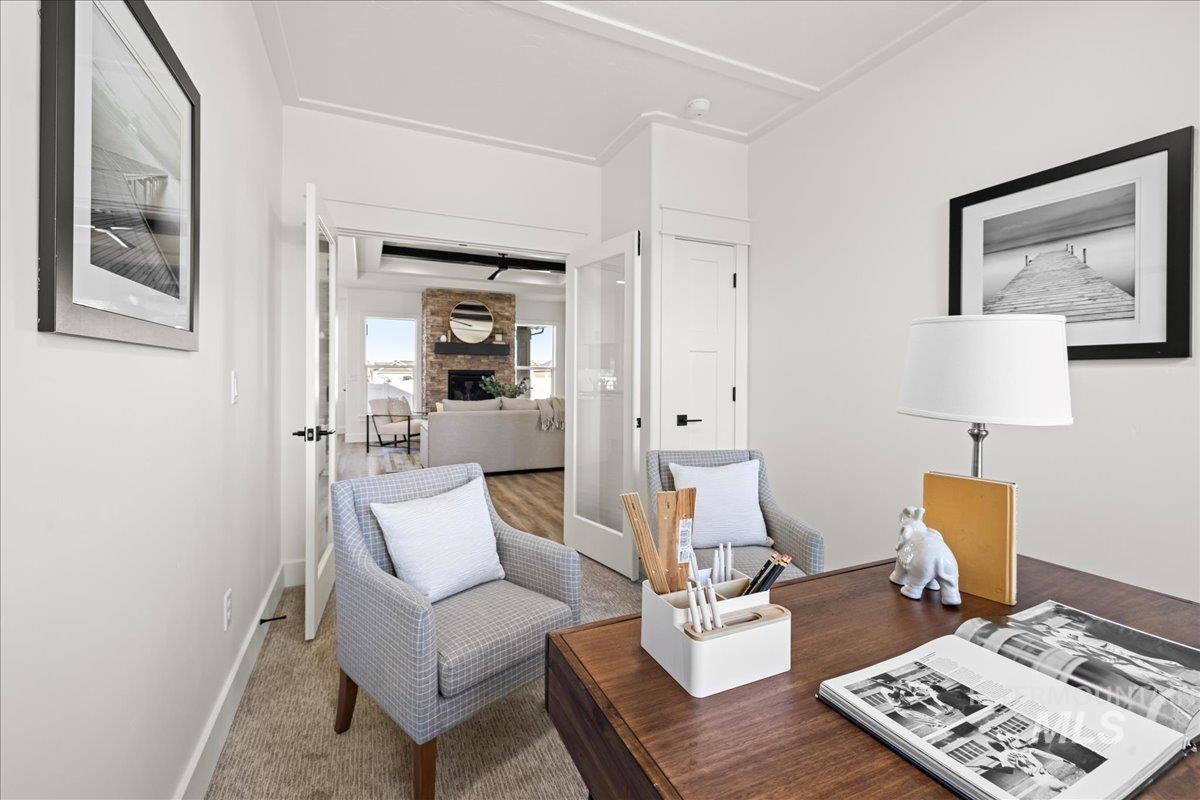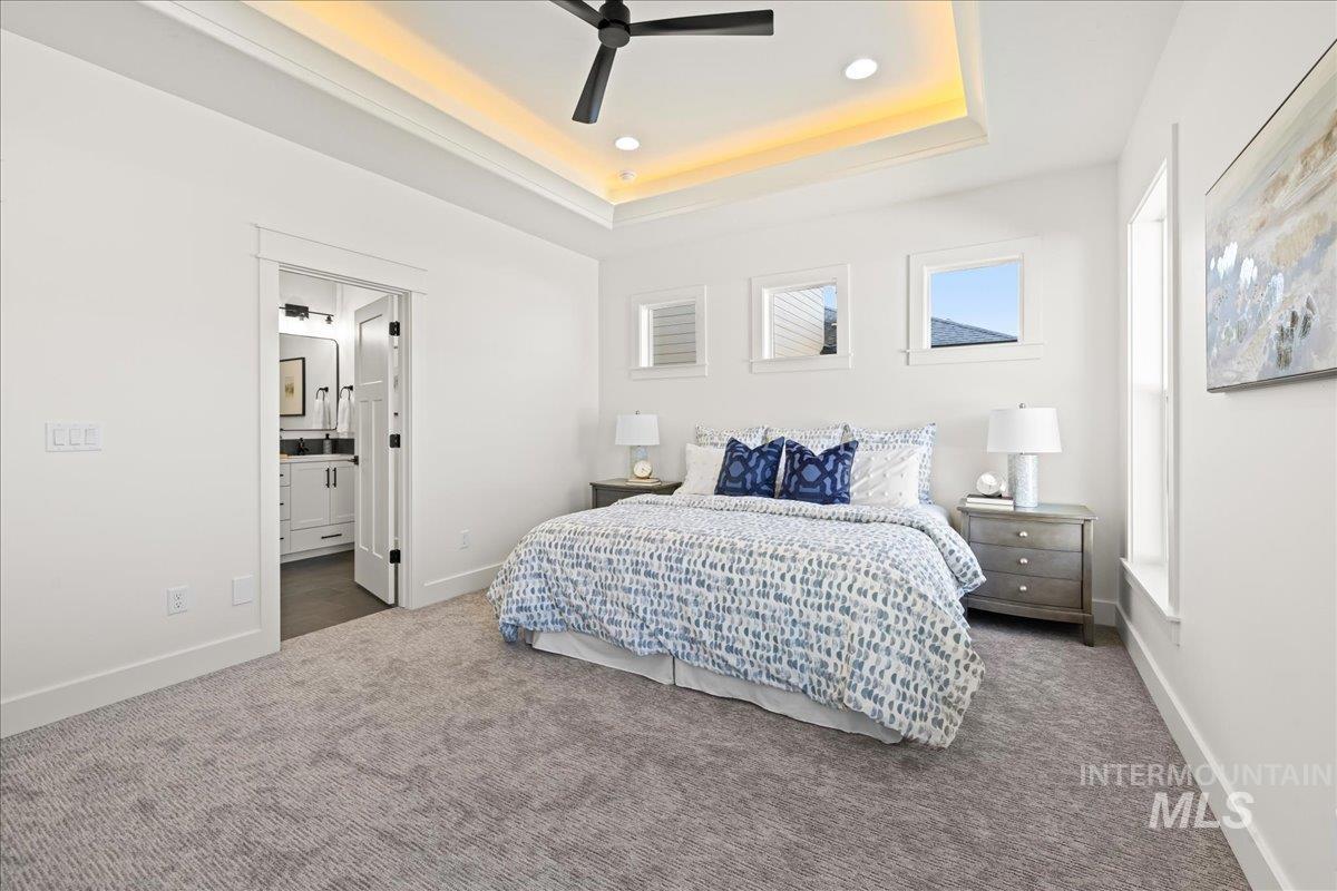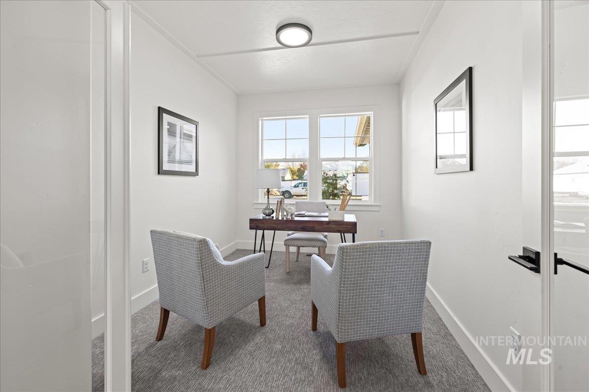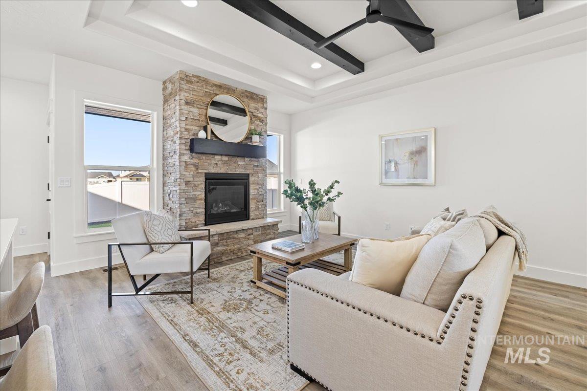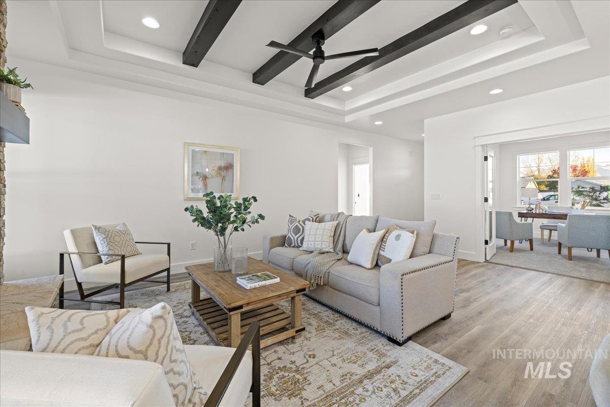 The Denali by Sunrise Home. This efficient single level home has a spacious open concept perfect for entertaining. Enjoy the open great room detailed with a 10 foot coffered ceilings with beams & large windows to provide abundant natural light to flow throughout the main living areas. The split bedroom design features 3 bedrooms and a large office space. In the kitchen you will find custom cabinetry with ample storage & counter space, quartz countertops, a full-tiled backsplash, stainless steel appliances and a large walk in pantry. The primary suite boasts dual vanities and custom tiled walk in shower. Come store all your toys in the large 42 foot deep RV bay. You`ll come to love using nearly 1000 sq ft of garage space. Outside you will get full landscaping front and back with automated sprinkler systems. This home is located in Emmett in the new Dagger Falls Subdivision. Photos are similar/not the actual home.