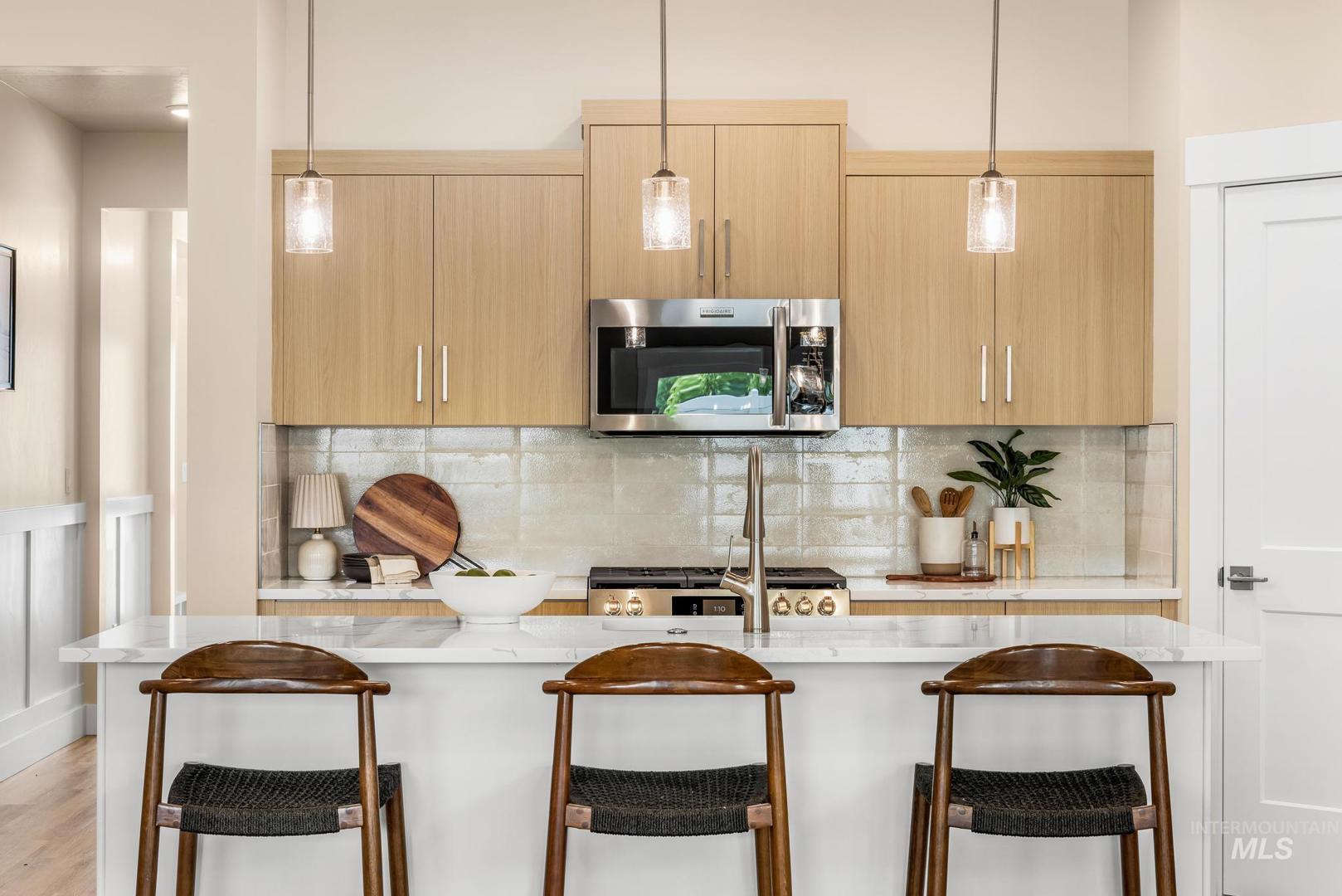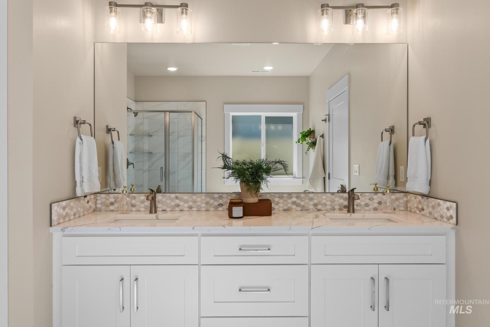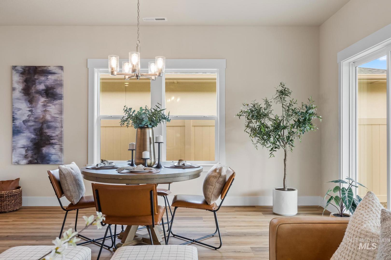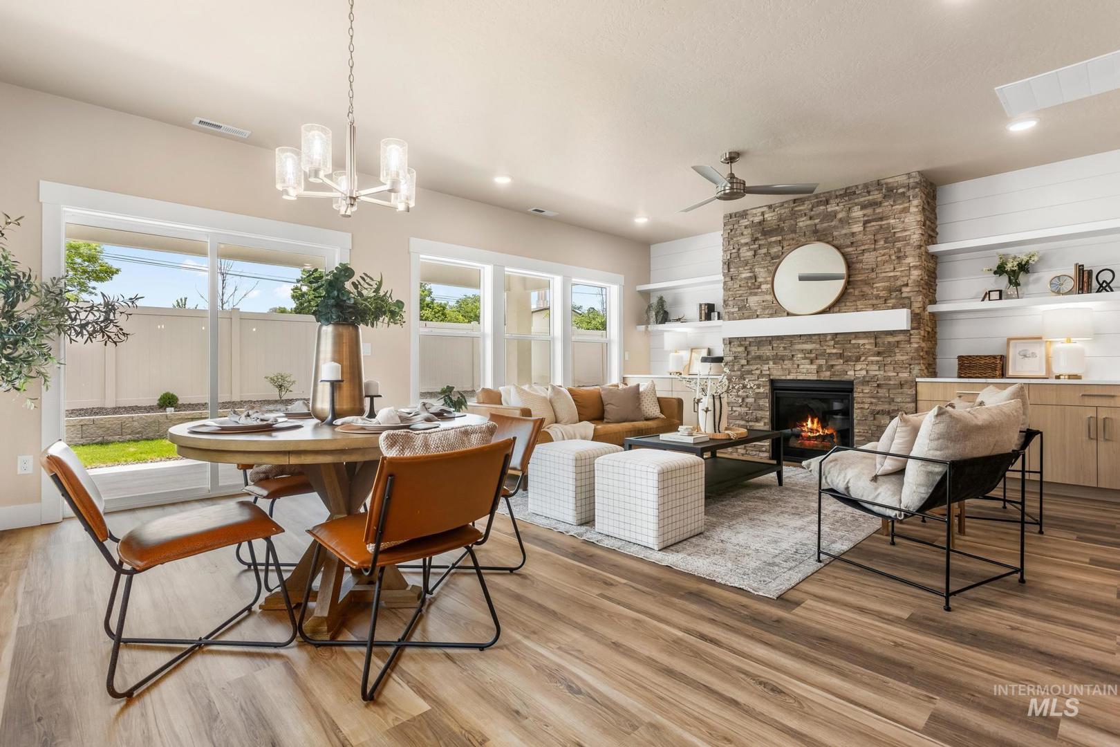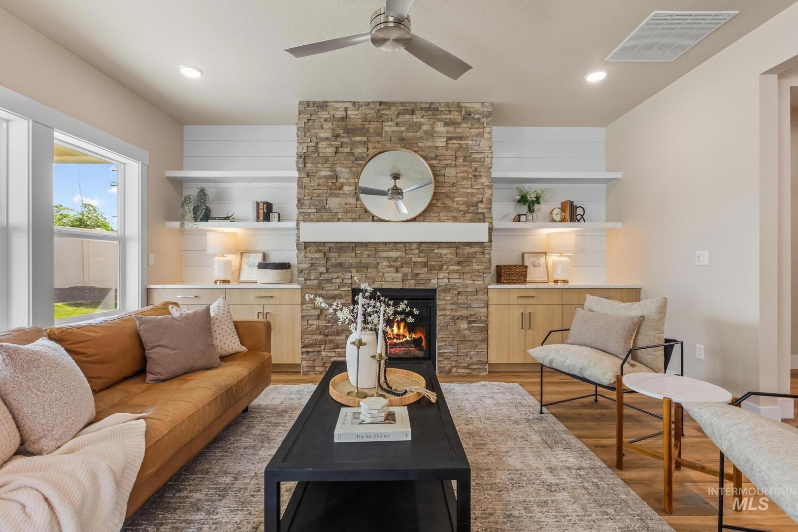 PRICED TO MOVE — NOW AT $508,900! Discover comfort and sophistication in this beautifully crafted 3-bedroom, 2-bath home featuring an open-concept design that’s perfect for modern living. The gourmet kitchen showcases quartz countertops, a gas range, stainless-steel appliances, and luxury vinyl plank flooring, flowing seamlessly into a bright living area with a cozy fireplace and custom built-ins—ideal for relaxing or entertaining guests. The two guest bedrooms share a spacious full bath with quartz counters, a tiled shower/tub combo, and designer tile flooring. Retreat to the private primary suite with dual vanities, a fully tiled step-in shower, and quartz finishes throughout. Natural light pours through large windows, highlighting the detailed trim and high-end craftsmanship in every corner. Enjoy low-maintenance living with HOA-provided front and back lawn care! Conveniently located near freeway access, Albertsons Marketplace, the YMCA, and Meridian’s top shopping, dining, and entertainment options—this home offers both luxury and location. Schedule your showing today!