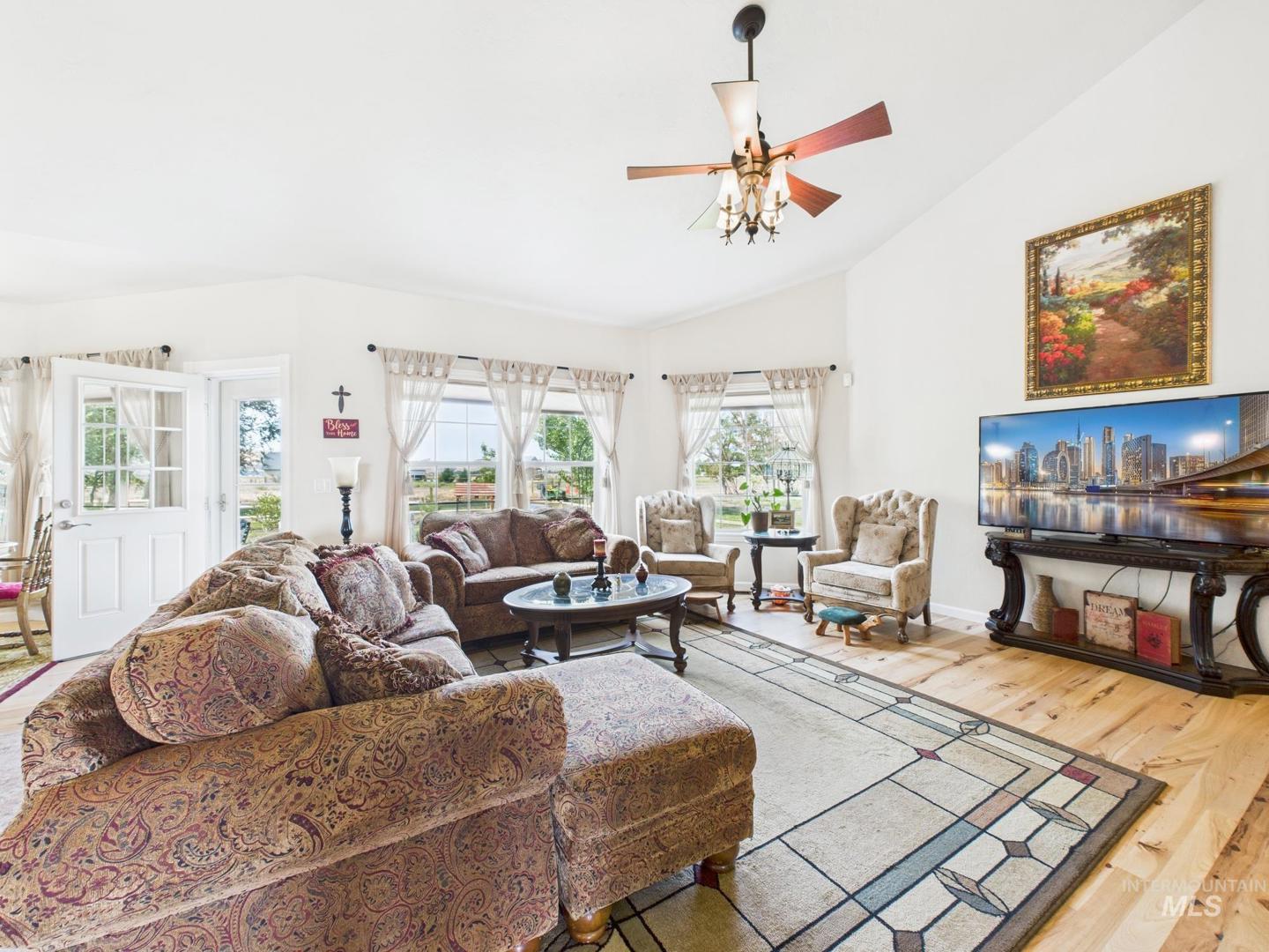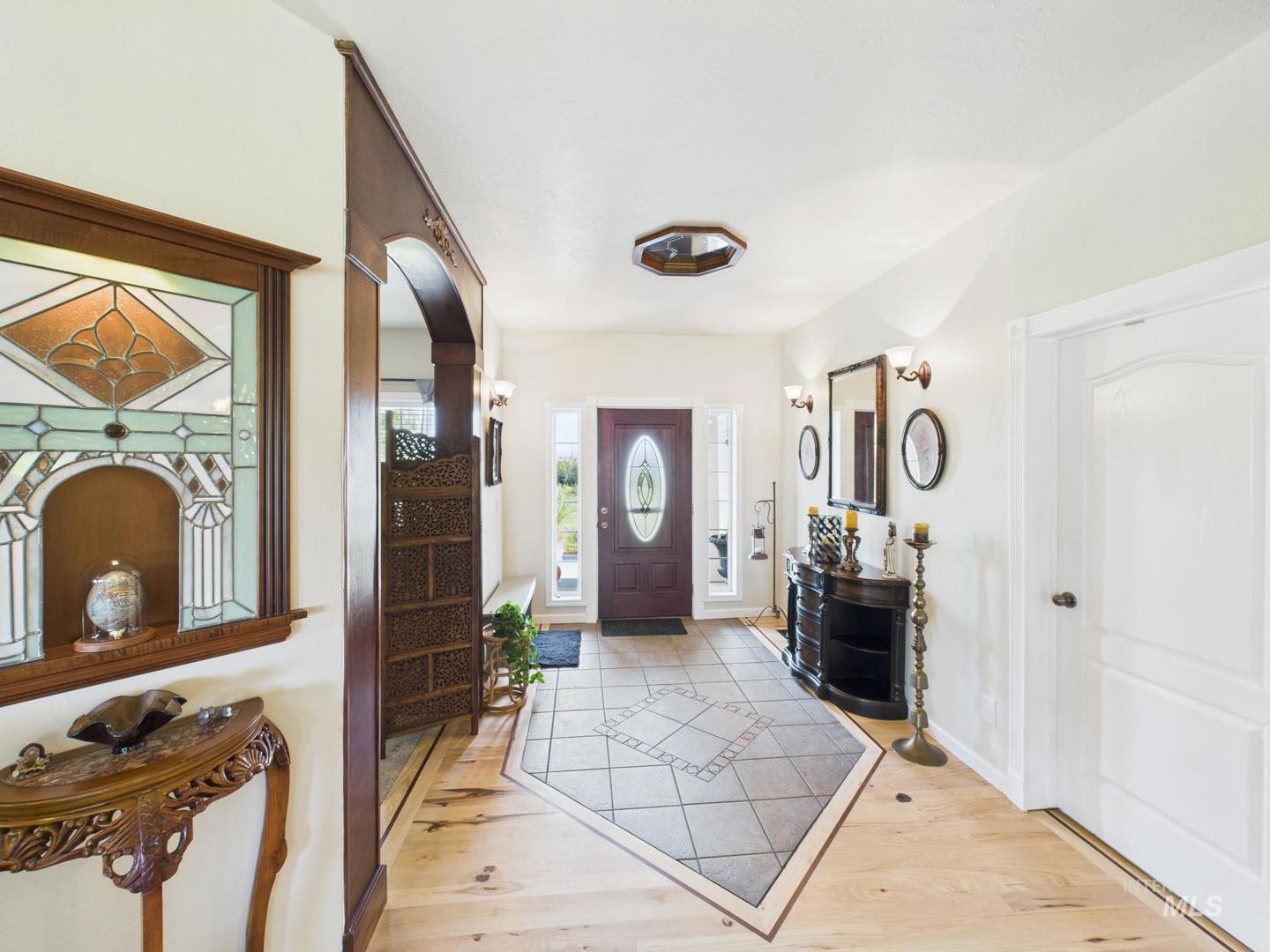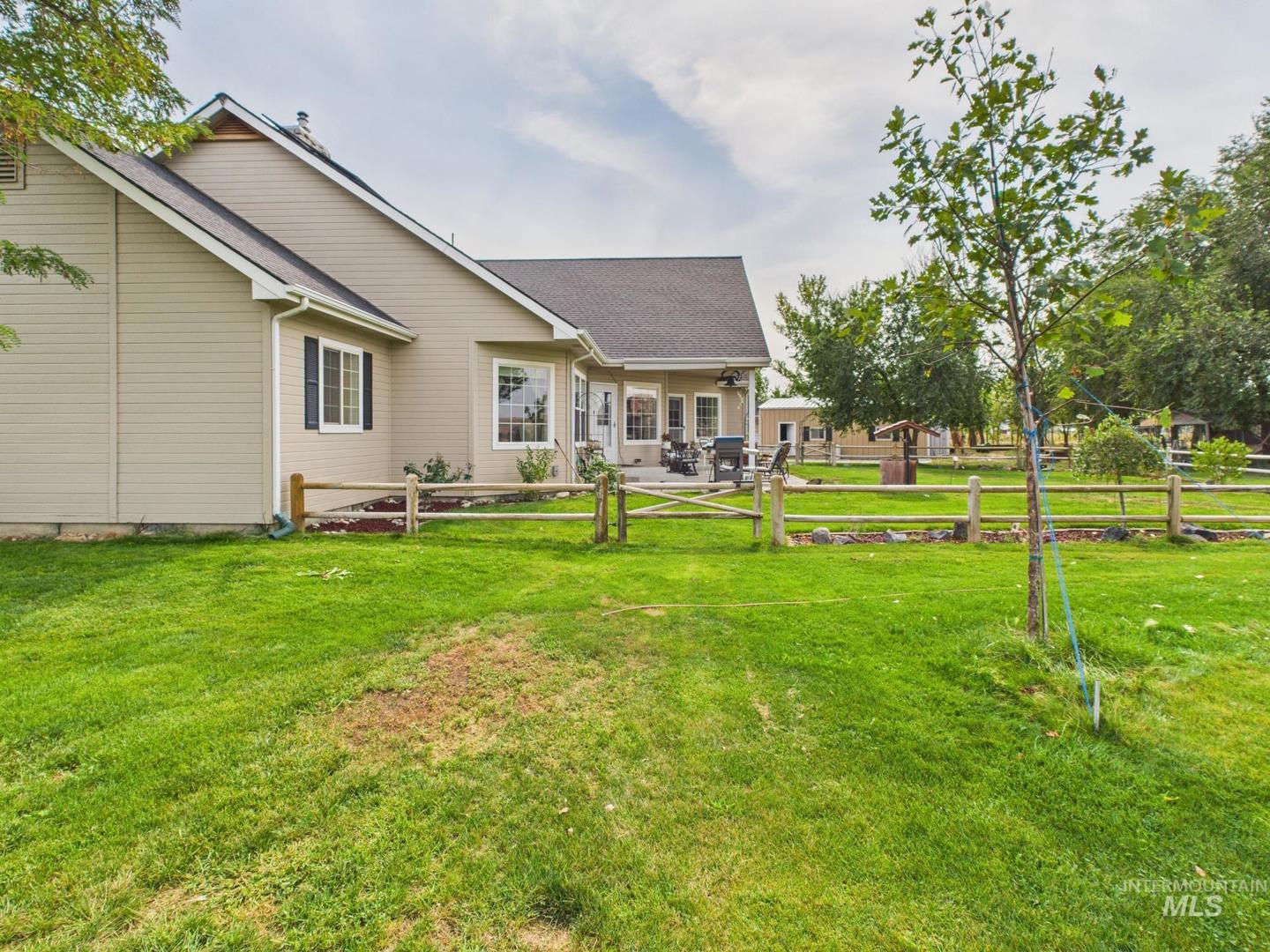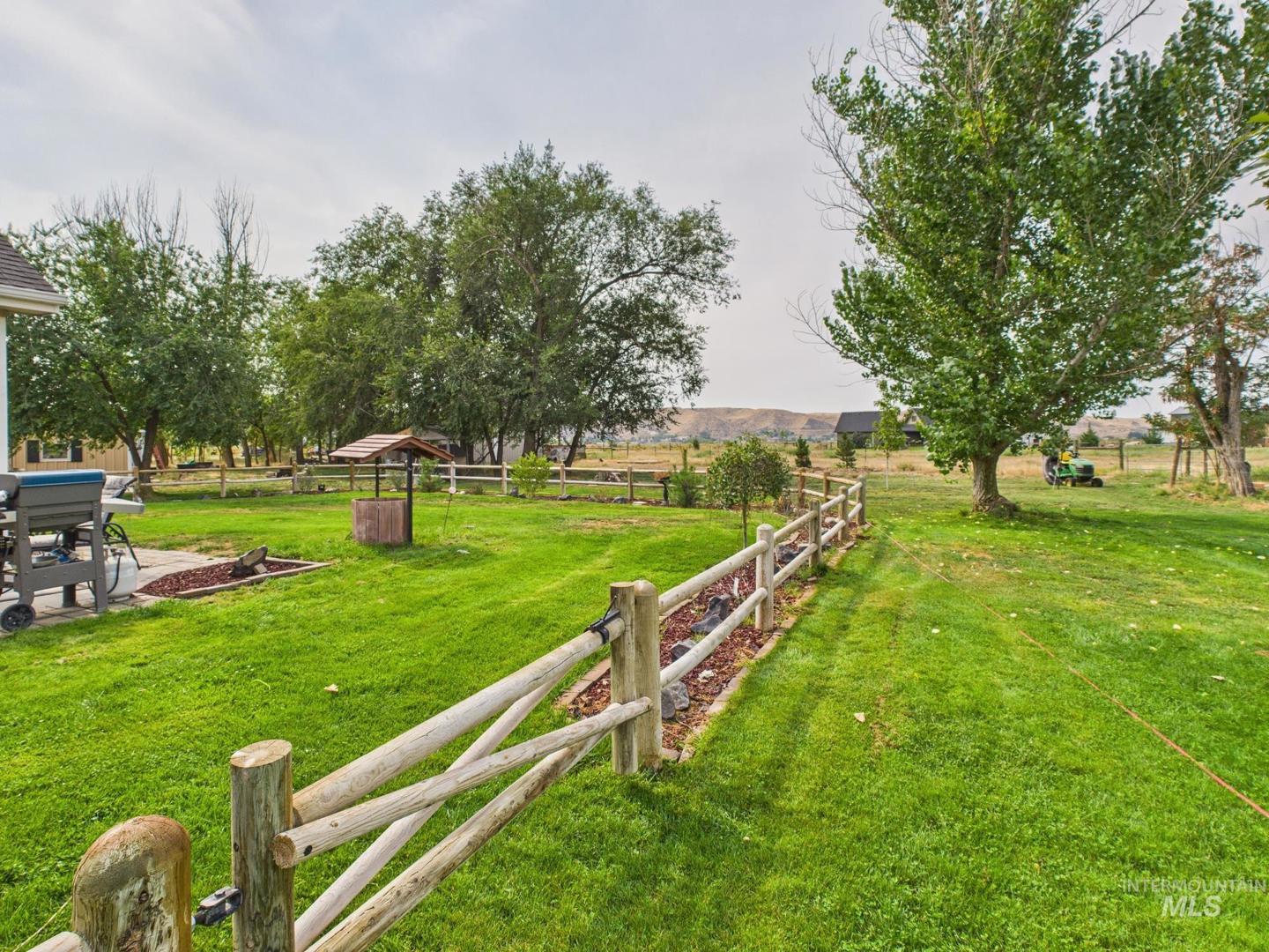 Endless possibilities on this stunning 8.4-acre property just west of Emmett with breathtaking 360° valley views! Whether you dream of an equestrian setup, hobby farm, private retreat, or event venue, this turnkey property has it all—3 fenced pastures, tack room, 30x30 shop, hay barn, fenced garden, fruit trees, sheep enclosure, chicken coop, duck pond, and dog run. The solar-powered home (panels paid off) is surrounded by mature trees, landscaped yard, and a large patio ideal for entertaining. Inside features hickory floors, granite counters, cherry cabinets, gas stove, stained glass accents, custom archways, and a cozy fireplace. The oversized master suite offers patio access, dual closets, and a new walk-in shower. Office/flex space plus recent updates including new carpet, dishwasher, water heater, and freshly cleaned ducts/vents. A rare mix of country charm, modern comfort, and endless opportunity—just minutes from town!