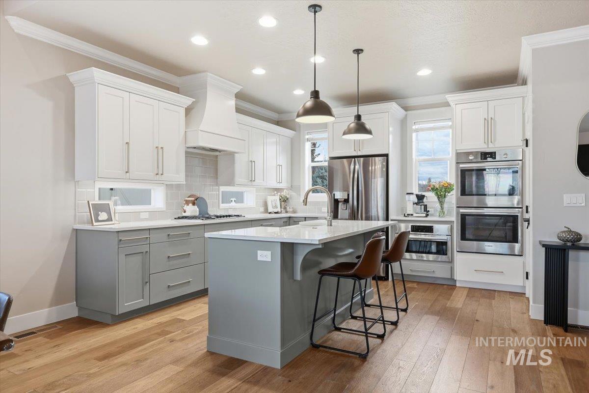 Welcome to luxury Idaho living in the heart of Star! This beautifully maintained Todd Campbell Custom Home sits on a quiet cul-de-sac and blends timeless design with modern comfort. The light-filled layout features vaulted ceilings, hardwood flooring, and an inviting great room that opens to a gourmet kitchen with quartz countertops, custom cabinetry, double ovens, stainless steel appliances, and a walk-in pantry.The main-level primary suite feels like a private retreat with a spa-inspired bath, walk-in tile shower, and large closet. Upstairs offers three spacious bedrooms and a full bath — ideal for family, guests, or office space.Step outside into your professionally designed $50k backyard oasis featuring a stamped concrete patio, covered outdoor living, boulder retaining wall, turf dog area, curbing, and permanent Jellyfish exterior lighting — perfect for year-round entertaining.Car enthusiasts, hobbyists, or fitness lovers will love the extra-deep 30’ garage bay, ideal for a Class C-vehicle, boat,trailer,toys, storage or workshop and finished with poly-aspartic floors, built-in cabinets, and a Tonal smart gym system (approx. $6k value).Ideally located near the new middle school, future elementary school, and future Highway 16 access combining convenience with small-town charm. Low HOA andaffordable taxes make this home better than new with all upgrades completed & move in ready!