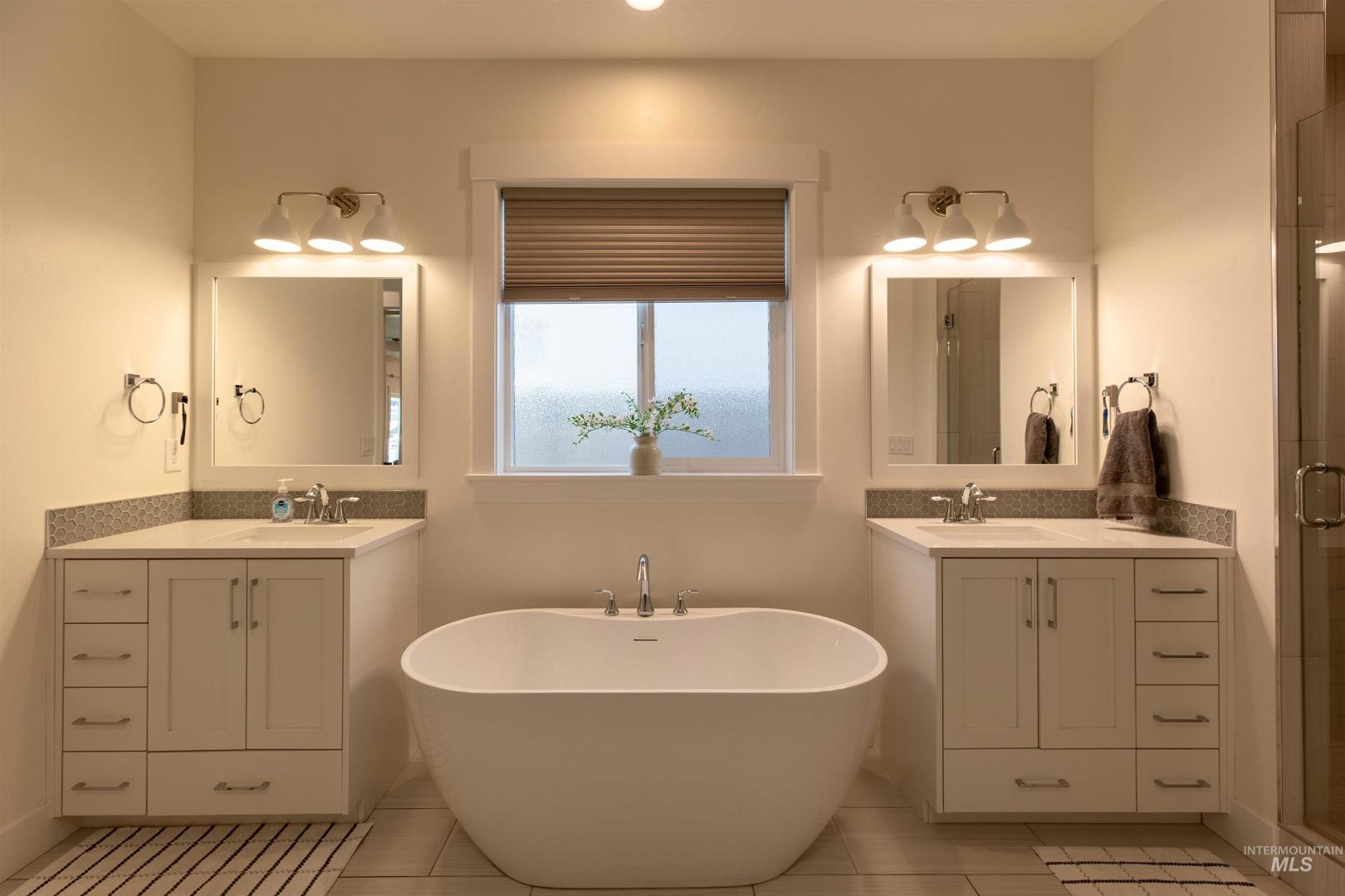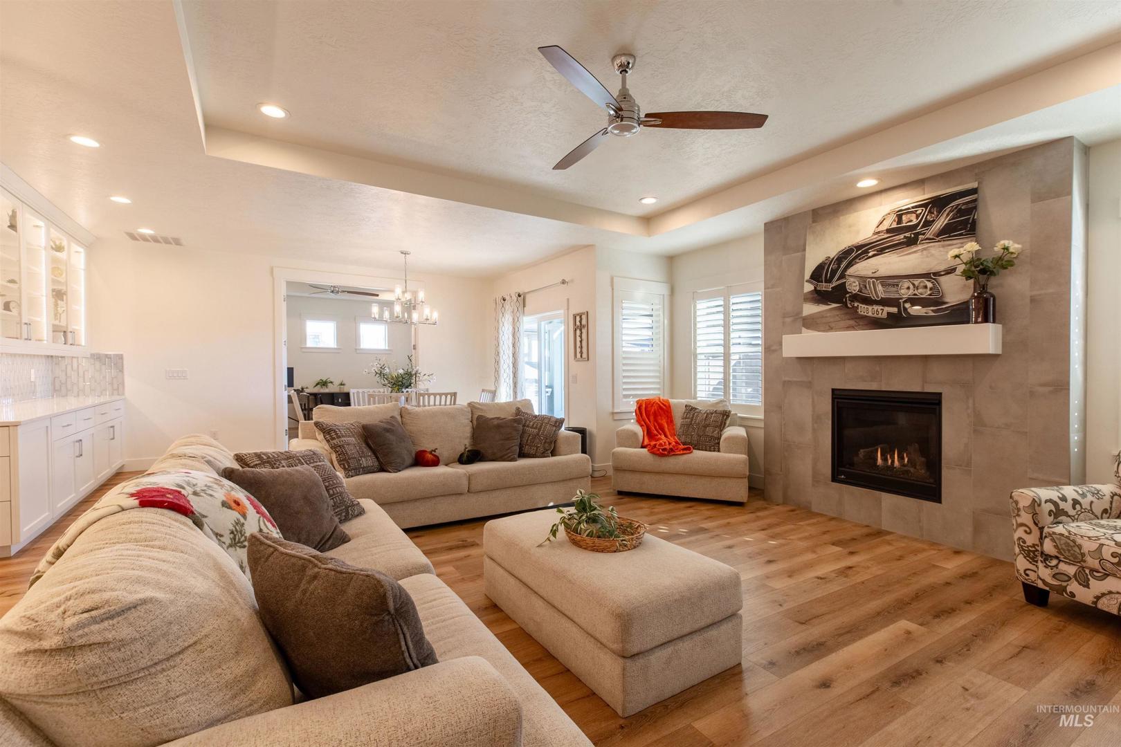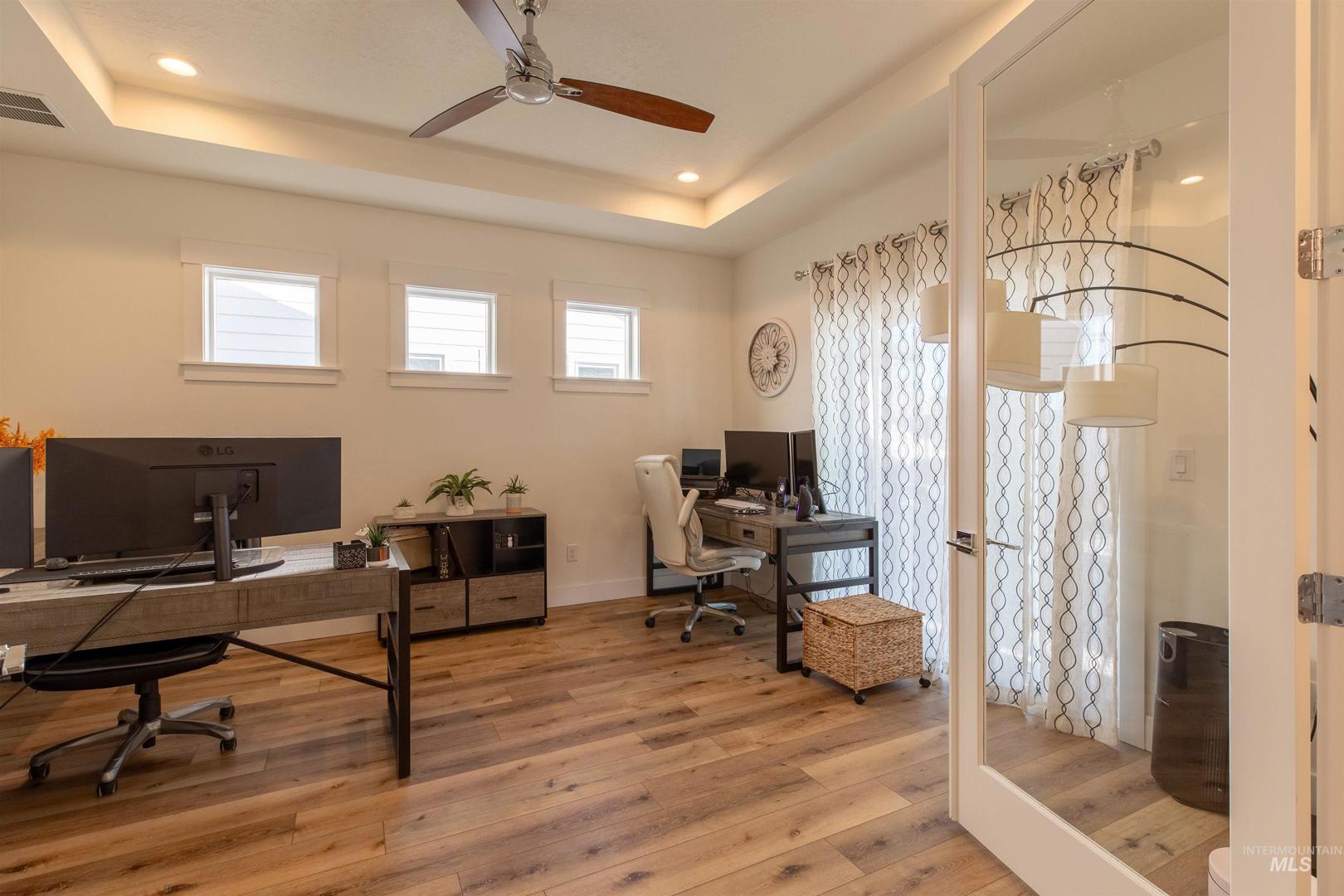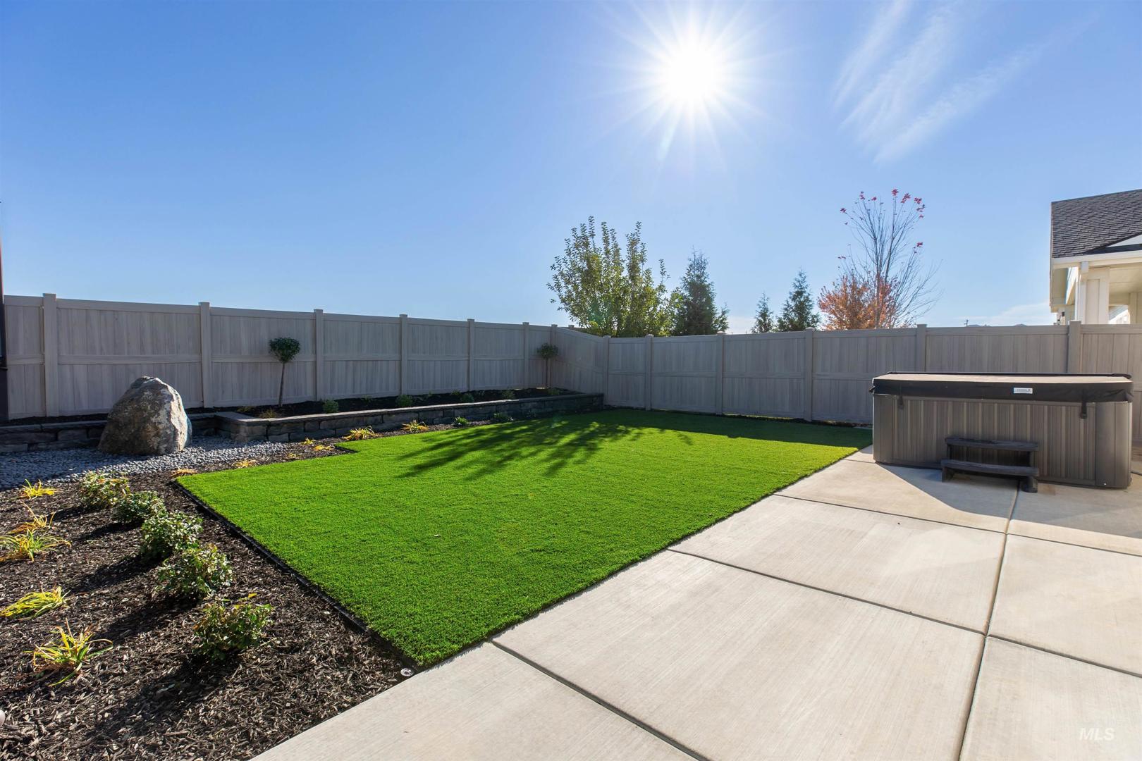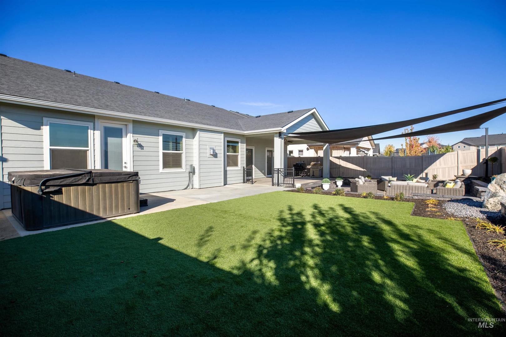 Like new & well maintained w/RV garage & STUNNING backyard! Outside, greeted by quaint courtyard & entering in to bright, refreshing space. Kitchen boasts TONS of cabinetry inc serving station area, large quartz island/bkfst bar, LG appliances inc fridge, 5 burner cook top, RO water at sink, dual ovens & pantry w/auto on/off & lighted lower shelving for lots of storage & even view to the mountains out the back! Plantation Shutters, newer plush carpet, coved ceilings & upgraded ceiling fans throughout. Great Rm w/cozy gas fireplace & tons of natural light. Primary w/door to patio wired for hot tub, ceiling fan & blackout blinds. Dual vanities, tiled floors, freestanding tub, tiled walk-in shower, walk-in closet & private water closet make this a lovely retreat. Easy-care LVP throughout entry, great rm, kitchen & office. Bonus/office w/double doors, great light & door to extended patio. Secondary bedrm w/walk-in closet. Secondary bath dressed in full tile & soaker tub. Mudbench drop-zone. Water softner, air purifier, ,Laundry rm w/sink & tons of counterspace. Retreat to the backyard & relax! Lg covered patio leads to sunken conversation area w/dual gas fire pan feature. Shade sails for summer shade & even a bubbling rock fountain add to the comfort. Raised planter bed+SUPER EASY artificial turf! Sandy area for dogs. Finished 45` RV garage w/easy care epoxy floors for all the toys!