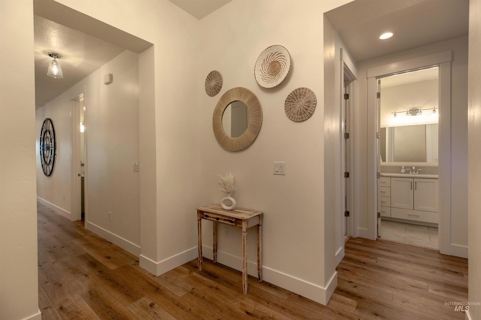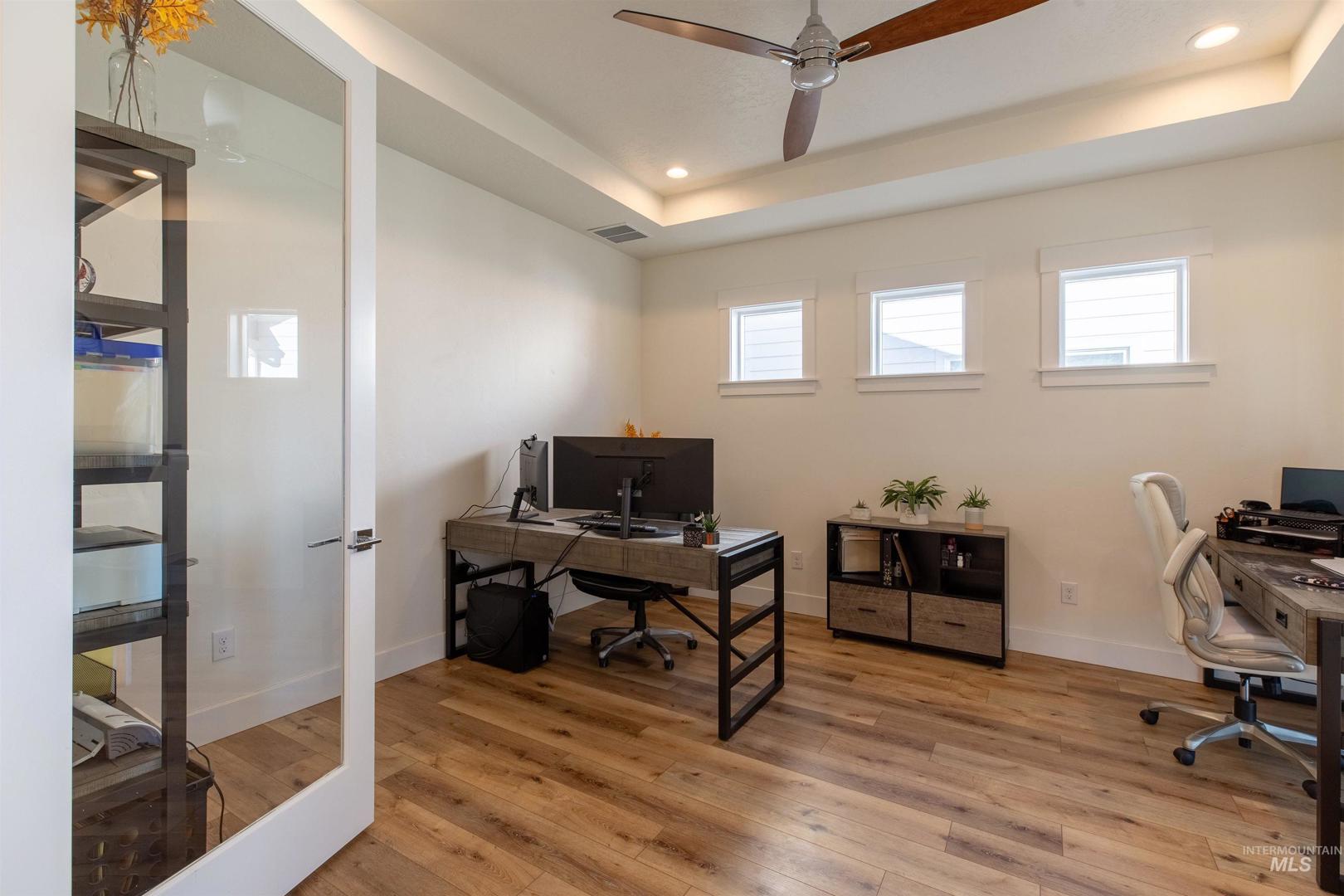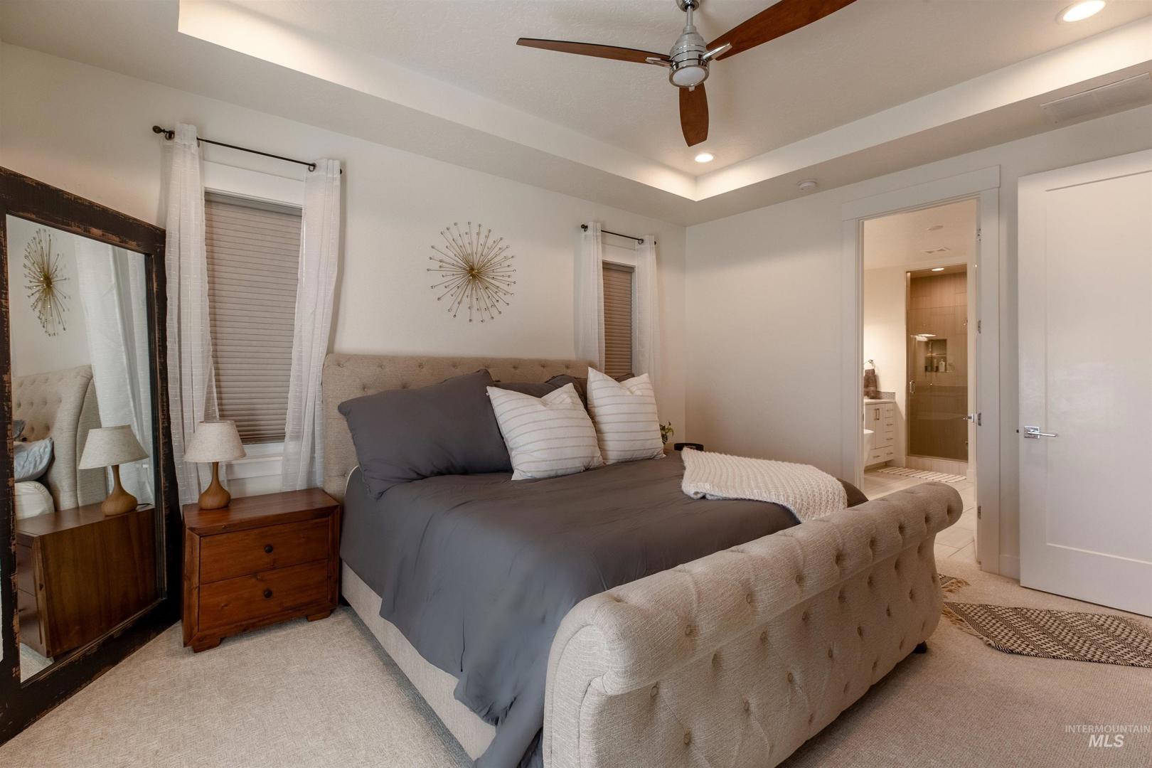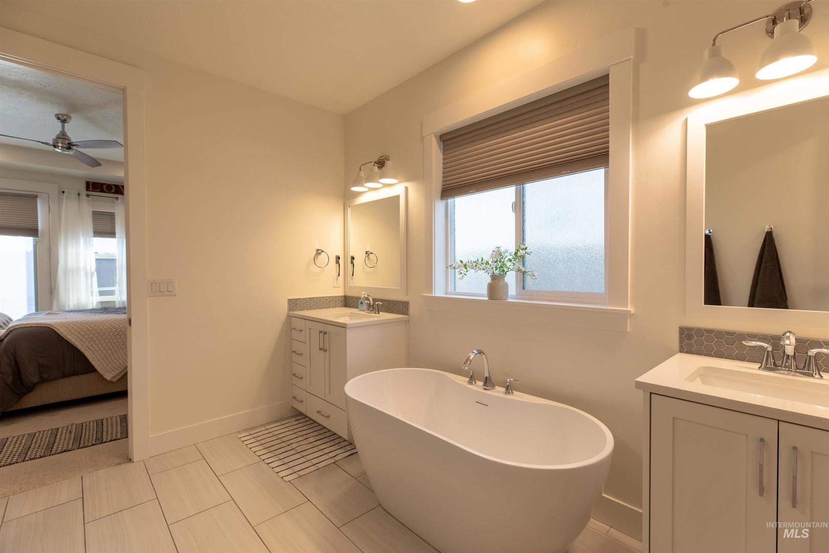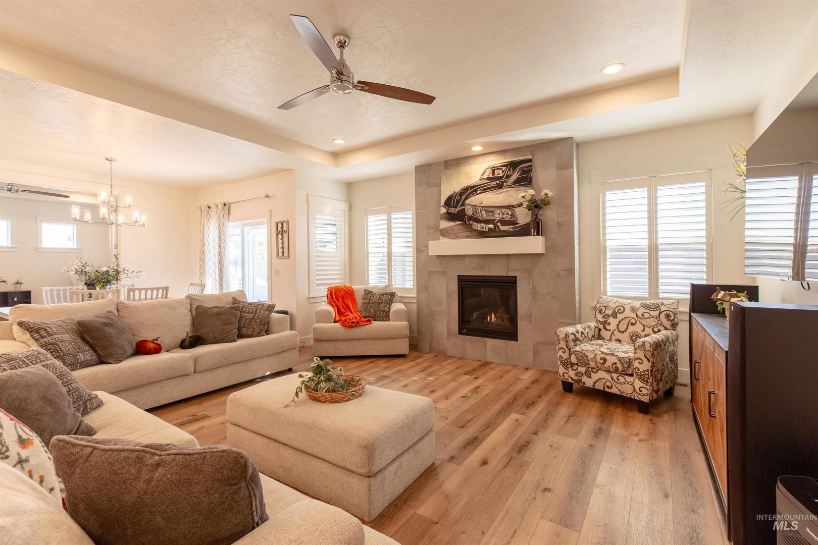 Like new & well maintained w/RV garage & STUNNING backyard! Outside, greeted by quaint courtyard & entering in to bright, refreshing space. Kitchen boasts TONS of cabinetry inc serving station area, large quartz island/bkfst bar, LG appliances inc fridge, 5 burner cook top, RO water at sink, dual ovens & pantry w/auto on/off & lighted lower shelving for lots of storage & even view to the mountains out the back! Plantation Shutters, newer plush carpet, coved ceilings & upgraded ceiling fans throughout. Great Rm w/cozy gas fireplace & tons of natural light. Primary w/door to patio wired for hot tub, ceiling fan & blackout blinds. Dual vanities, tiled floors, freestanding tub, tiled walk-in shower, walk-in closet & private water closet make this a lovely retreat. Easy-care LVP throughout entry, great rm, kitchen & office. Bonus/office w/double doors, great light & door to extended patio. Secondary bedrm w/walk-in closet. Secondary bath dressed in full tile & soaker tub. Mudbench drop-zone. Water softner, air purifier, ,Laundry rm w/sink & tons of counterspace. Retreat to the backyard & relax! Lg covered patio leads to sunken conversation area w/dual gas fire pan feature. Shade sails for summer shade & even a bubbling rock fountain add to the comfort. Raised planter bed+SUPER EASY artificial turf! Sandy area for dogs. Finished 45` RV garage w/easy care epoxy floors for all the toys!