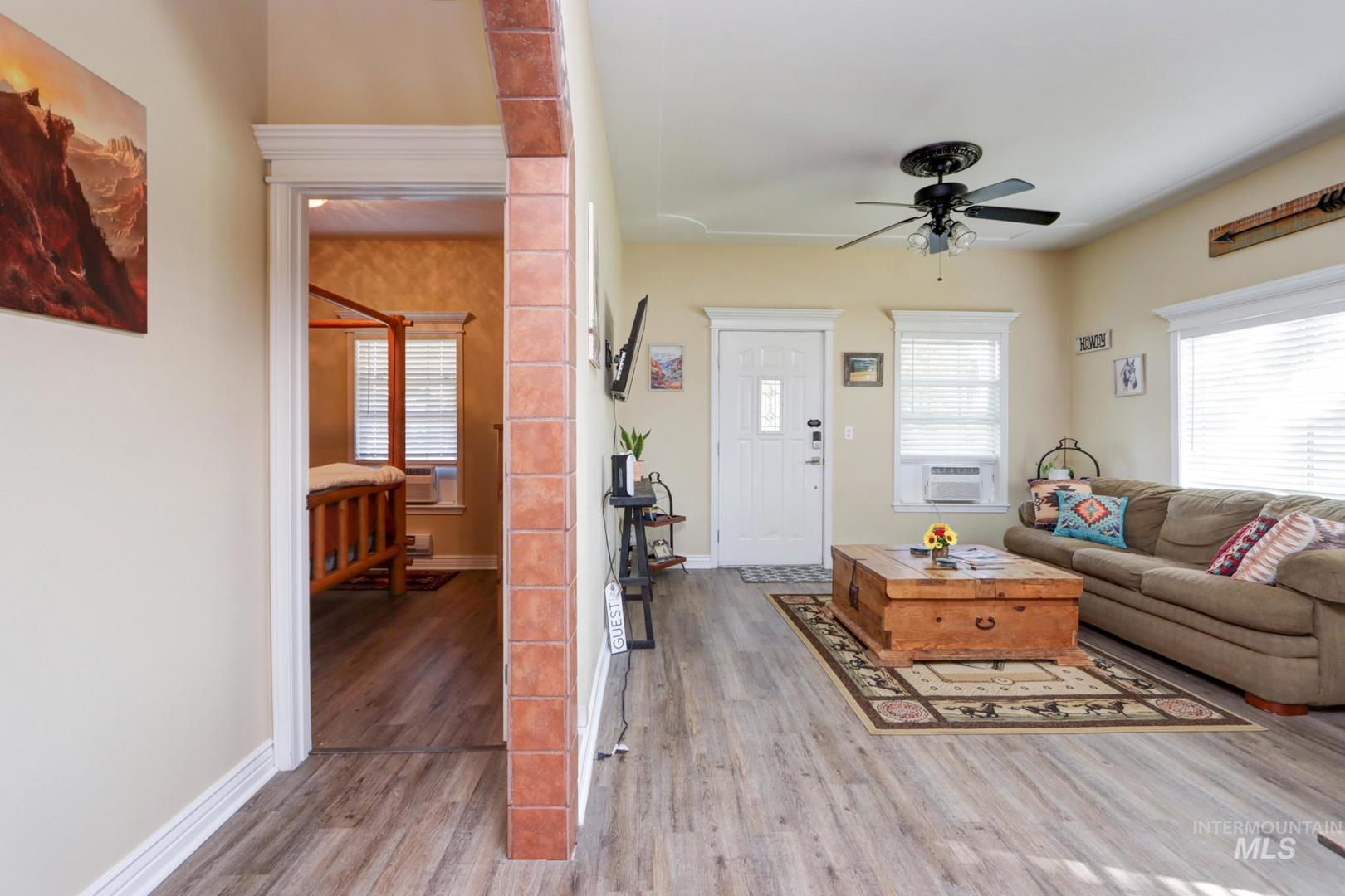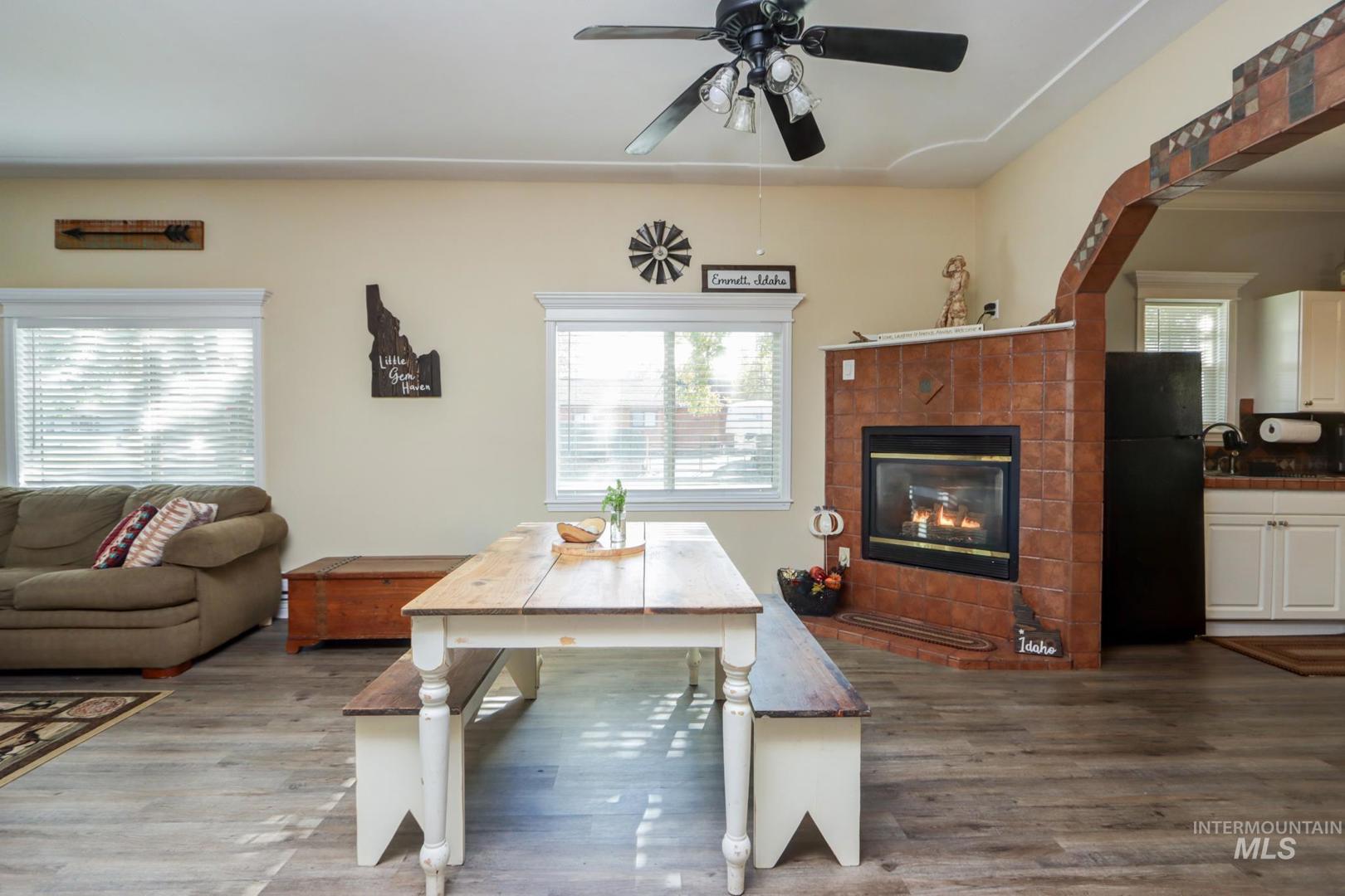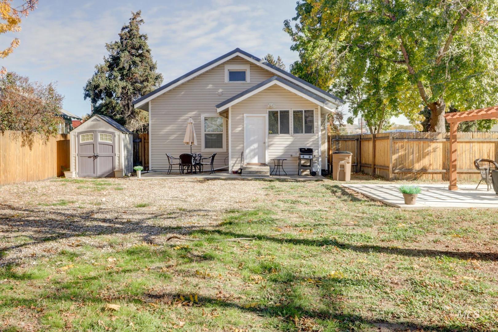 This charming craftsman-style home is conveniently located in the heart of Emmett, close to shops, restaurants, the Payette river and Black Canyon Reservoir. Nestled on a large corner lot, it boasts a large front yard, equipped with new sprinklers and features beautiful matured trees. Sit down and unwind on this quiet and relaxing porch after a long day. Step inside and be greeted by the rich character of the home-from the decorative tile to the detailing on the high ceilings. The combination of a cozy fireplace and an abundance of natural lighting is sure to make this house feel like home. The updated bathroom showcases modern finishes and the cute kitchen features an open concept, allowing lots of room for friends and family to gather. The heart of this home extends outdoors to the spacious backyard, perfect for BBQ`s, fire pit memories under the stars or a gardeners oasis. For added convenience, the back fence gate opens from the alley to allow RV parking-a rare and sought-after amenity in the city. Take a look at this timeless home today!