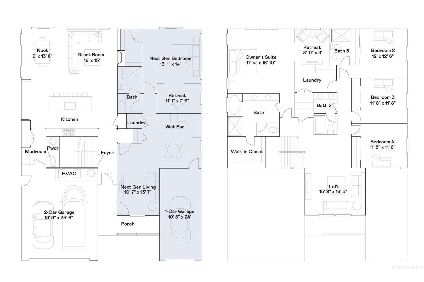 The Next Gen Series is built for today’s multi-generational families, offering two homes under one roof. Each suite includes its own entrance, single-car garage, kitchenette with convection microwave, private laundry, and quartz countertops. The main home showcases 9’ ceilings, a spacious great room with a fireplace, a full width covered patio, and a gourmet kitchen with quartz countertops, a full backsplash, double ovens, and stainless-steel appliances. With full landscaping, blinds, washer/dryer, and energy-efficient features like tankless water heaters, the Next Gen Series offers flexibility and independence for every generation. Terrace Falls offers large estate size homesites, tot lot, and green spaces.