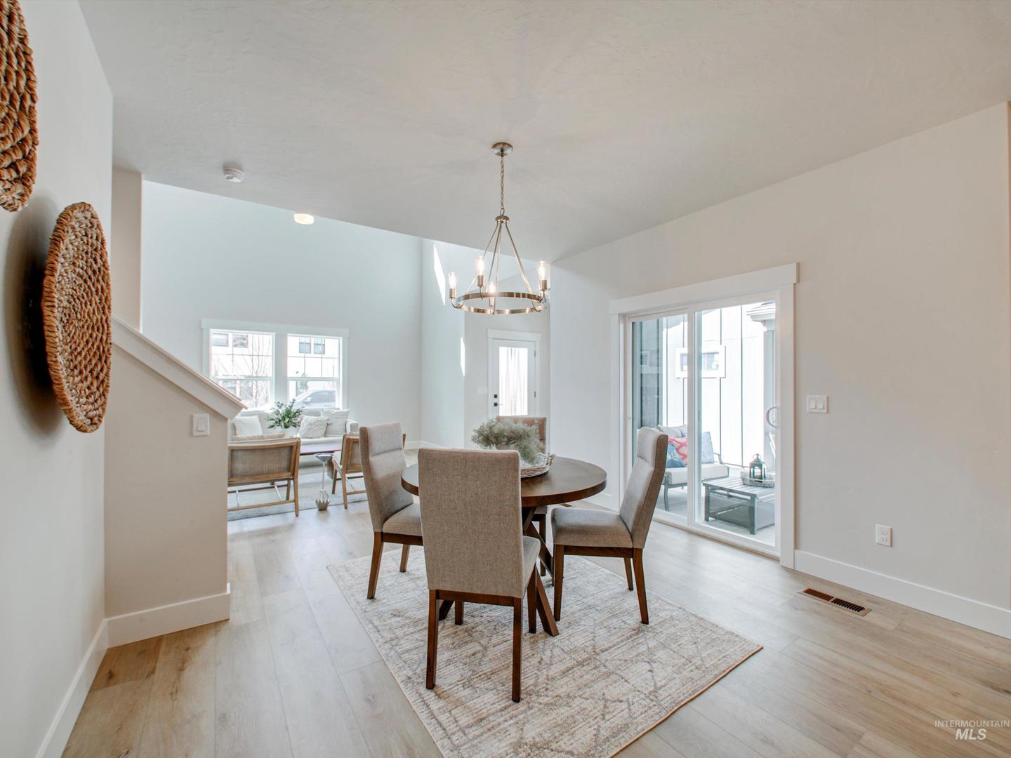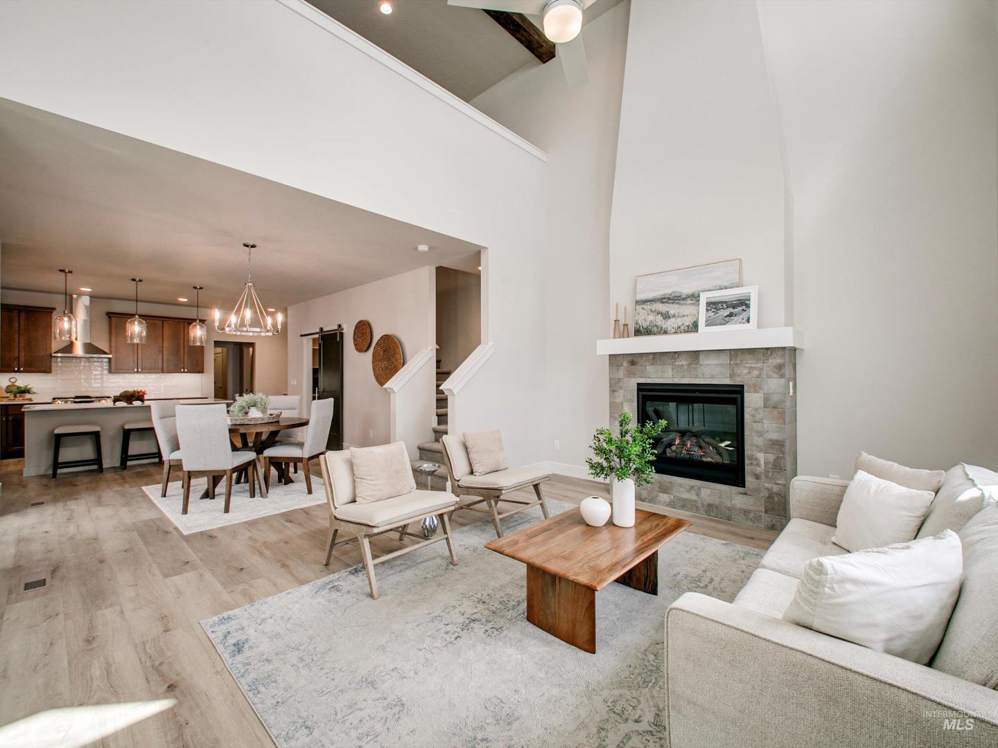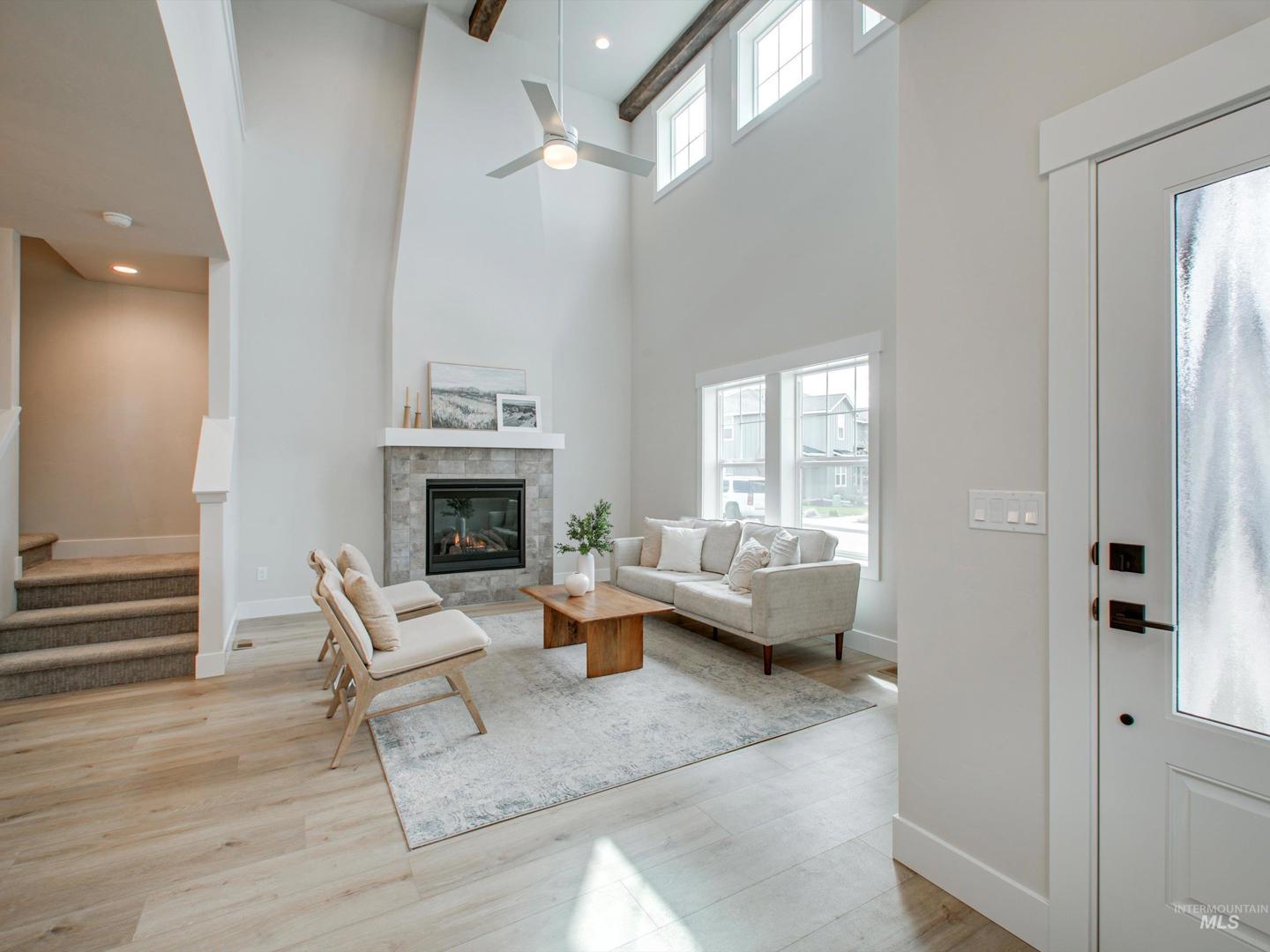 Low-maintenance luxury living just steps from downtown Eagle, nestled in a quiet boutique community! Rare main level master bedroom! Spa-like ensuite w/ dual vanities, full tile shower w/ built-in bench, & WIC. Stunning 18` ceiling in living room w/ tapered gas fireplace & stained beams above. Gourmet kitchen w/ dove-tail soft-close cabinets, under-cabinet lighting, enormous quartz island, upgraded SS LG appliances (air fry oven!), decorative range hood, beverage bar w/ open iron shelving, & walk-in pantry w/ barn door. Central dining room opens to private side courtyard perfect for outdoor entertaining. Upstairs offers 2 additional bedrooms, plus an office or flex space, & bonus room which is open to below. Deep alley-load garage, full landscaping, energy efficient HERS rating, & more. An easy stroll to great restaurants, Eagle Sat Market, Guerber Park, Boise River Greenbelt, Eagle Hills Golf Course, or hop on nearby HWY 55 for quick escape to the mountains! Quality & location at a remarkable value!