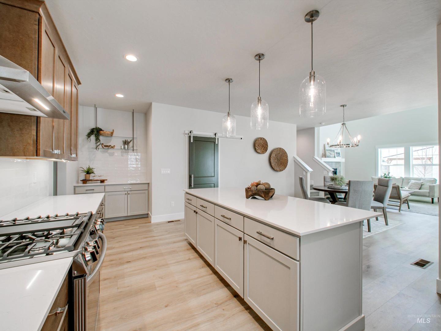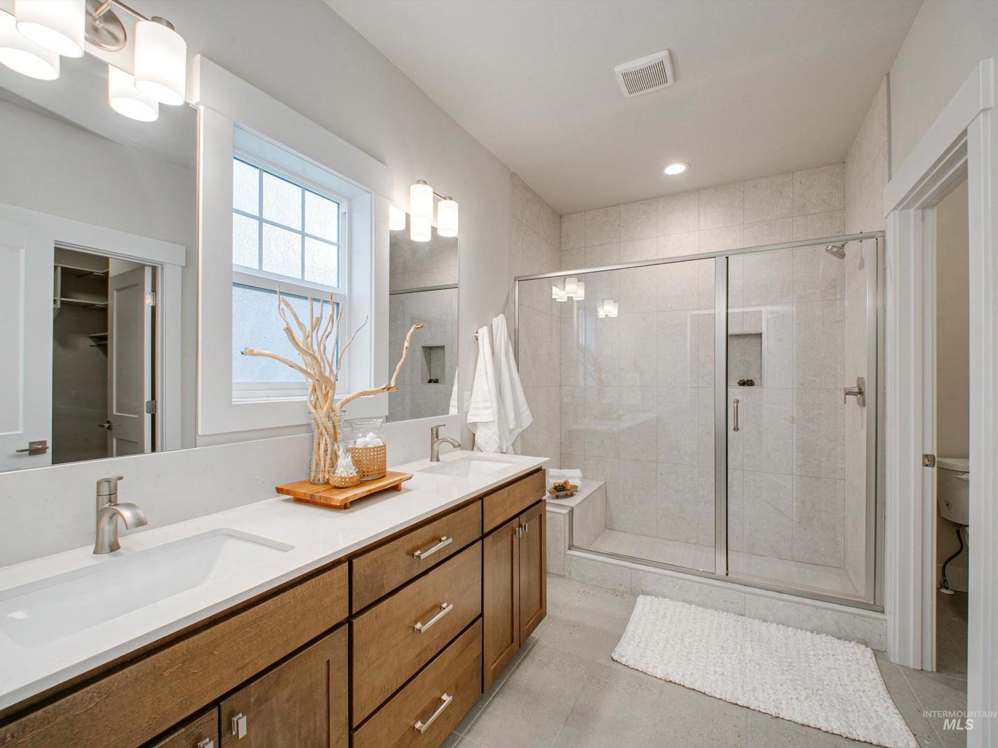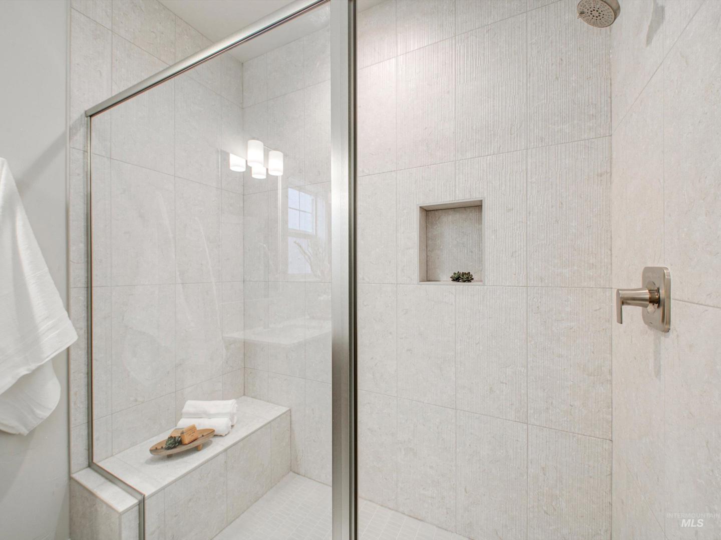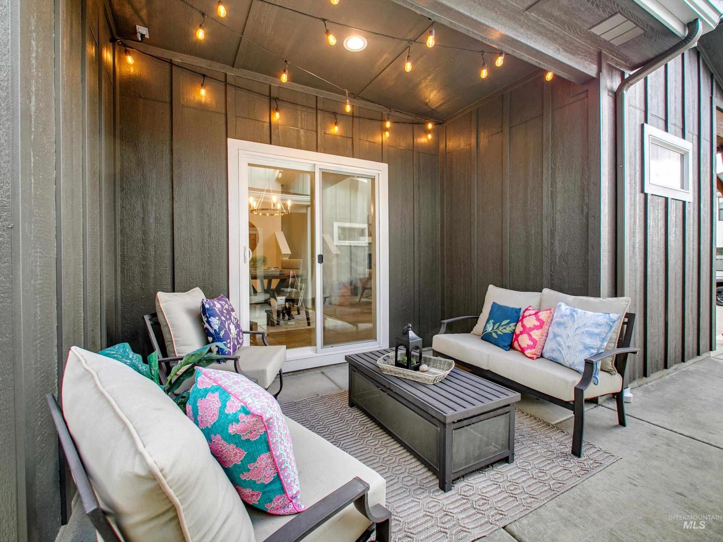 Low-maintenance luxury living just steps from downtown Eagle, nestled in a quiet boutique community! Rare main level master bedroom! Spa-like ensuite w/ dual vanities, full tile shower w/ built-in bench, & WIC. Stunning 18` ceiling in living room w/ tapered gas fireplace & stained beams above. Gourmet kitchen w/ dove-tail soft-close cabinets, under-cabinet lighting, enormous quartz island, upgraded SS LG appliances (air fry oven!), decorative range hood, beverage bar w/ open iron shelving, & walk-in pantry w/ barn door. Central dining room opens to private side courtyard perfect for outdoor entertaining. Upstairs offers 2 additional bedrooms, plus an office or flex space, & bonus room which is open to below. Deep alley-load garage, full landscaping, energy efficient HERS rating, & more. An easy stroll to great restaurants, Eagle Sat Market, Guerber Park, Boise River Greenbelt, Eagle Hills Golf Course, or hop on nearby HWY 55 for quick escape to the mountains! Quality & location at a remarkable value!
