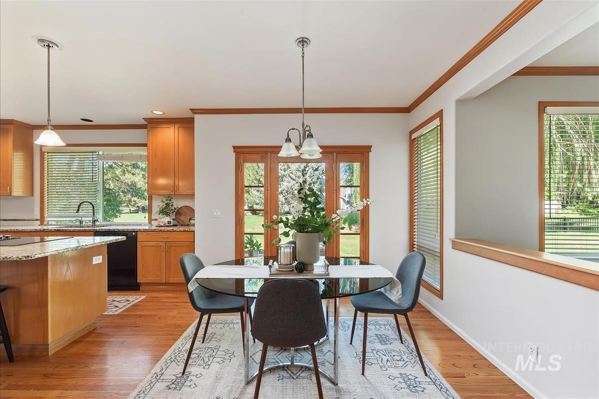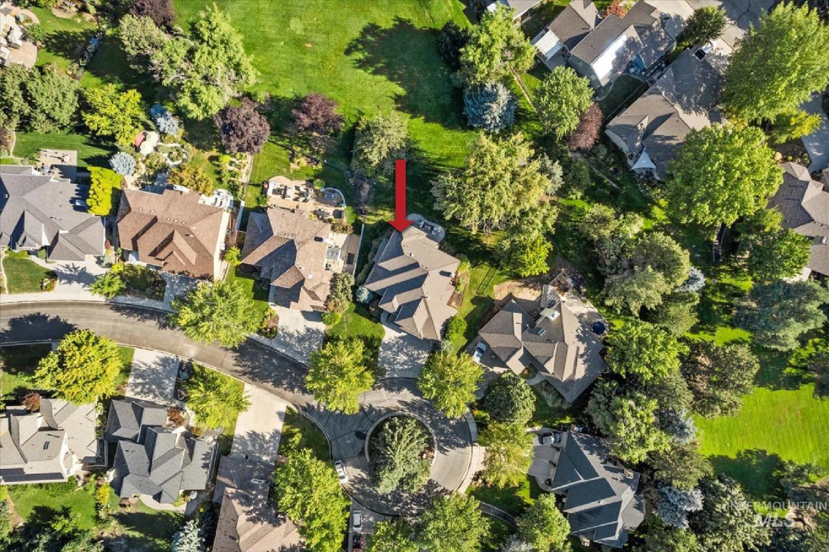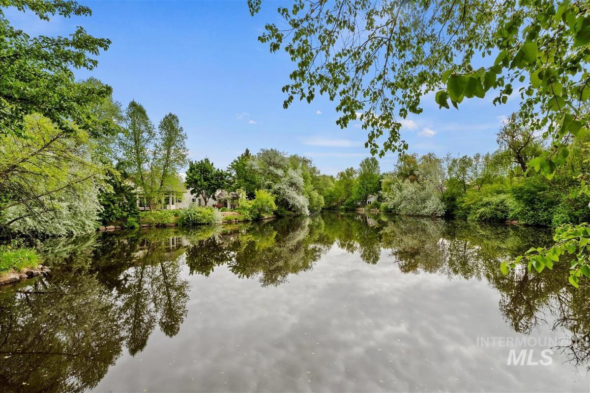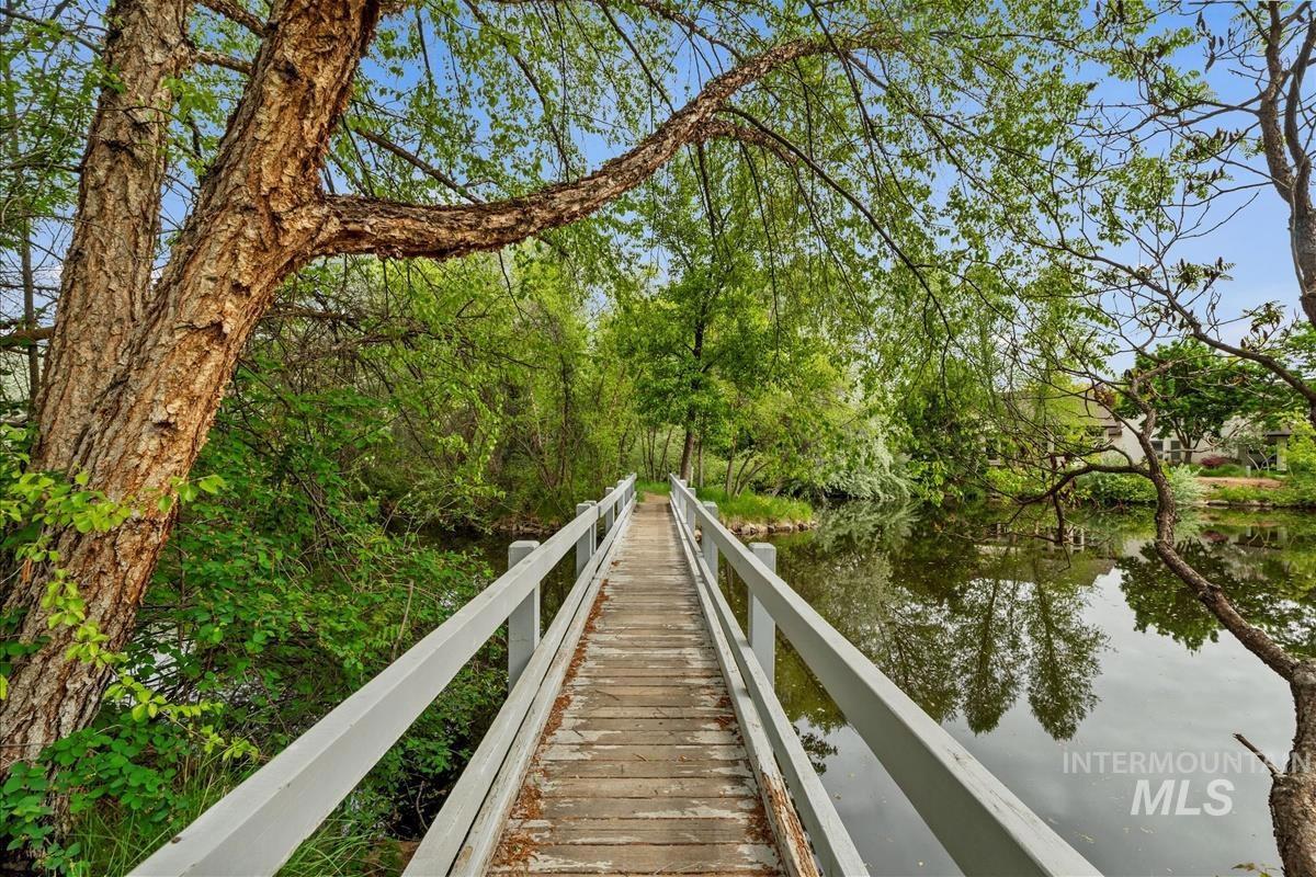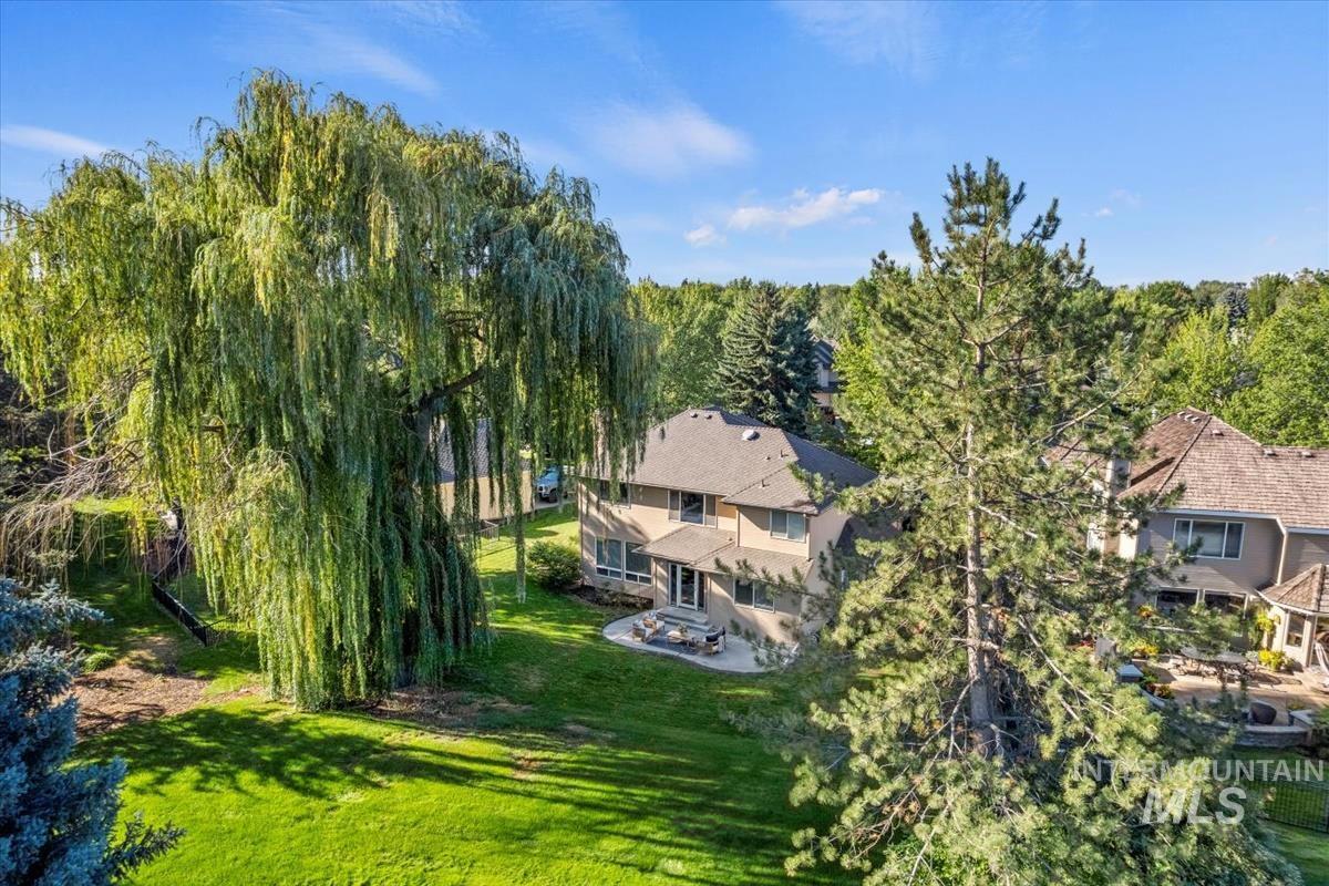 Nestled in the highly coveted Meadow Creek community, this beautiful home sits peacefully in a cul-de-sac. Volume ceilings greet you at the entry and flow seamlessly into the living room, where an oversized window frames the space with natural light. The kitchen is thoughtfully designed with granite countertops, double ovens, and a large window over the sink showcasing peaceful backyard views. Just off the kitchen, the casual dining area includes a built-in desk and generous storage. The family room invites you to relax with rich hardwood floors, oversized windows, and a striking stone fireplace as its centerpiece. Step outside to your own private park-like backyard—mature trees line the perimeter, offering shade, privacy, and a truly serene atmosphere. Living in Meadow Creek means access to ponds, a community pool, clubhouse, tennis courts, and walking paths—all just steps away. With the Boise River within walking distance, this home combines convenience, beauty, and lifestyle in one perfect package.