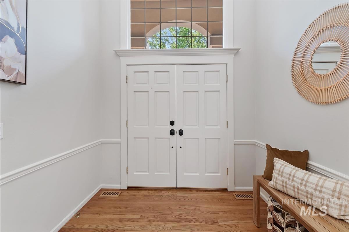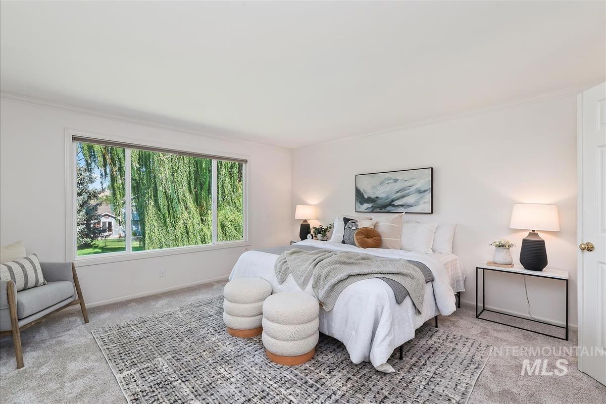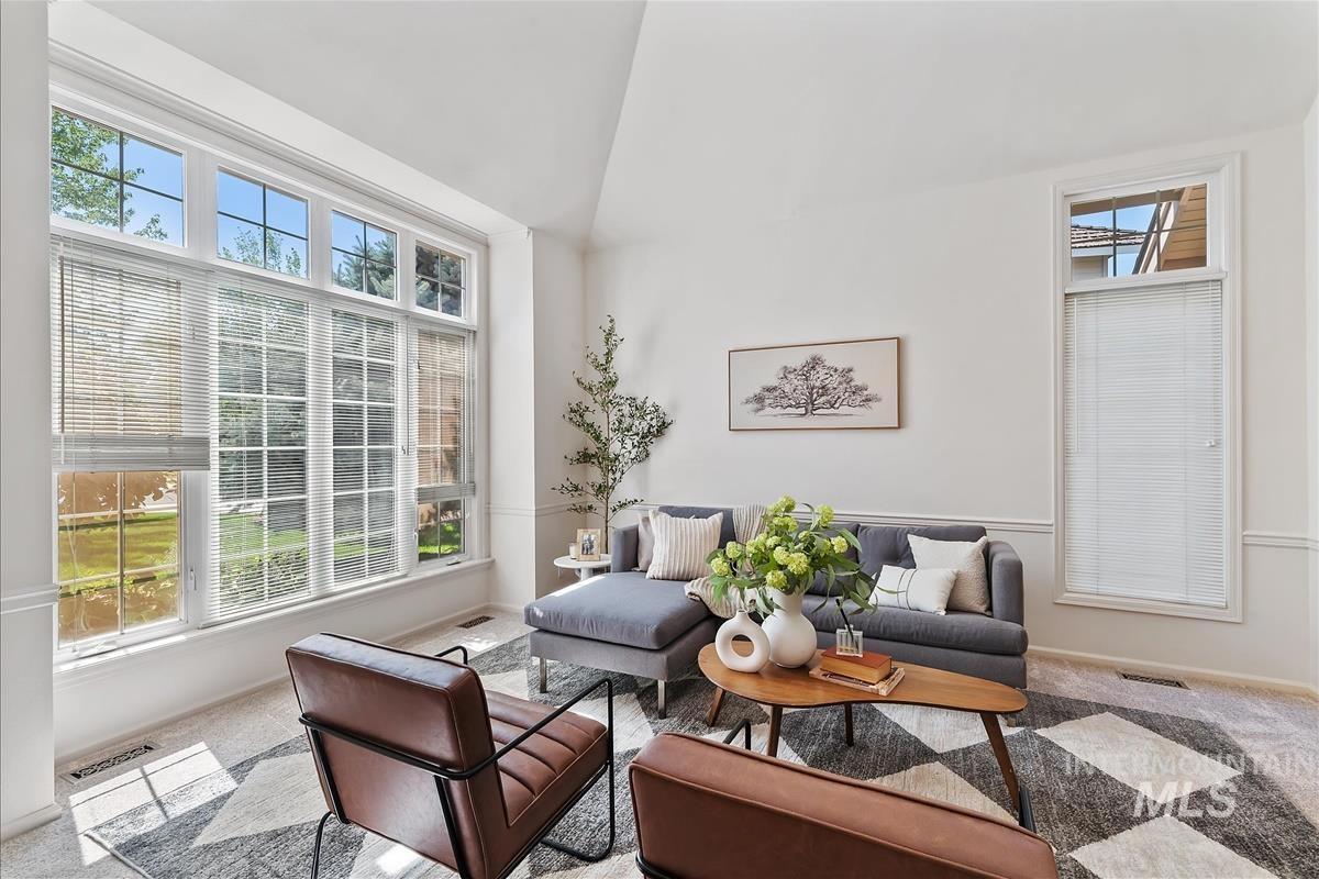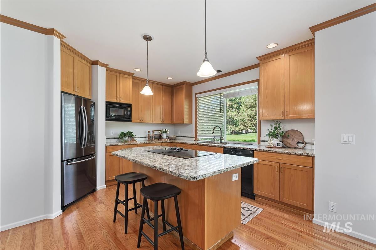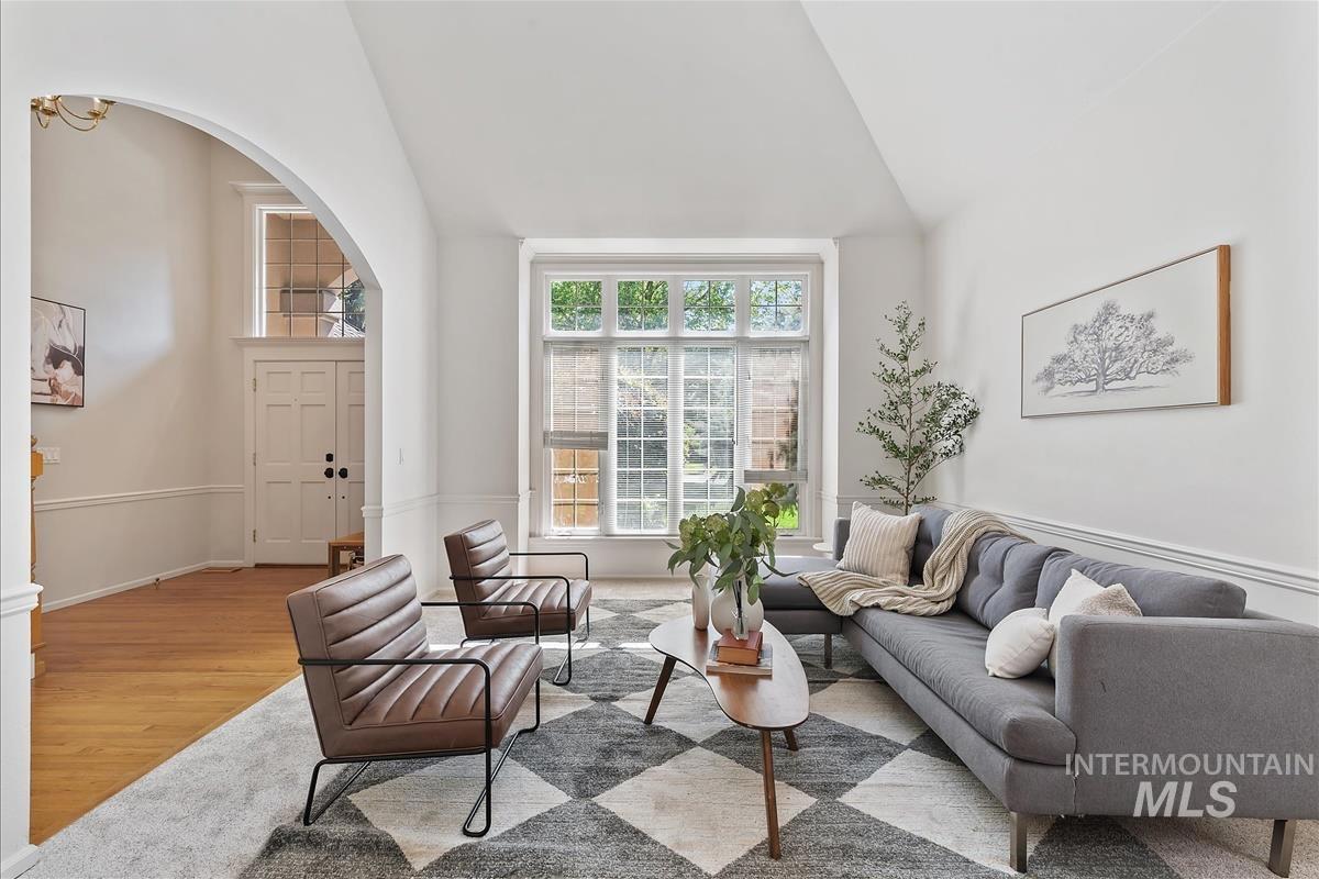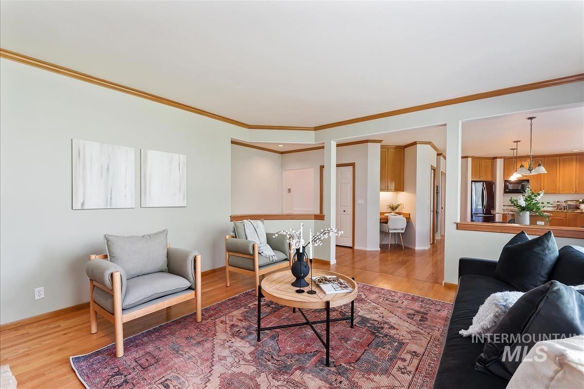 Nestled in the highly coveted Meadow Creek community, this beautiful home sits peacefully in a cul-de-sac. Volume ceilings greet you at the entry and flow seamlessly into the living room, where an oversized window frames the space with natural light. The kitchen is thoughtfully designed with granite countertops, double ovens, and a large window over the sink showcasing peaceful backyard views. Just off the kitchen, the casual dining area includes a built-in desk and generous storage. The family room invites you to relax with rich hardwood floors, oversized windows, and a striking stone fireplace as its centerpiece. Step outside to your own private park-like backyard—mature trees line the perimeter, offering shade, privacy, and a truly serene atmosphere. Living in Meadow Creek means access to ponds, a community pool, clubhouse, tennis courts, and walking paths—all just steps away. With the Boise River within walking distance, this home combines convenience, beauty, and lifestyle in one perfect package.