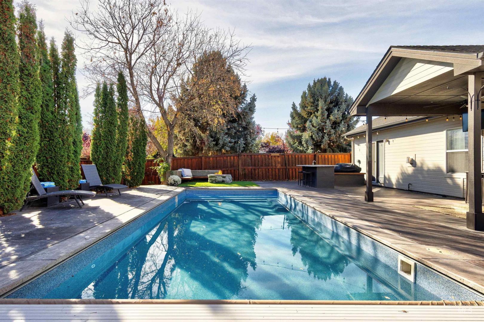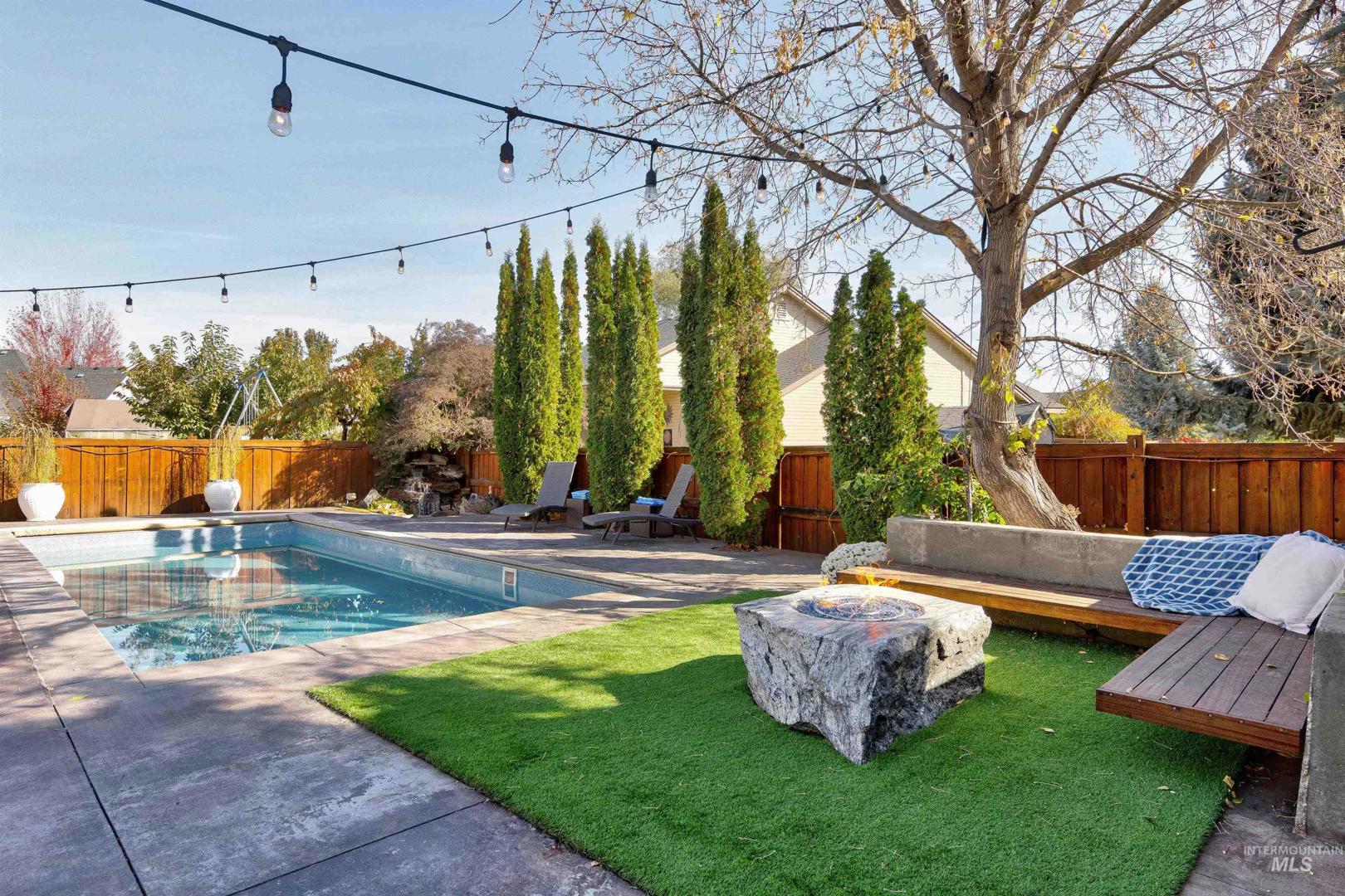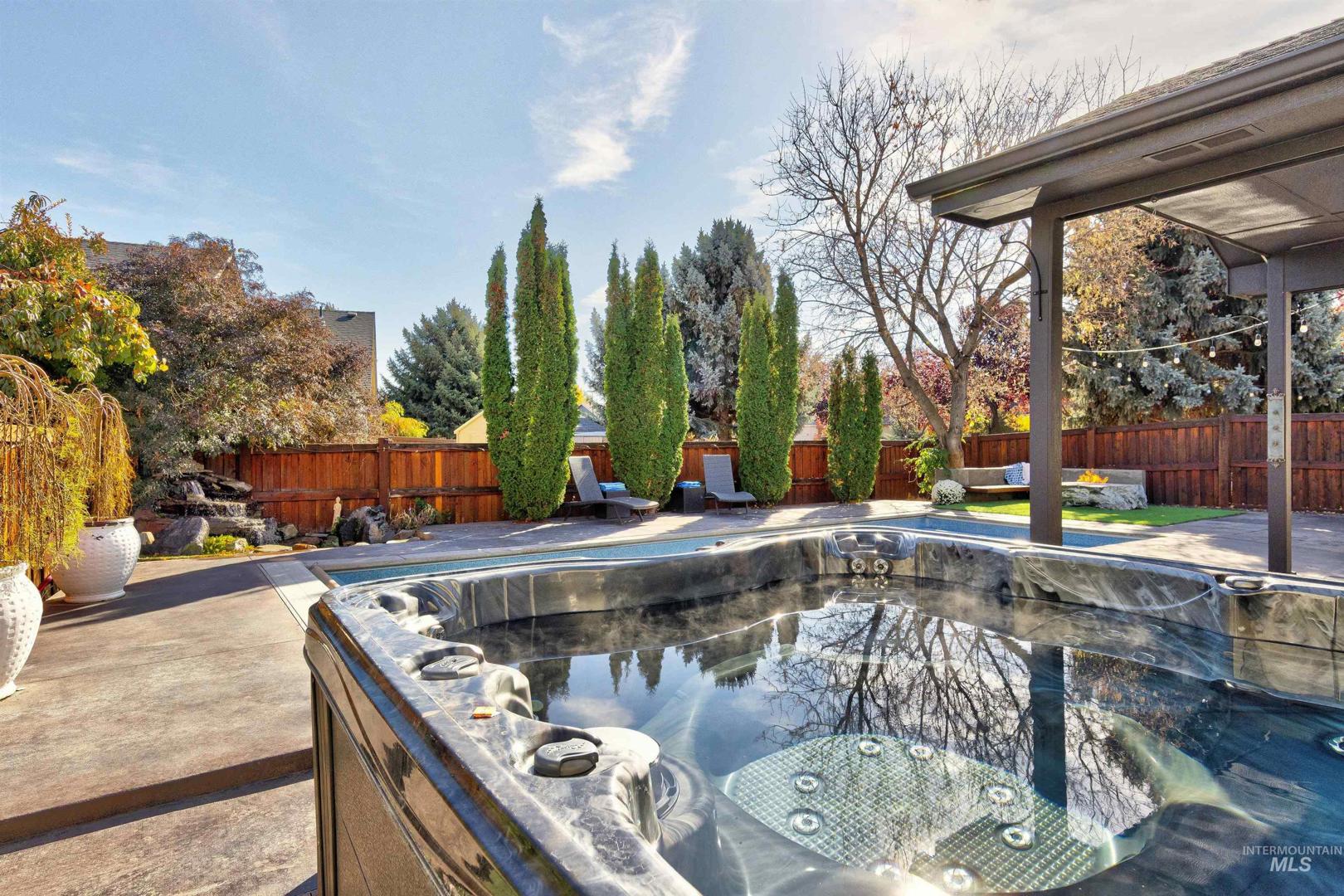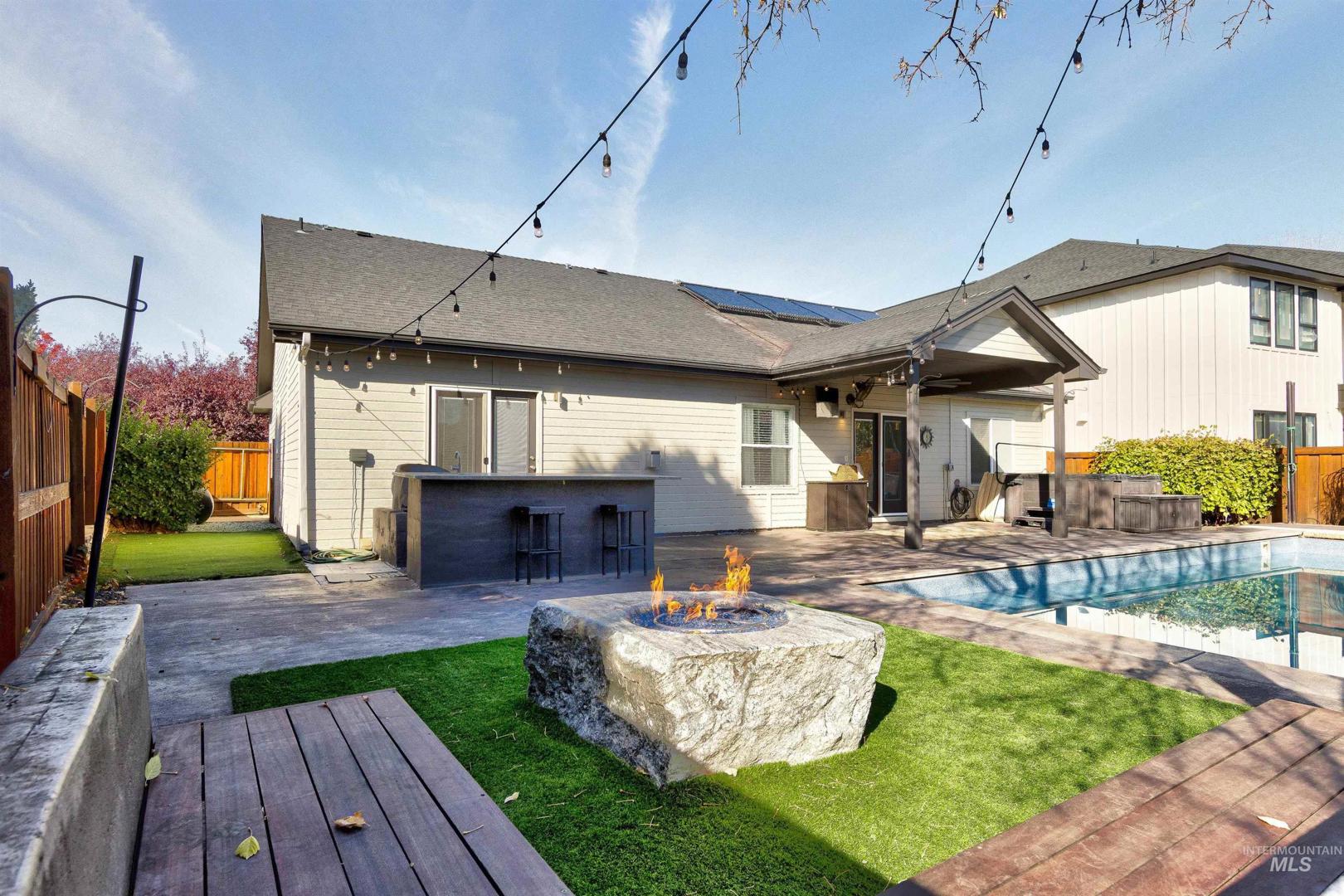 A beautiful gem in Lochsa Falls - close to everything Meridian has to offer in a beautiful subdivision with mature landscape and a community feel with paths and parks. Built in 2005 2079 Marten Creek is a 4 bedroom, two bath with a pool, outdoor fireplace and barbeque for fun outdoor living, Inside 9 ft vaulted ceilings with beams, and a cozy corner fireplace in the living room. Easy maintenance free living with low utilities due to a heat sink solar heating system which can reduce energy bills by 30-60% with efficient energy transfer. Single level living with large master and walk out patio doors, dedicated office, 4 bedrooms and plenty of storage space. Garage is finished with cabinets and can be used as a video game room with screens. In home stereo speakers, outside pool lighting and drip system. Charming front walk way contains the neighborhood small koi pond - be sure to feed the fish on the way out. Hot tub on patio ready for new owners and toasty soaks as winter approaches.