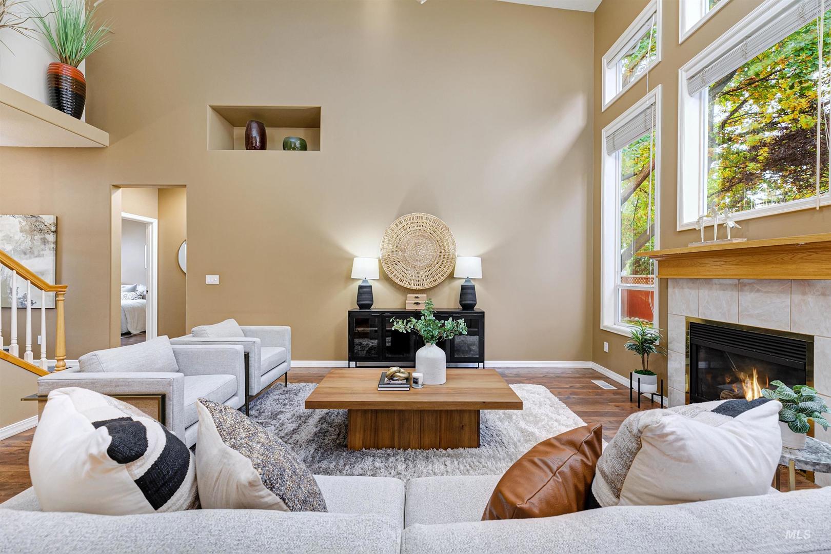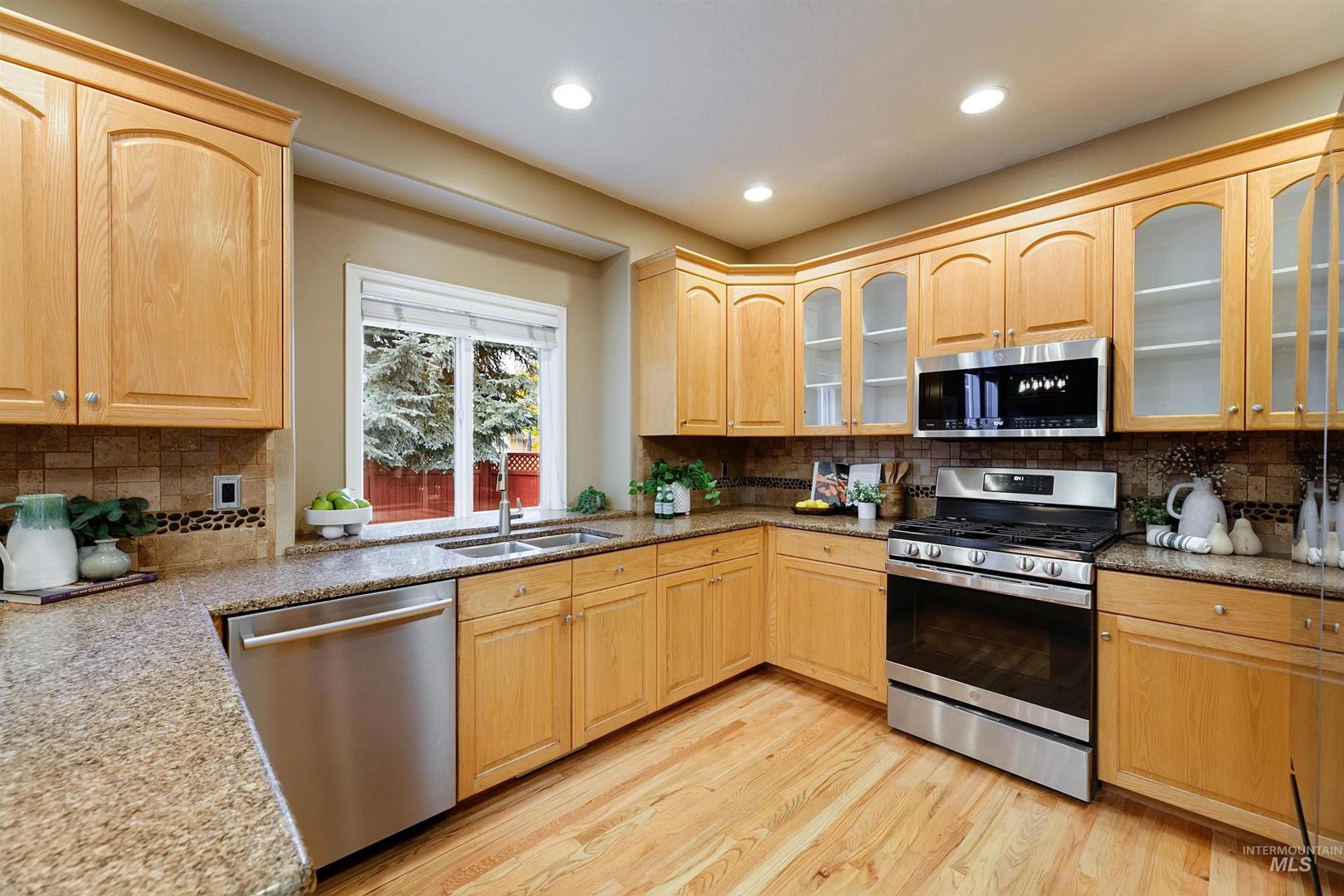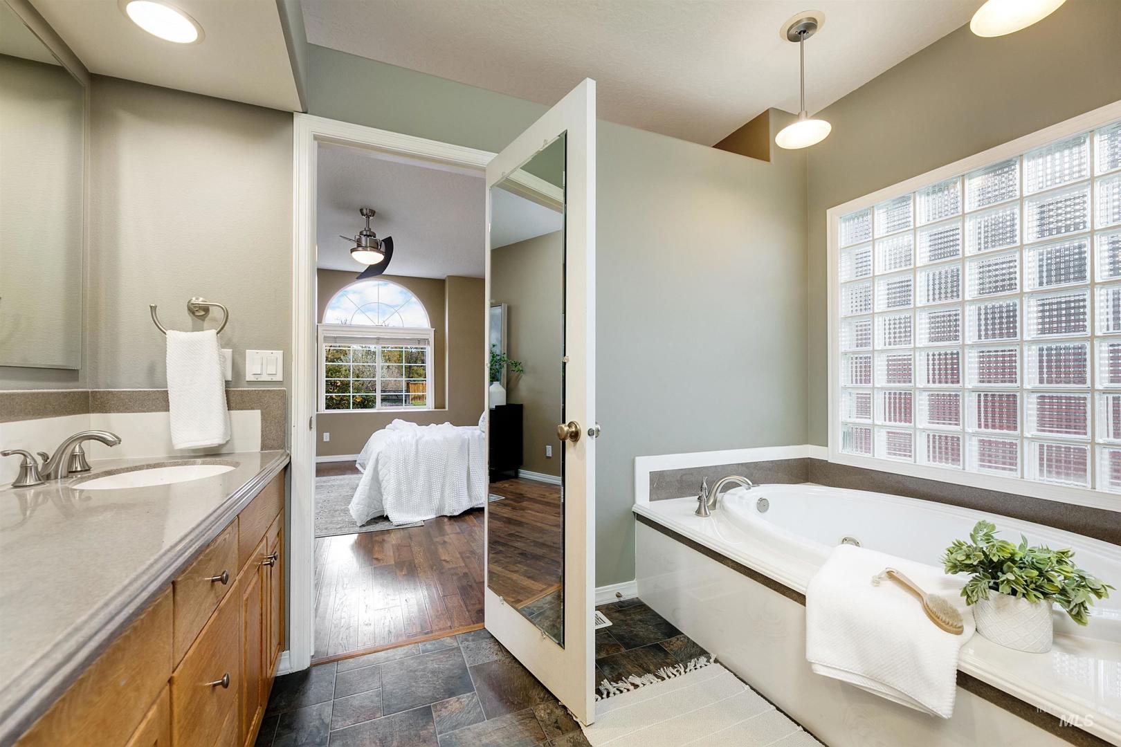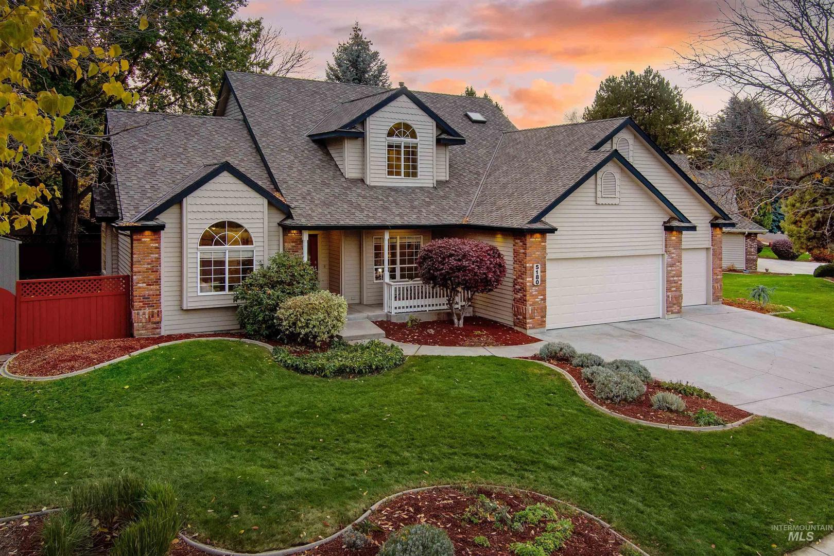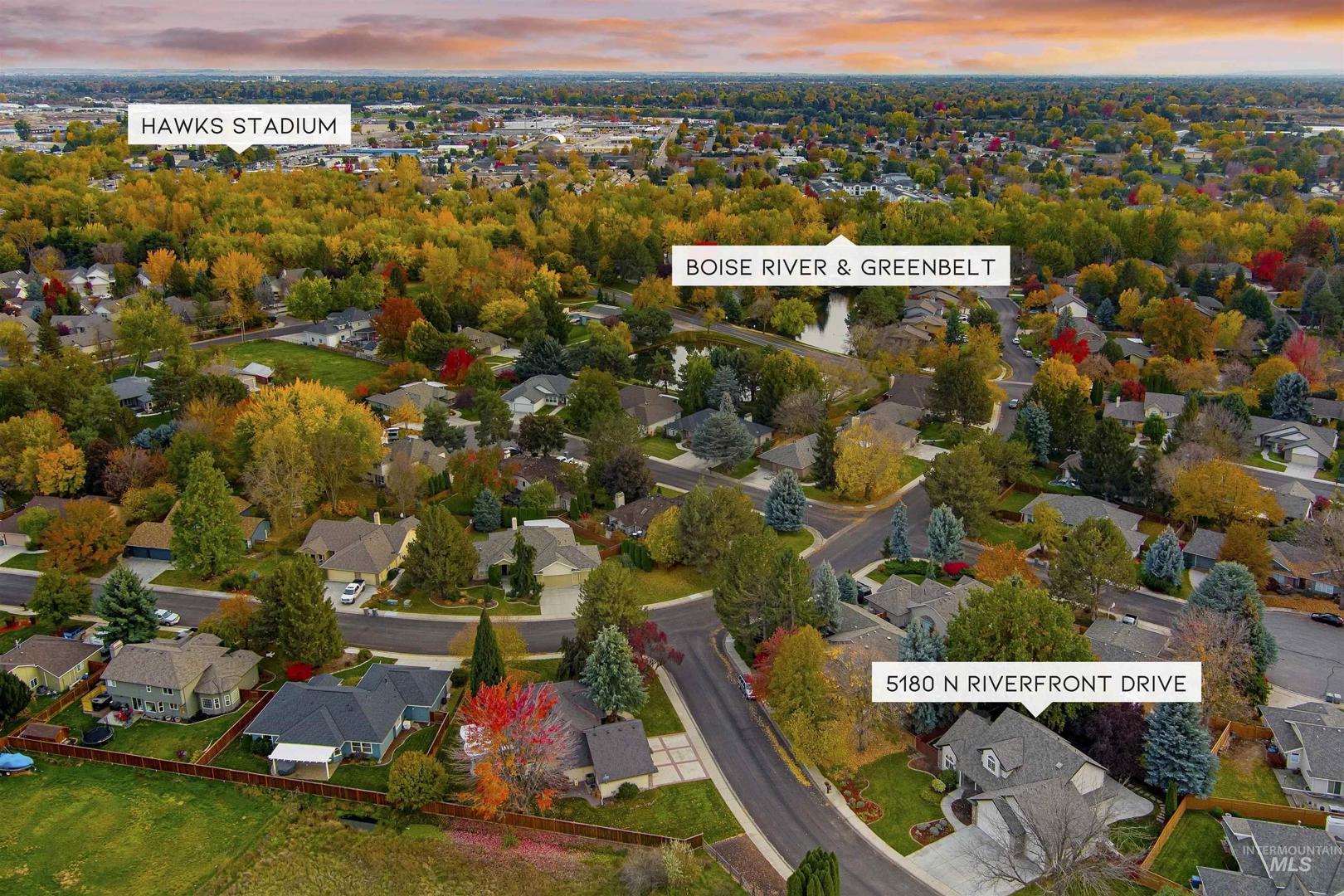 Incredible access to the best of Boise & Garden City! This warm & inviting residence is set in the coveted Riverside Village nestled beside the Boise River and Greenbelt providing premier main-level living in a serene park-like setting. Greeted by a covered porch you’ll find rich engineered flooring w/ an open-concept living area, soaring vaulted ceilings w/ a beautiful wall of windows punctuated by a gas fireplace offering a cozy retreat. The well-appointed kitchen boasts honey-oak cabinetry w/ solid granite countertops, tile & river rock backsplash, SS appliances w/ built-in microwave, pantry and breakfast bar. A large garden window set along the kitchen sink overlooks a 30’ x 22’ stamped concrete patio w/ hot tub hook-up and private backyard. The spacious main-level primary suite affords tranquility & comfort w/ the jetted jacuzzi tub, large shower, dual vanity sinks, and walk-in closet. A built-in desk adjoins the dining area & powder room, and the office features glass French doors and could also be used as formal dining. The upper-level hosts three additional bedrooms, full bathroom w/ dual vanity sinks, granite countertops, large tub w/ shower & skylight, and an unfinished ~200sf storage space that could easily be converted into a secondary ensuite bath. A fully finished, oversized 3-car garaged offers tall ceilings, epoxied floors and ample built-in cabinets & work benches.
