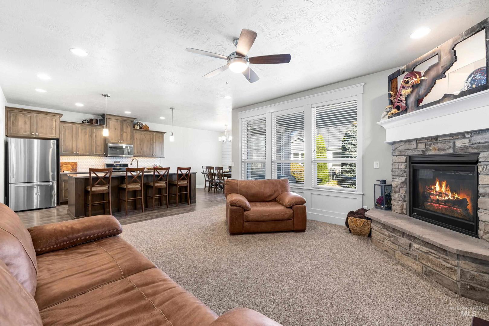Gorgeous Custom Home with a Rare 5-Car Garage! Welcome to this stunning custom-built home in the highly sought-after Mineral Springs subdivision, offering 4 bedrooms, 2.5 baths, and over 2,700 sq ft of beautifully designed living space. The spacious open floor plan is perfect for entertaining, featuring a chef’s kitchen with a large island, quartz countertops, an oversized pantry with built-in outlets, & plenty of storage. The dining area boasts custom shiplap detailing and large windows that fill the home with natural light, flowing seamlessly into the inviting living room centered around a cozy stone fireplace. A dedicated home office just off the entry makes working from home effortless. Enjoy year-round comfort with dual-zone HVAC. Retreat to the primary suite, featuring a spa-inspired bathroom with a walk-in shower, dual vanities, and a generous walk-in closet. The expansive bonus room is ideal for a movie or game room and comes complete with a projector & screen. Car enthusiasts & hobbyists will love the massive 5-car garage, offering extra-deep bays for vehicles, tools, & toys—spaces like this are truly rare! Outside, relax on the large covered patio overlooking a spacious backyard enclosed by wrought-iron fencing, complete with a 6-person hot tub (hot tub, projector, & screen included). This home truly has it all—style, comfort, and unmatched garage space!