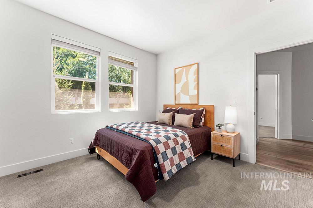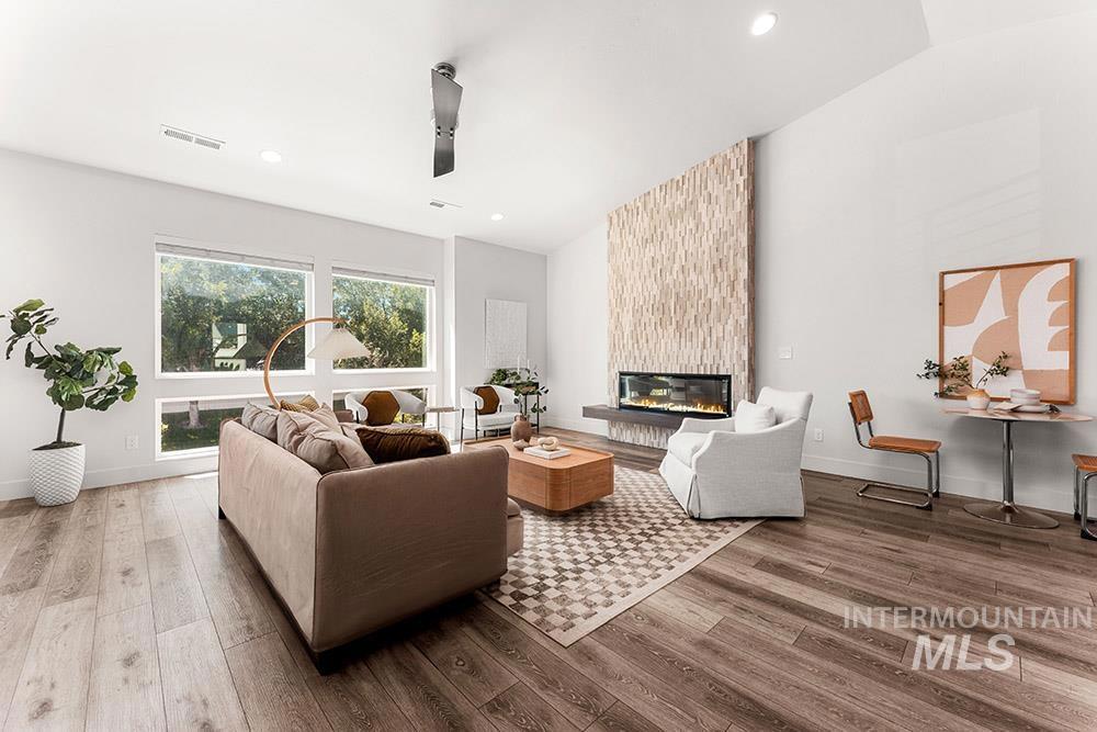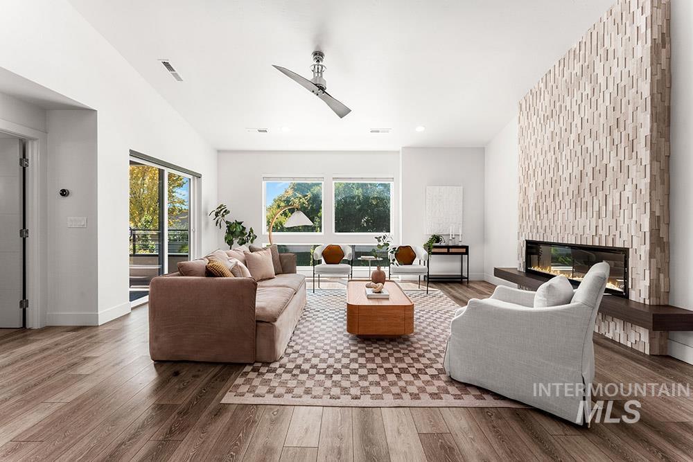 Experience effortless living in this modern zero-maintenance townhome backing to Eagle Bike Park! The spacious open-concept great room features elegant LVP flooring, a striking floor-to-ceiling stacked stone fireplace, & seamless access to a covered balcony, perfect for relaxing or entertaining. The gourmet chef’s kitchen boasts a 10’ waterfall quartz island, sleek flat-panel cabinetry, premium Café appliances including a gas range, & generous walk-in pantry. The master suite offers direct patio access, walk-in closet, & en suite bath complete with a dual-sink vanity and a frameless glass walk-in shower. Two additional large bedrooms are located on the lower level, with convenient access to a full bathroom. Enjoy the outdoors without the upkeep, HOA covers yard & exterior maintenance, allowing you to fully appreciate the expansive covered balcony & direct access to Eagle Bike & Sports Park. Explore miles of scenic biking trails, or take advantage of the home’s proximity to foothill hiking, dining, shops!