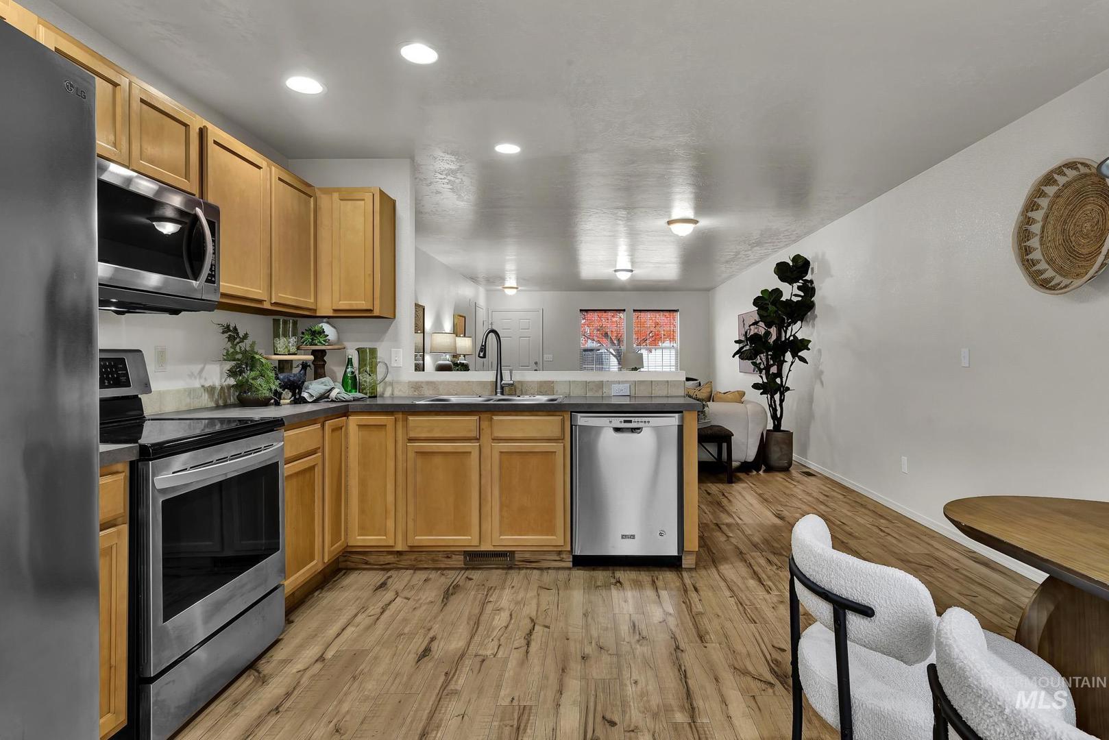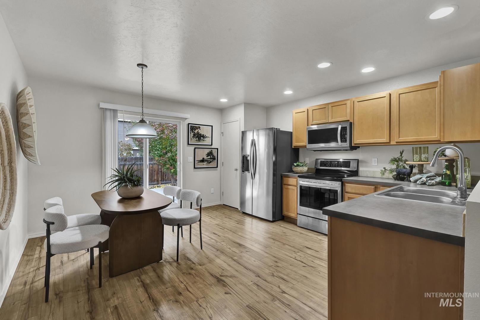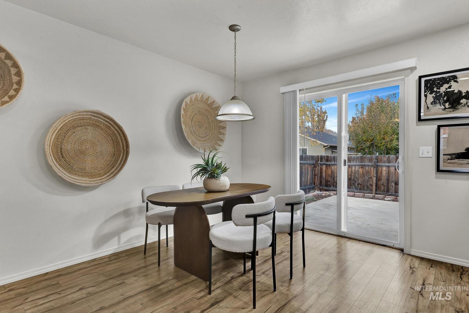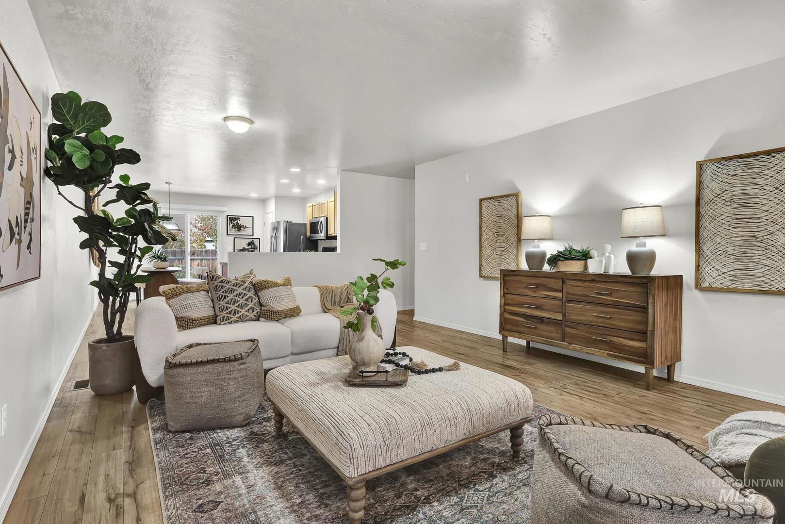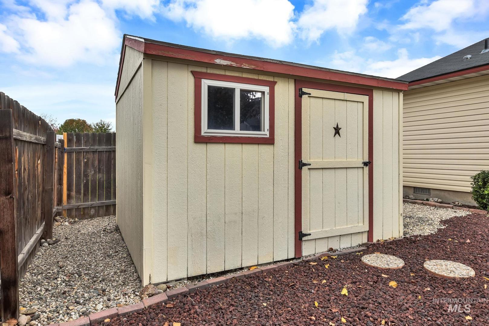 Welcome home to this move-in ready single-level in desirable Boise! Featuring an open concept layout with newer laminate flooring throughout and newer stainless-steel appliances, including fridge, washer, and dryer. Owned solar panels provide energy efficiency, while the low-maintenance backyard offers a large concrete patio, zero-scape landscaping, and a spacious storage shed. The finished garage features epoxy floors, painted walls, and a mini-split system for year-round comfort—perfect for a gym, shop, or hobby space. All toilets and faucets have been recently replaced. Located near Mariposa Park with walking paths, a fishing pond, and a fenced dog park. This home has it all at an incredible value!
