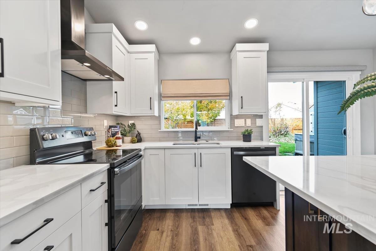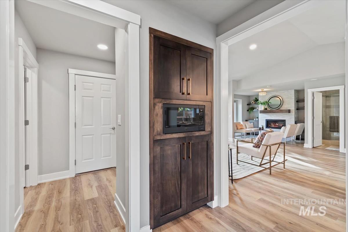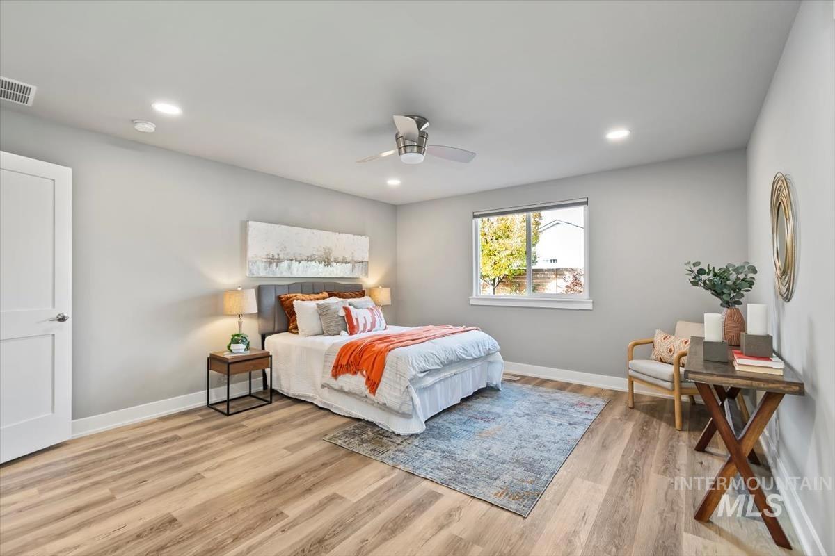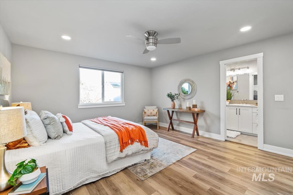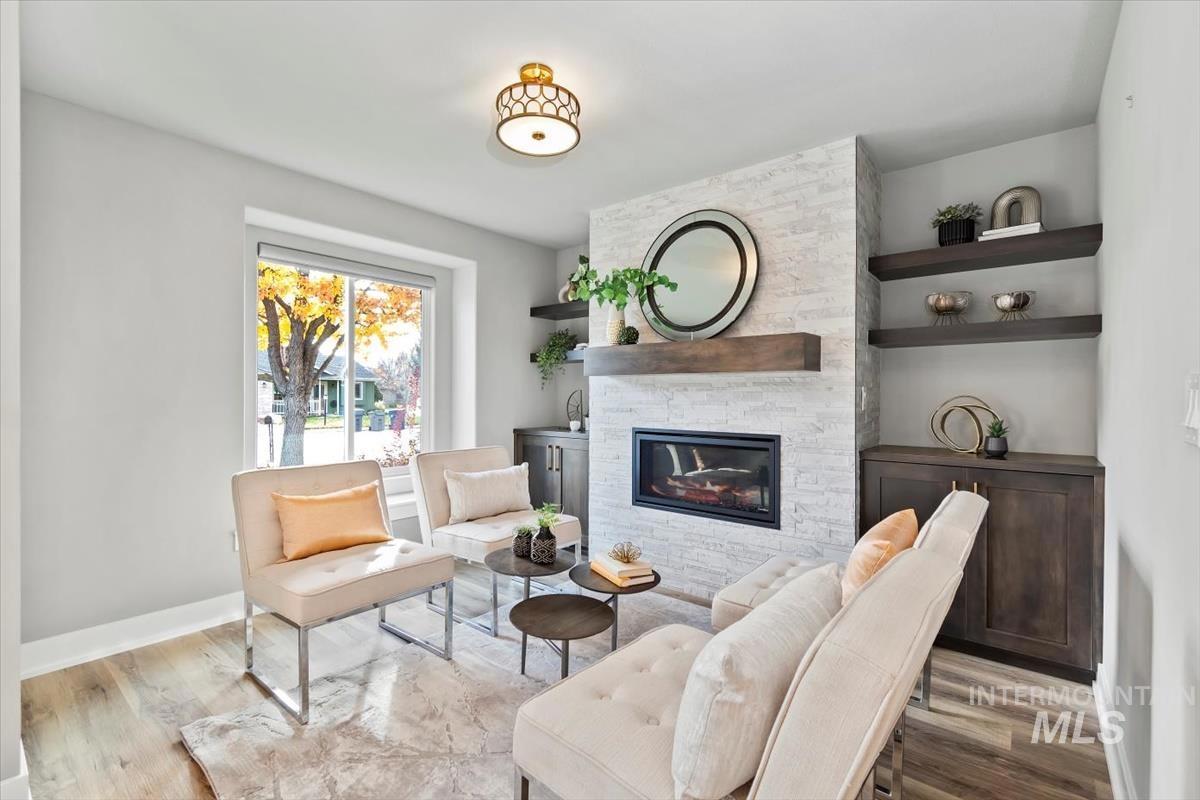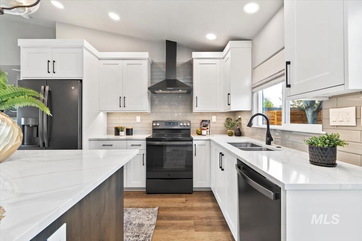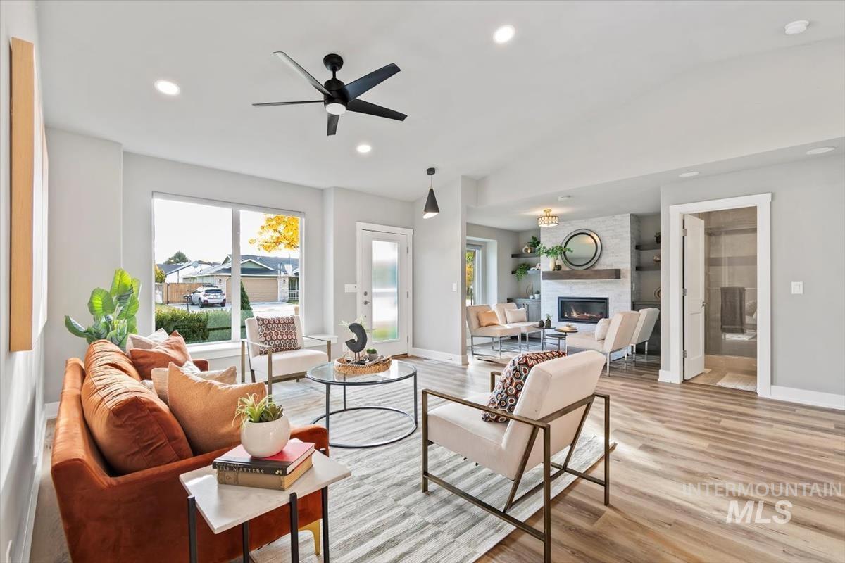 Rare gem in northwest Boise! Reimagined from the studs in 2022, this single-level stunner blends sophisticated design with modern comfort in every detail. The open great room welcomes you with vaulted ceilings, high end remote window treatments and LVP throughout. Open to the cozy den with stone-surround gas fireplace and custom built-ins with elegant gold hardware, the perfect mix of warmth and refinement. The designer kitchen showcases two-tone cabinetry, stainless steel appliances, gorgeous quartz countertops, and oversized island ready for all of your family gatherings. The primary bedroom offers a serene retreat with dual vanities, full-tile shower and a spacious walk-in closet. Step outside to your private backyard sanctuary, complete with tranquil water feature, wrap-around concrete patio, elevated sitting deck and eye catching horizontal fencing surrounded by mature landscaping. Every inch of this home has been thoughtfully curated, new roof, new windows, fresh interior and exterior paint in 2022 and clever storage solutions including built in pantry & microwave, a custom mud bench & expanded laundry with workspace and sink. Nestled in a highly desirable, established NW Boise neighborhood, this home offers turnkey living with timeless style and everyday luxury. Welcome home!