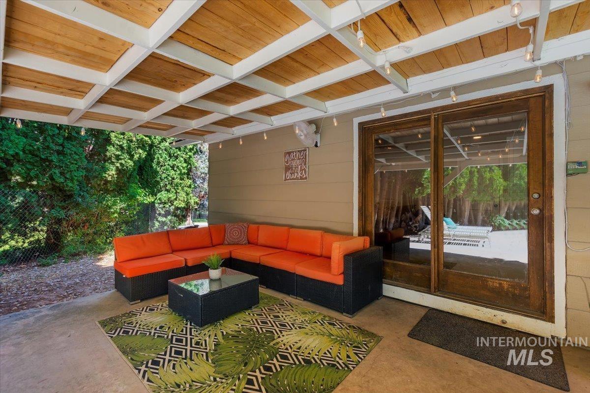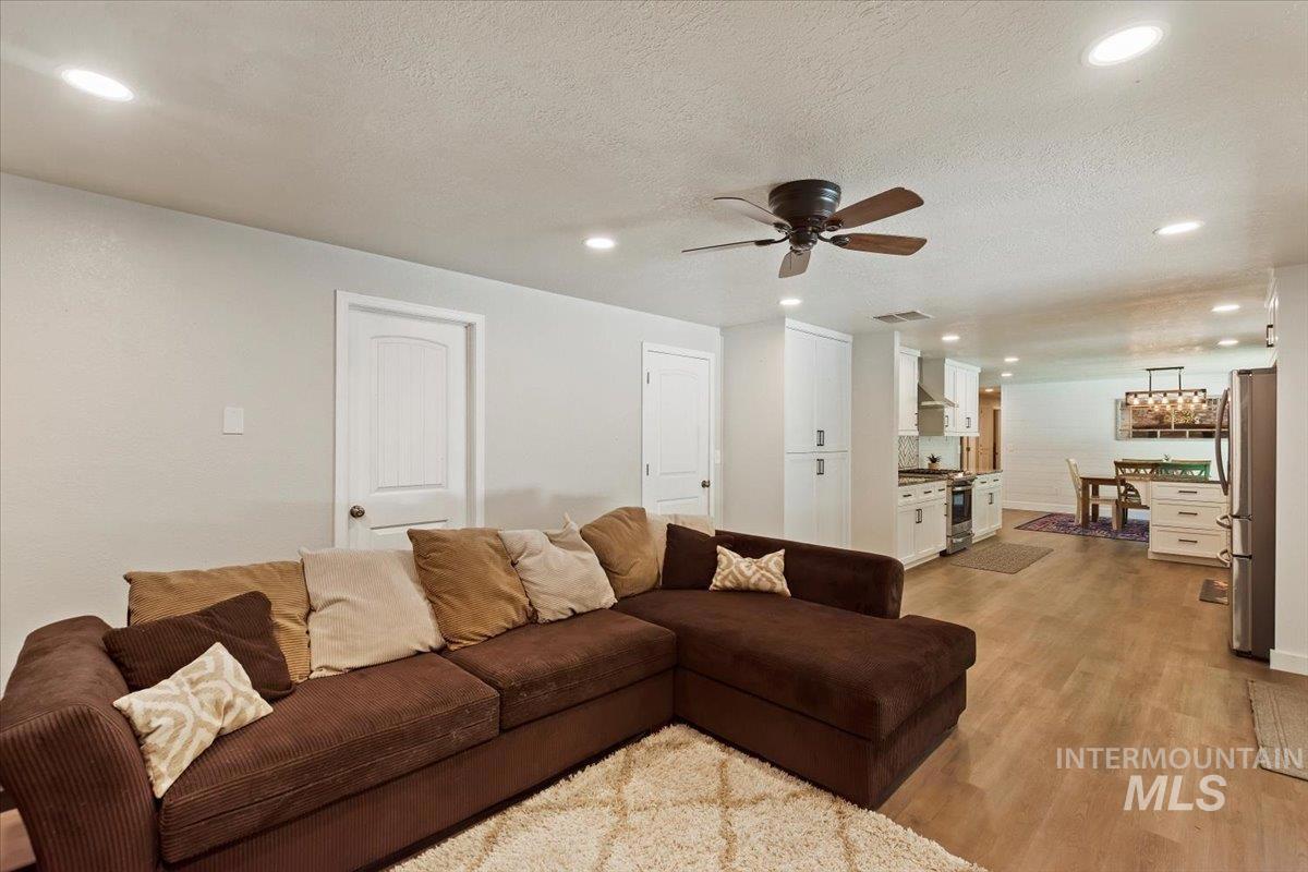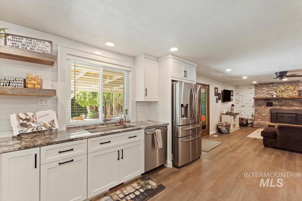 Welcome home to this beautifully remodeled single-level retreat in a quiet cul-de-sac! Step inside to an inviting open floor plan with fresh laminate flooring and a cozy wood-burning fireplace — perfect for relaxing evenings at home. The kitchen and dining area offer stunning views of the sparkling pool and backyard oasis. Spend your summers entertaining or unwinding in your private, park-like yard on a generous ~0.406-acre lot featuring mature landscaping and a covered patio. R.V. parking with a new concrete pad, power, and room for a shop provide added flexibility and storage. Major updates include a new A/C and gas furnace installed in 2019. Enjoy the best of Idaho living — space, comfort, and tranquility all in one beautiful single level home with No HOA!