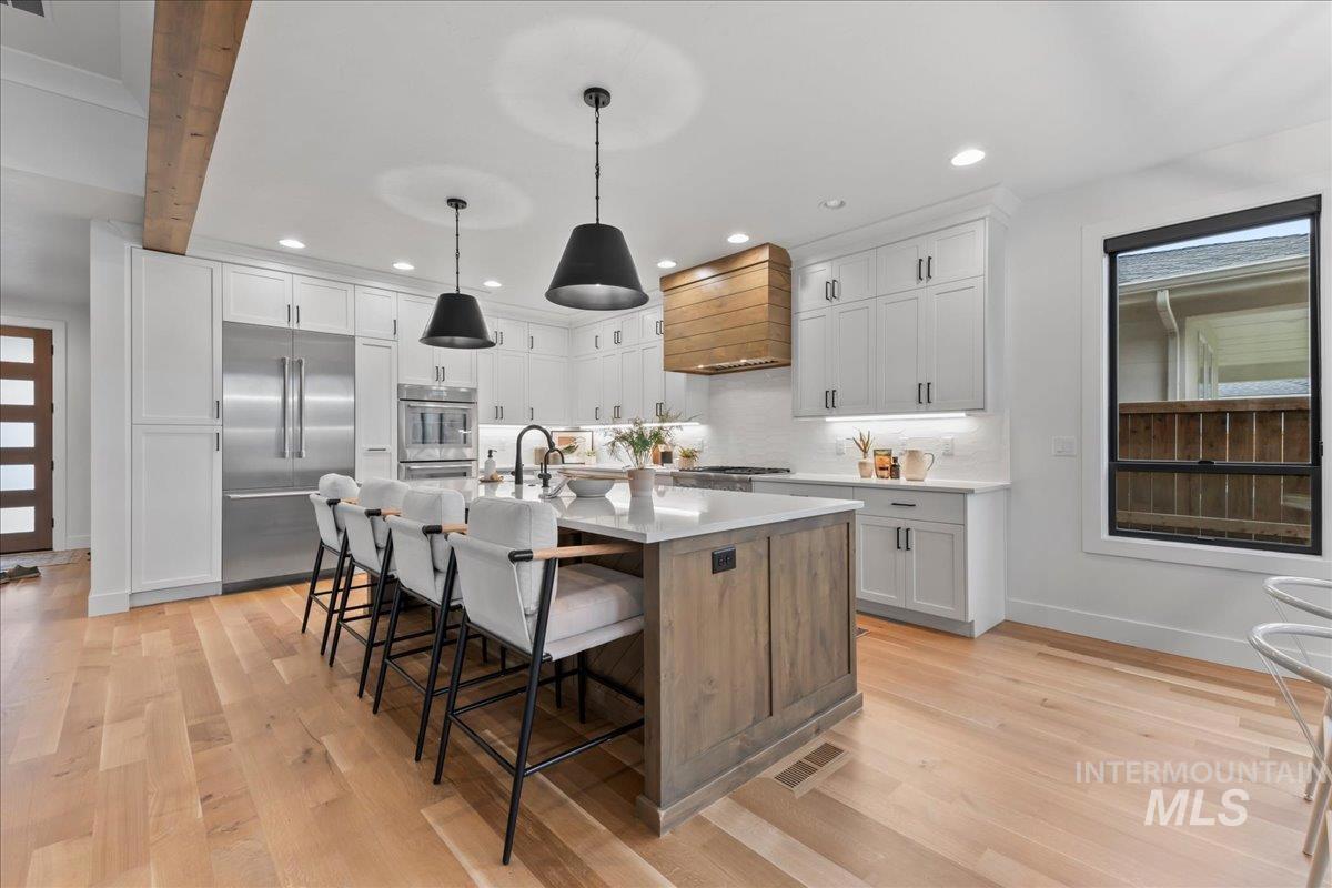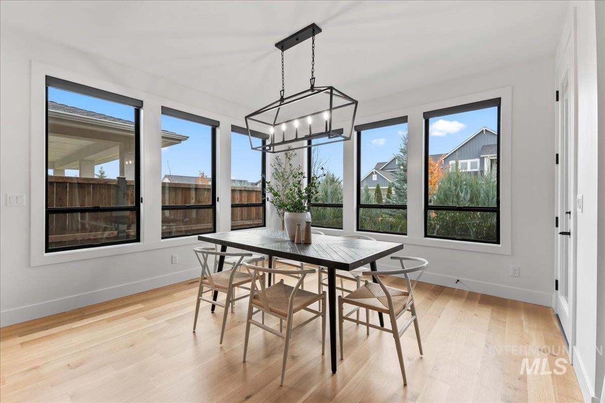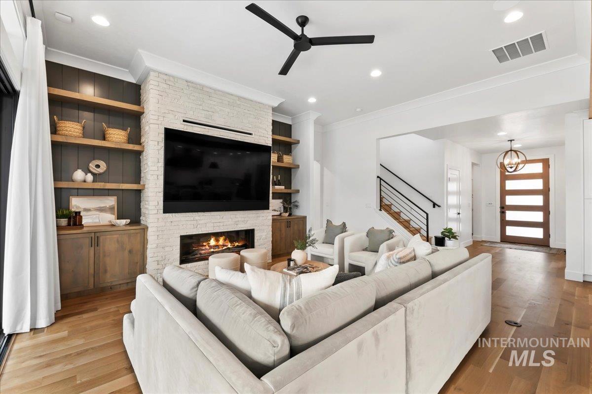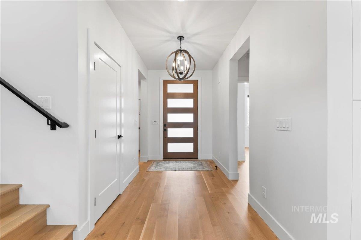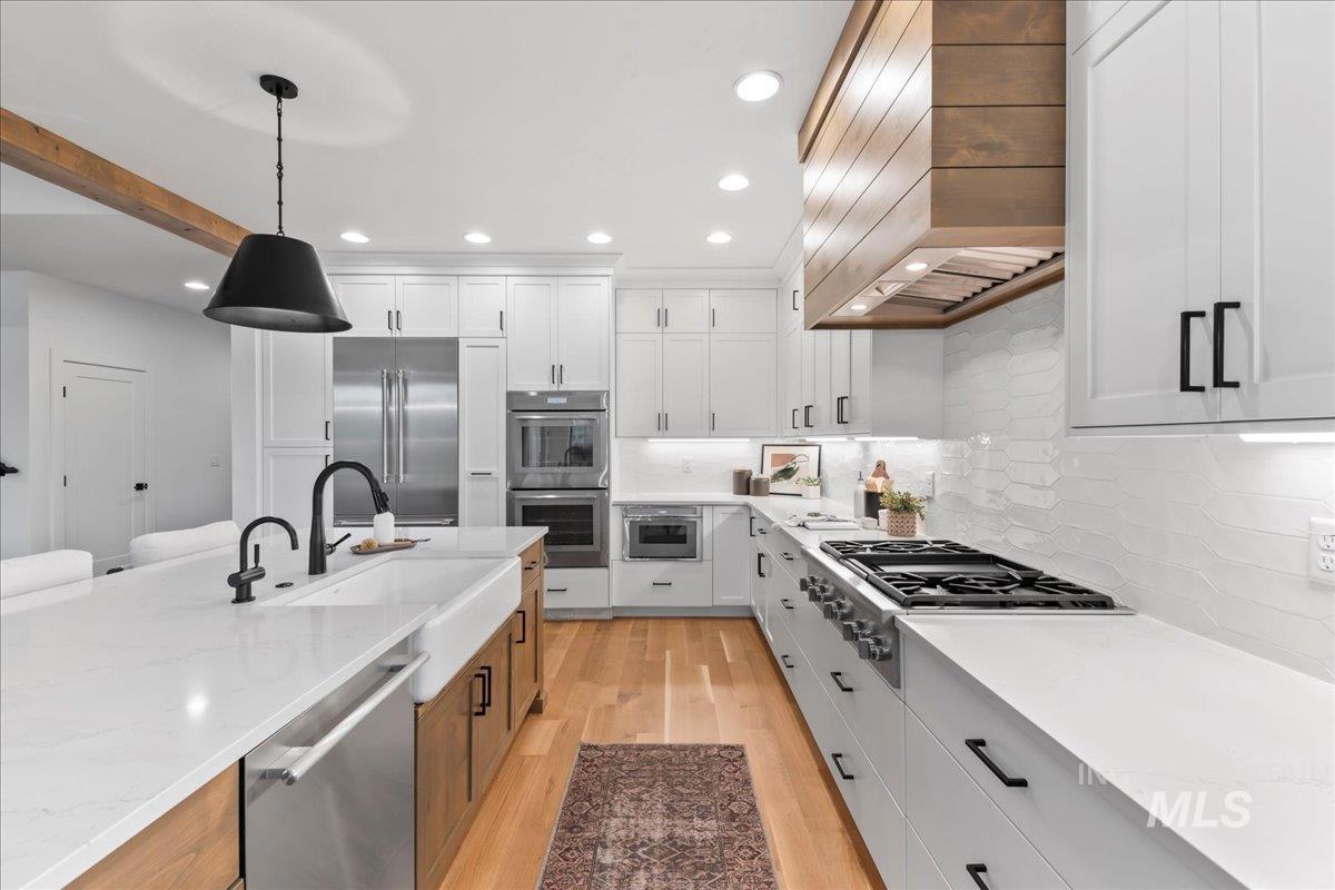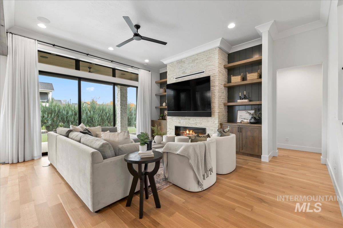 Property includes an assumable loan at 2.75% - please inquire for details! Thoughtfully designed newer-construction home by Shadow Mountain Homes in the sought-after Riverstone community. A highly functional layout with 4 bedrooms—one serving as a main-level office or guest suite adjacent to a full bathroom. An entertainer’s kitchen featuring premium Thermador appliances including built-in fridge/freezer, double ovens, and a gourmet cooktop, plus abundant cabinetry and gorgeous quartz countertops. Newly refinished cross-sawn white oak hardwoods add warmth throughout. The great room offers full wall sliders for seamless indoor/outdoor living and entertaining. Spacious primary suite with heated tile floors. Oversized 4 car garage with built-in storage. Low-maintenance backyard with professional turf, extensive landscaping for privacy, and a serene hot tub with gazebo. Riverstone sits along the Boise River with walking paths, stocked ponds, and an exceptional clubhouse and pool.