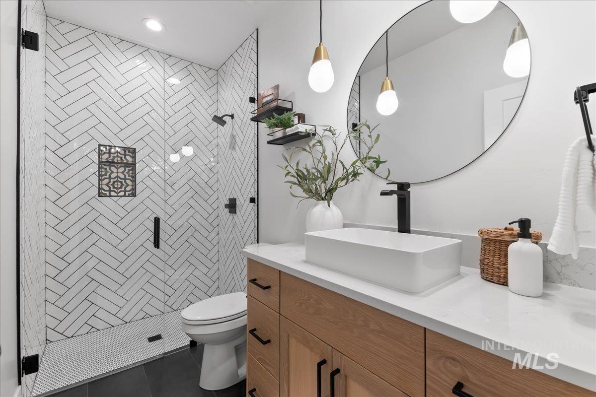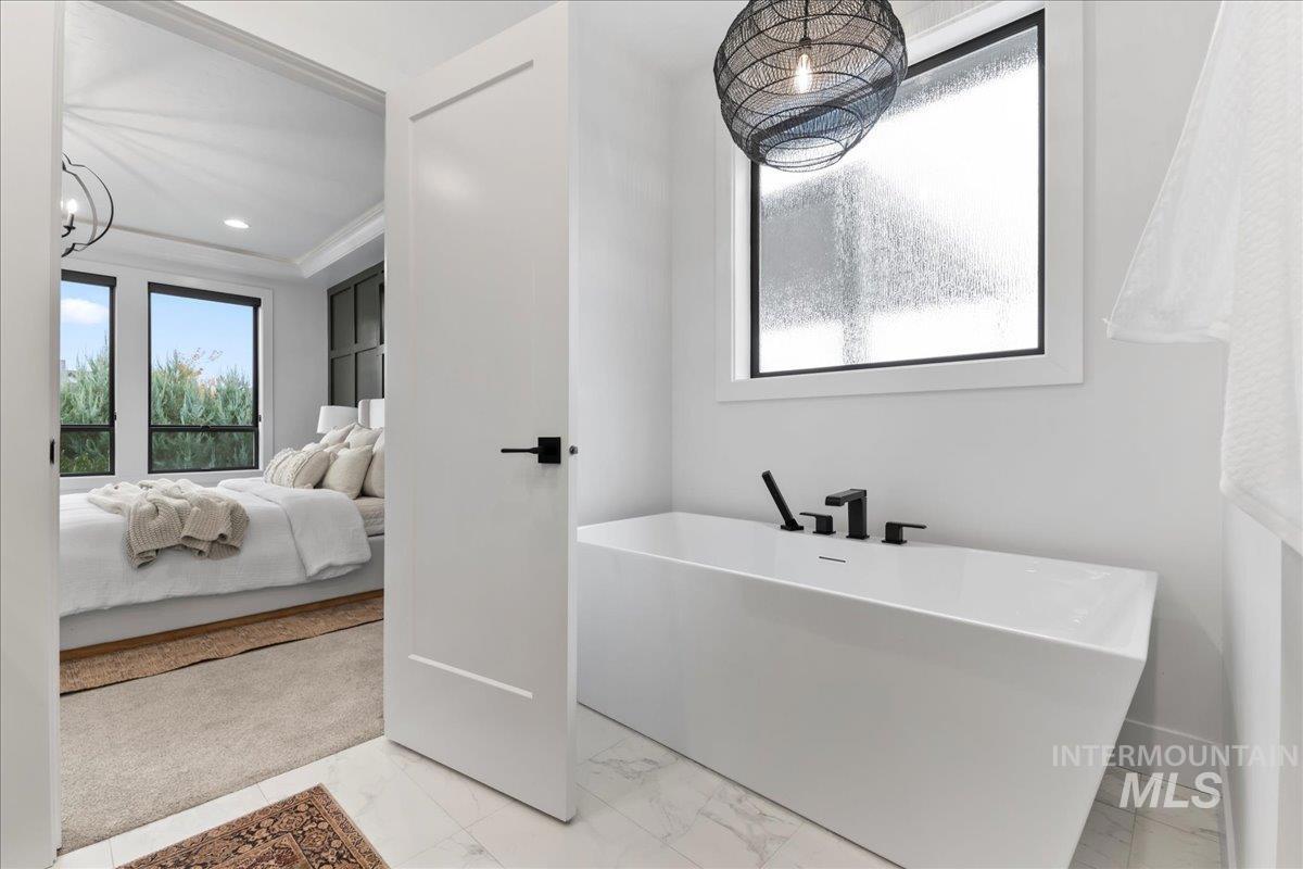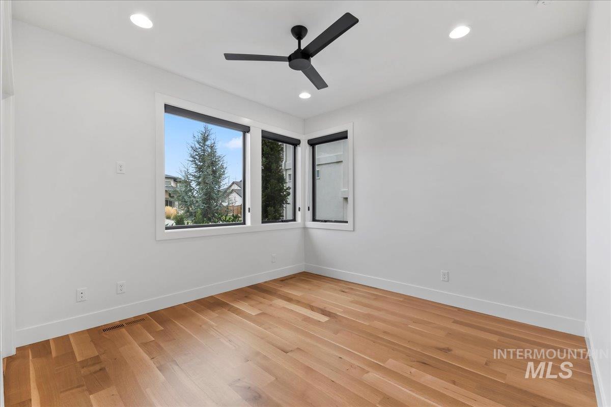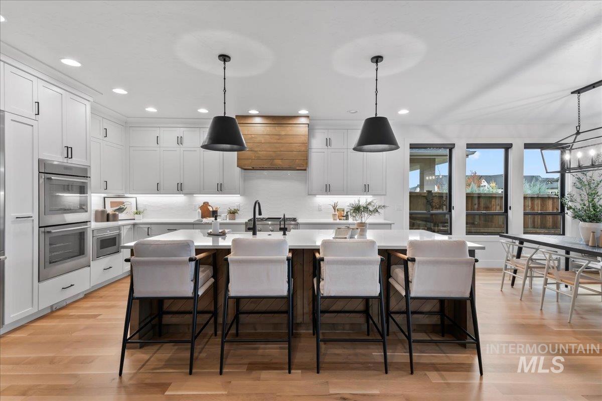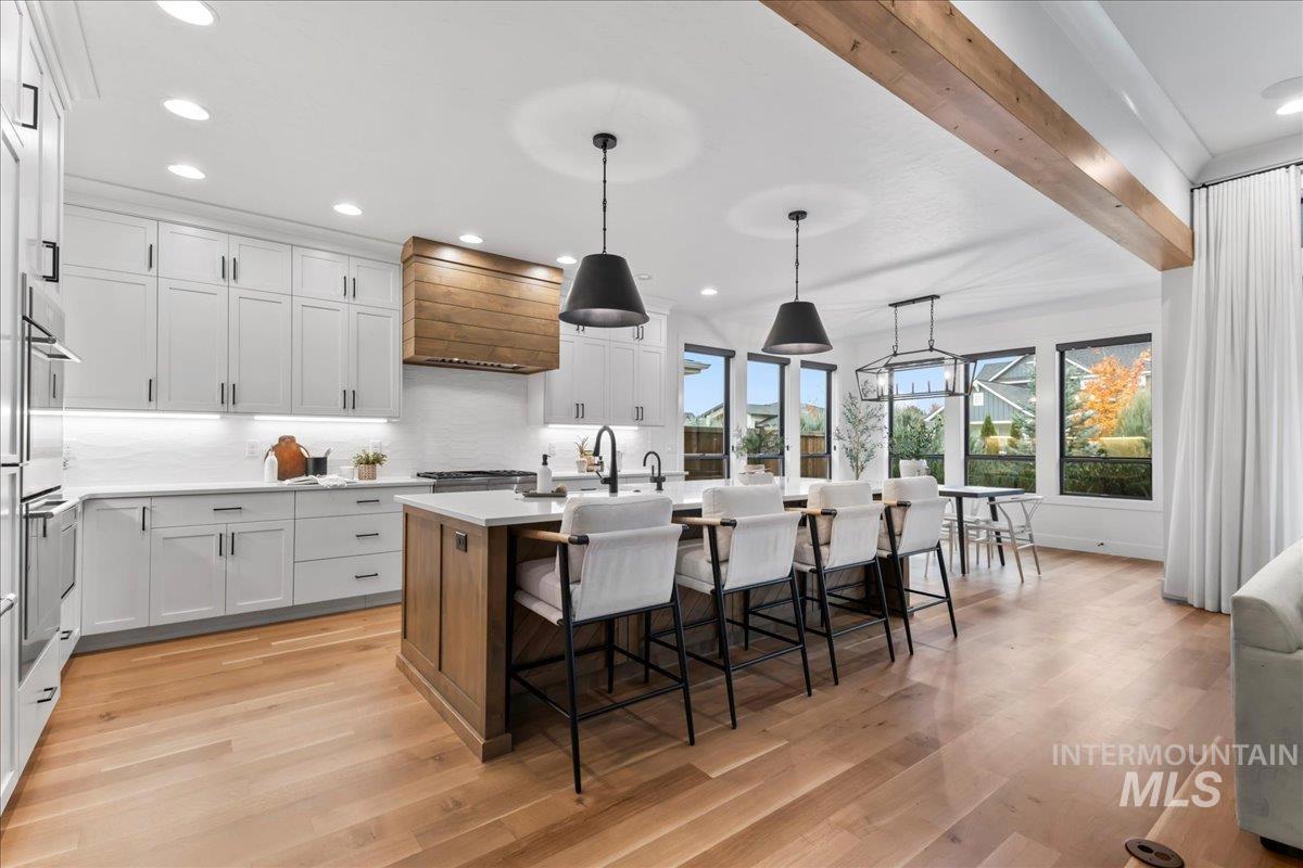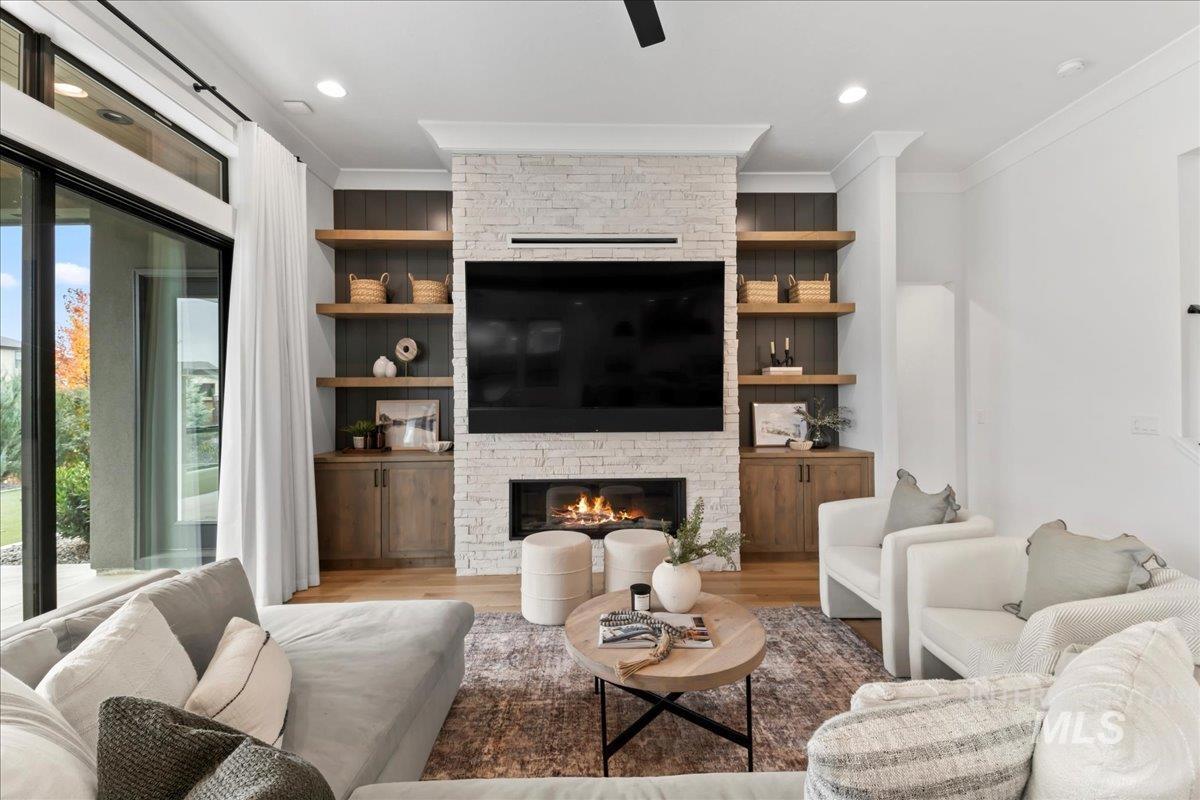 Property includes an assumable loan at 2.75% - please inquire for details! Thoughtfully designed newer-construction home by Shadow Mountain Homes in the sought-after Riverstone community. A highly functional layout with 4 bedrooms—one serving as a main-level office or guest suite adjacent to a full bathroom. An entertainer’s kitchen featuring premium Thermador appliances including built-in fridge/freezer, double ovens, and a gourmet cooktop, plus abundant cabinetry and gorgeous quartz countertops. Newly refinished cross-sawn white oak hardwoods add warmth throughout. The great room offers full wall sliders for seamless indoor/outdoor living and entertaining. Spacious primary suite with heated tile floors. Oversized 4 car garage with built-in storage. Low-maintenance backyard with professional turf, extensive landscaping for privacy, and a serene hot tub with gazebo. Riverstone sits along the Boise River with walking paths, stocked ponds, and an exceptional clubhouse and pool.