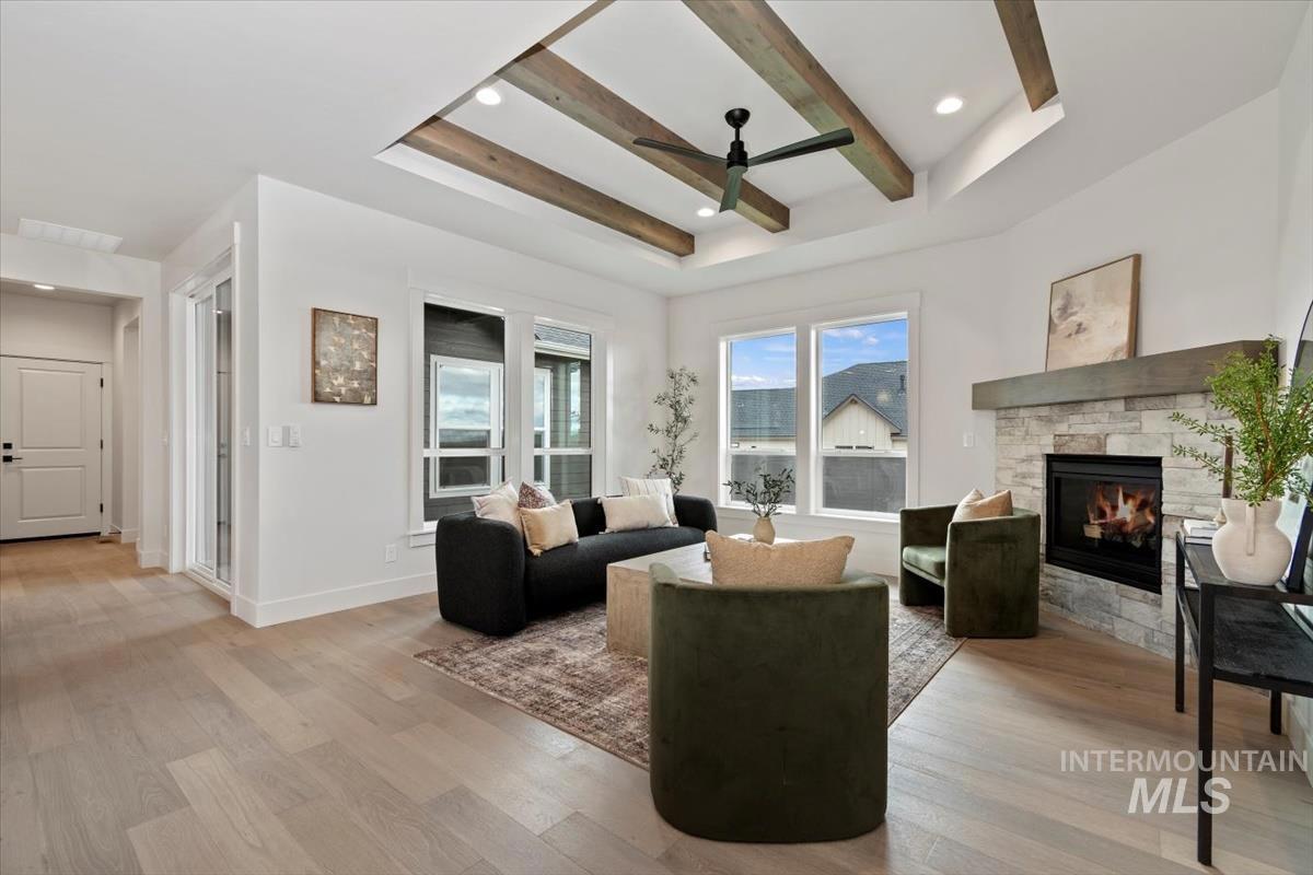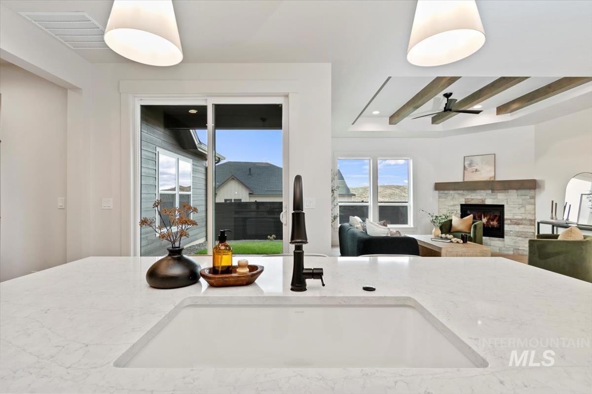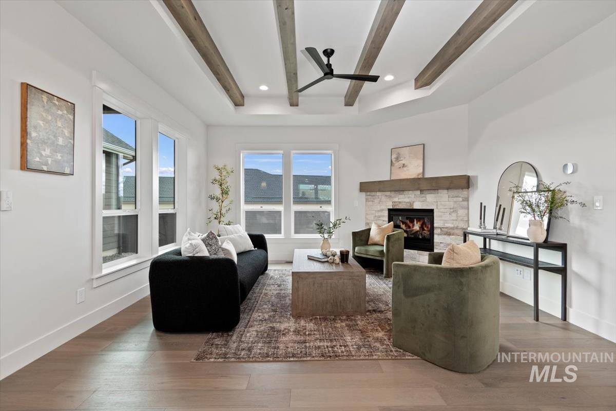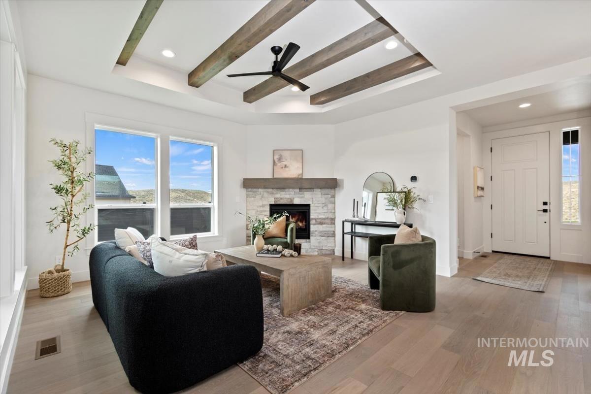 Welcome to Tresidio Homes, Orchid floor plan in the highly desirable new Eagle community Valnova. This premier new foothill community offering unmatched amenities including a sparkling lake with sandy beach, resort-style pool, modern gym, pickleball and tennis courts, and scenic parks. This stunning 1,650 sq ft home boasts 3 bedrooms, 2 baths, and a 2-car garage. Inside, enjoy elegant wood flooring in main areas, a spacious great room with striking wood beam accents, and chef-inspired Bosch appliances in the gourmet kitchen with quartz counters. Perfect for entertaining or relaxing, this home blends style, comfort, and functionality in a vibrant, active neighborhood. Experience the best of foothill living at Valnova!