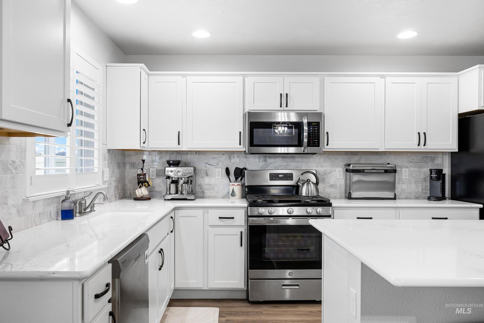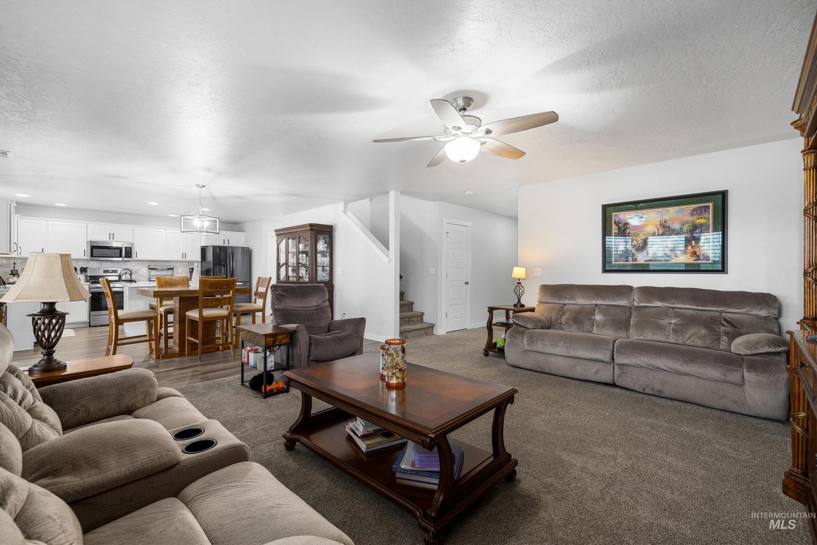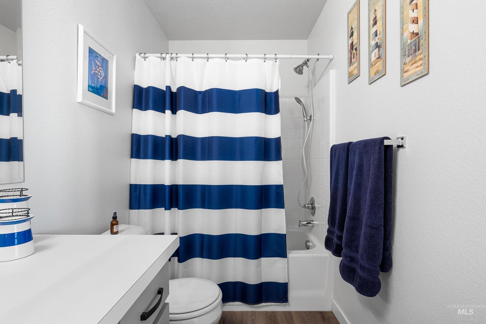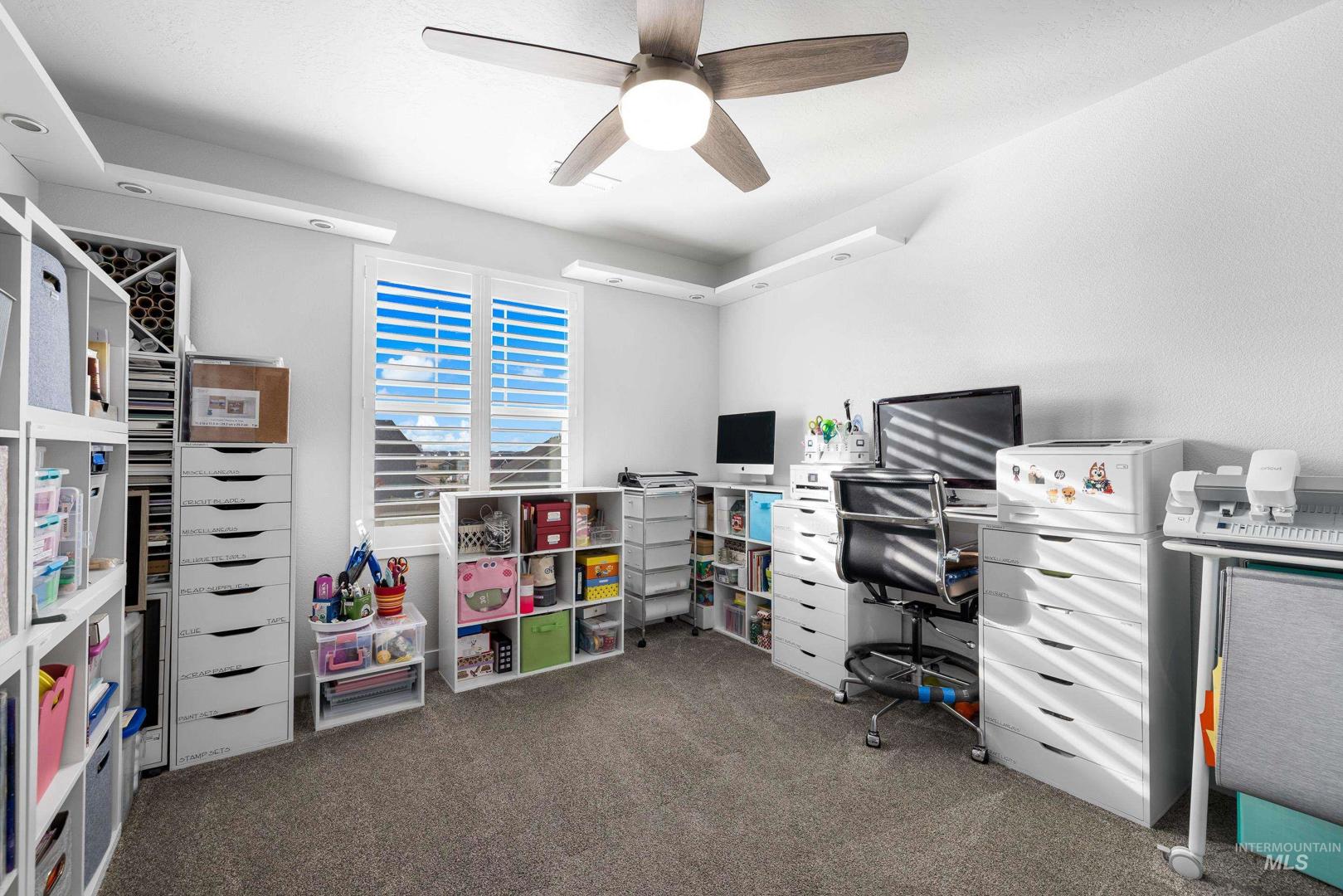 Better than new and beautifully maintained, this Meridian two story stands out with over $50,000 in custom upgrades, including upgraded counters, an extended covered patio with expanded concrete, wood shutters, a large matching shed, and a fully landscaped yard. Every detail has been thoughtfully chosen, creating a home that feels elevated and comfortable the moment you walk in. The main level features an inviting open layout where the kitchen, dining, and living areas flow together effortlessly. It is perfect for hosting, gathering, or simply enjoying everyday life. A versatile downstairs flex room adds even more possibilities, whether you need an office, playroom, workout space, or creative corner. Upstairs, all bedrooms are positioned around a spacious loft that functions beautifully as a second living area or work from home retreat. The spacious primary suite offers a peaceful escape complete with a generous en suite bathroom and a truly impressive walk in closet. Outside, the extended patio and fully landscaped yard blend indoor comfort with outdoor relaxation and create an ideal space to unwind or entertain. With a smart floor plan, exceptional condition, and abundant flexible spaces, this home makes it easy to love where you live.