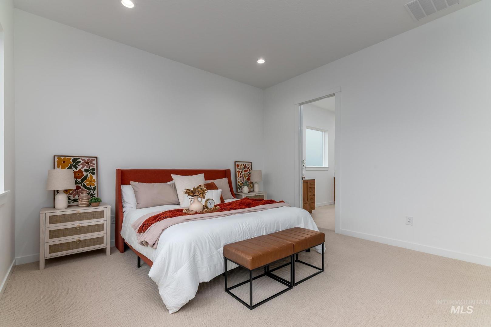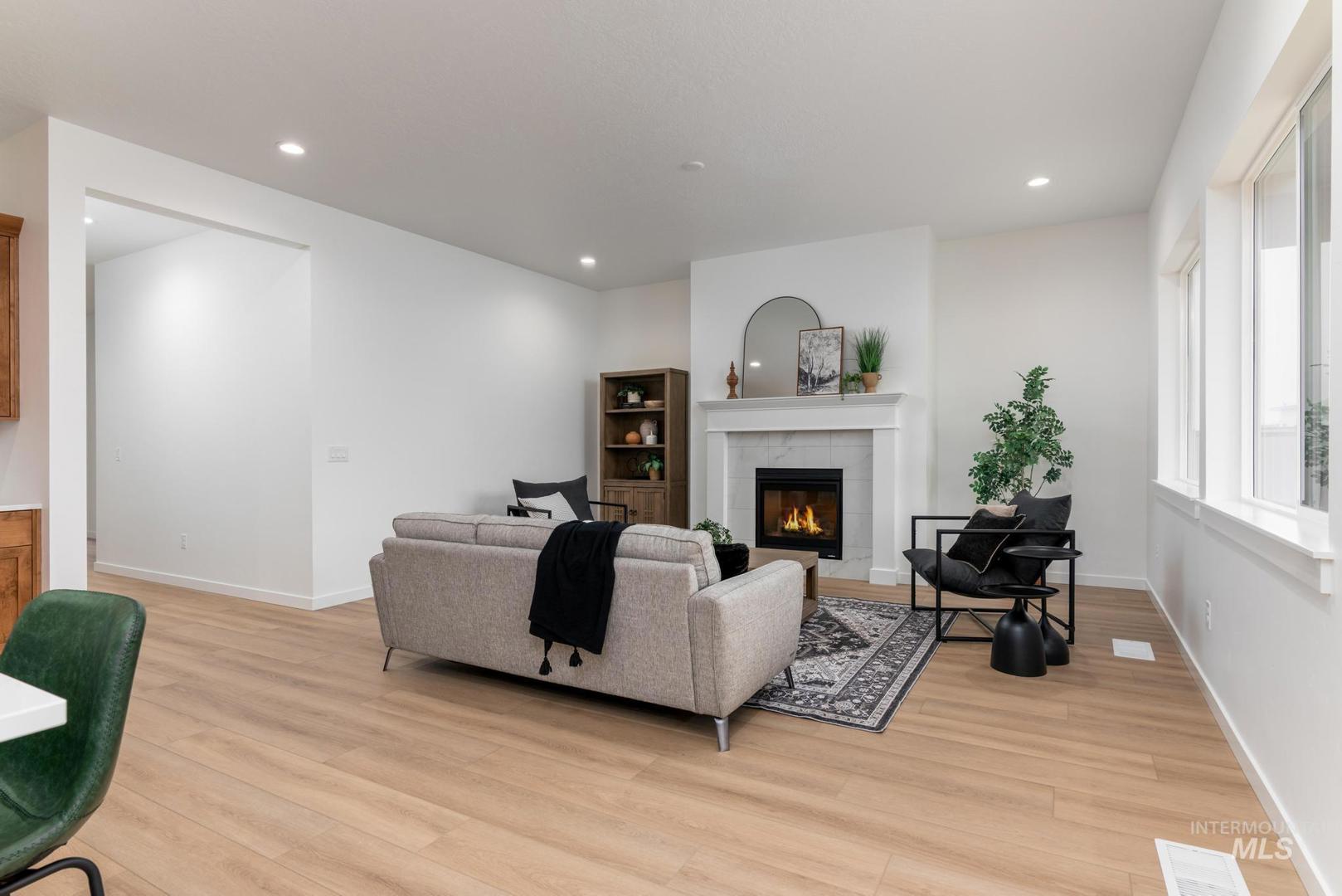 "The Bannock" exudes contemporary comfort and functionality, exemplified by its thoughtfully crafted single-story layout. A long foyer sets the stage, leading to a spacious great room seamlessly connected to the kitchen, casual dining area, and covered patio—an ideal setting for gatherings and relaxation. The kitchen is centered around a striking large center island and enhanced by its expansive walk-in pantry. The primary bedroom suite, nestled in the rear of the home, features a serene sanctuary complete with a luxurious walk-in closet and a primary bath with separate vanities, and a luxe shower. Off the foyer, you`ll find a private home office, powder bath and two secondary bedrooms with shared hall bathroom offering privacy and comfort. 3 car garage. Front and rear landscape included. Home is under construction and photos are similar. BTVAI