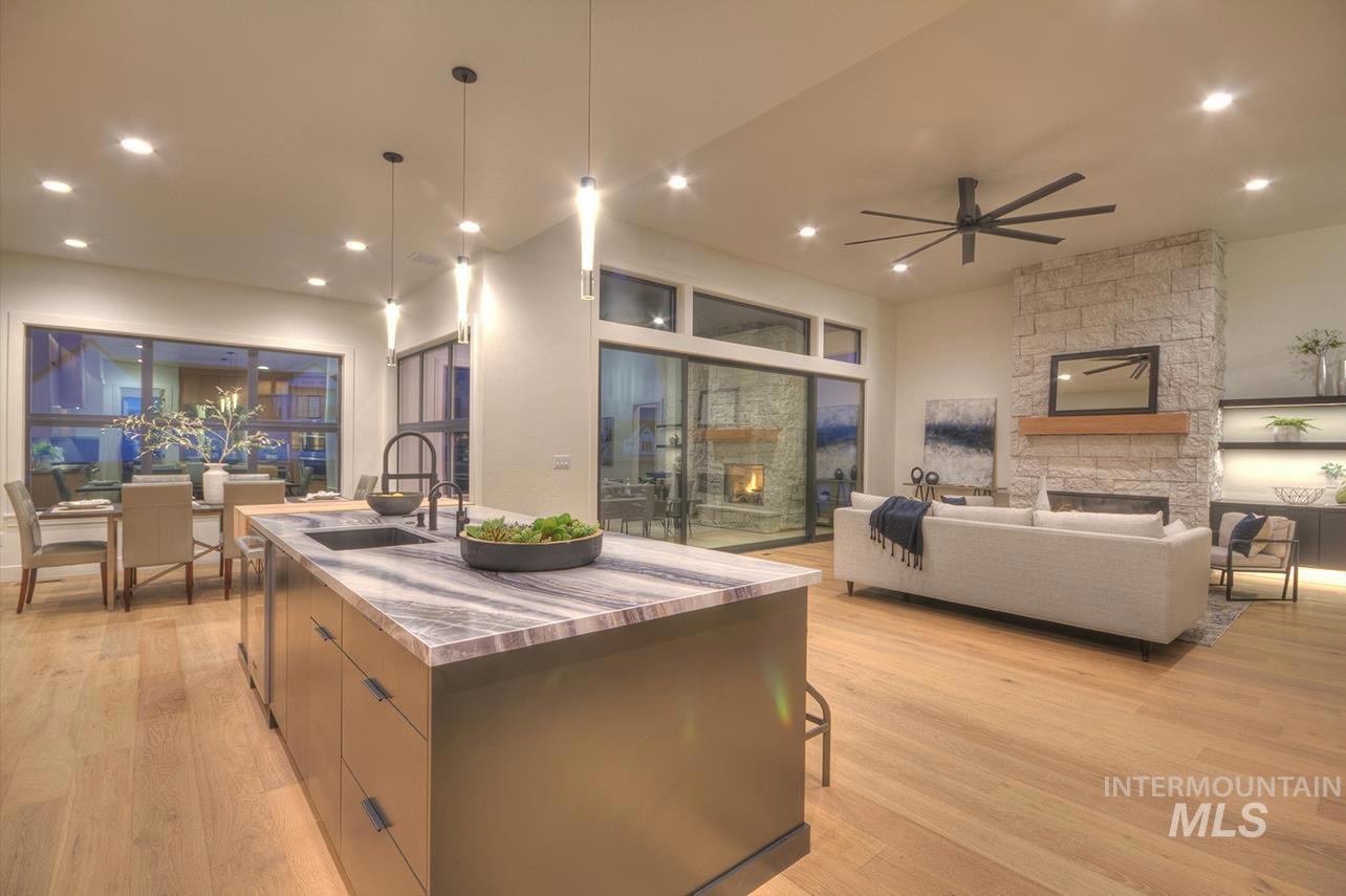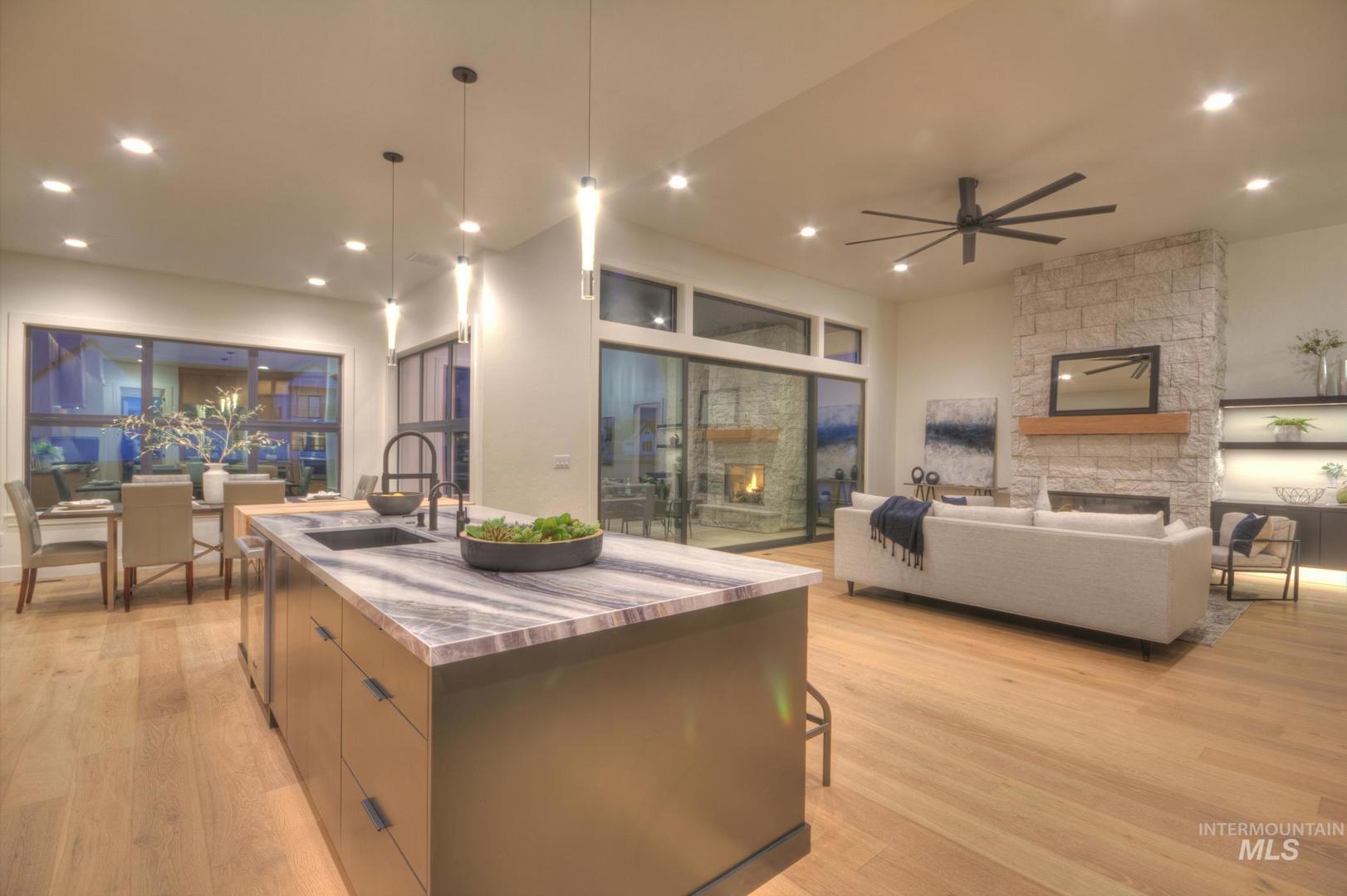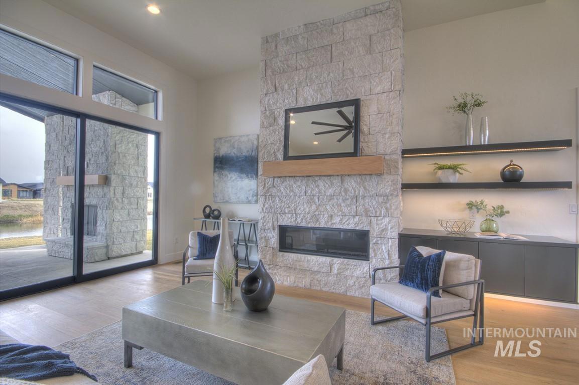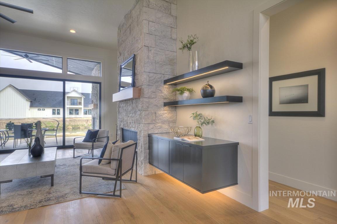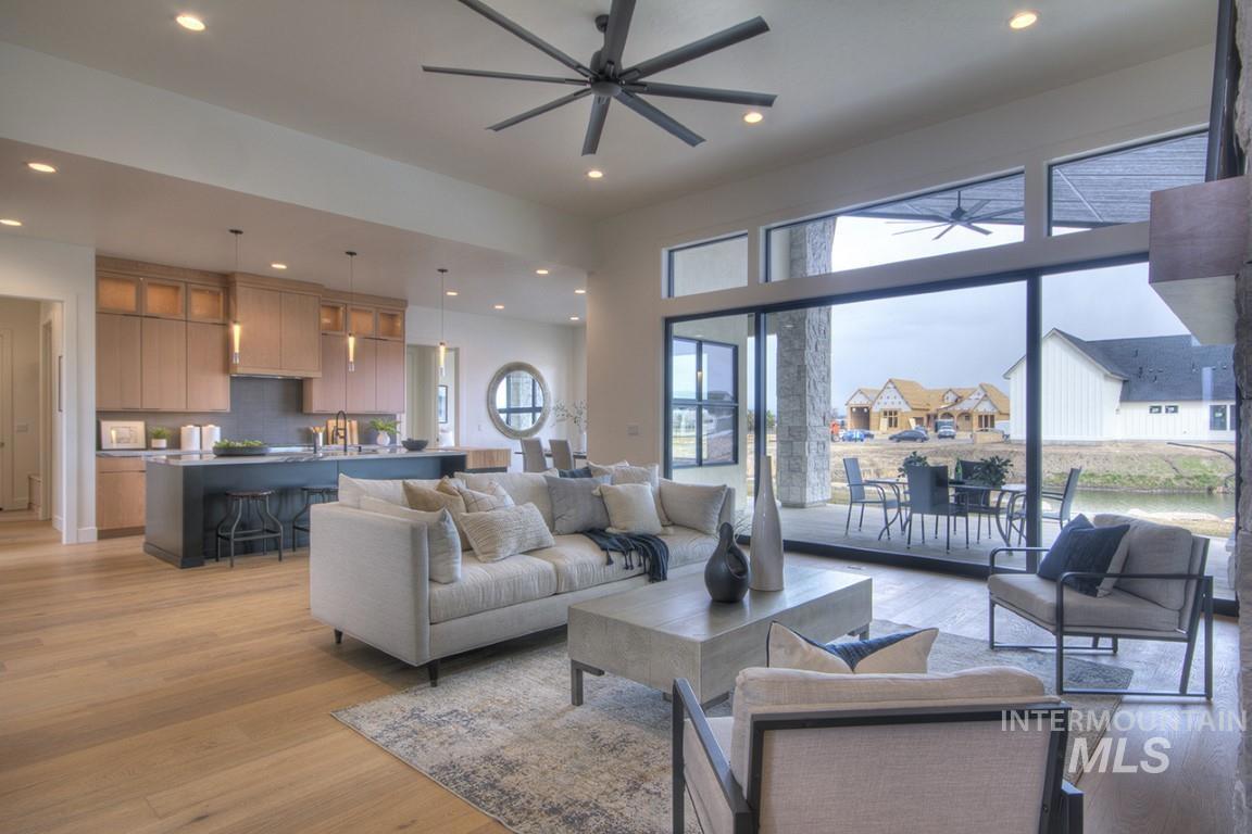 Beautiful modern contemporary waterfront home with an east-facing backyard. Ideally located just one minute from downtown Middleton amenities, five minutes to freeway access, and an easy commute to downtown Boise. Features include a spacious, fully insulated 2-car garage plus a 44` RV bay, and a convenient dog wash ideal for active lifestyles. The open-concept floor plan highlights a well-appointed kitchen with double ovens, custom butcher block, and an oversized refrigerator. The primary bath offers heated floors and a walk-in, dual-station shower with body jets and no glass for a clean, luxurious design. Oversized laundry room with extensive custom cabinetry and a true butler’s pantry complete with built-in shelving, beverage cooler, sink, and garbage disposal. The light-filled living room showcases large east-facing windows with water views. Enjoy indoor-outdoor living with a Western Window sliding system opening to a covered patio, wired for outdoor heating and featuring a stone fireplace—perfect for entertaining. Thoughtfully crafted by a builder with 34 years of experience in the Treasure Valley. A must-see home to fully appreciate all it offers.