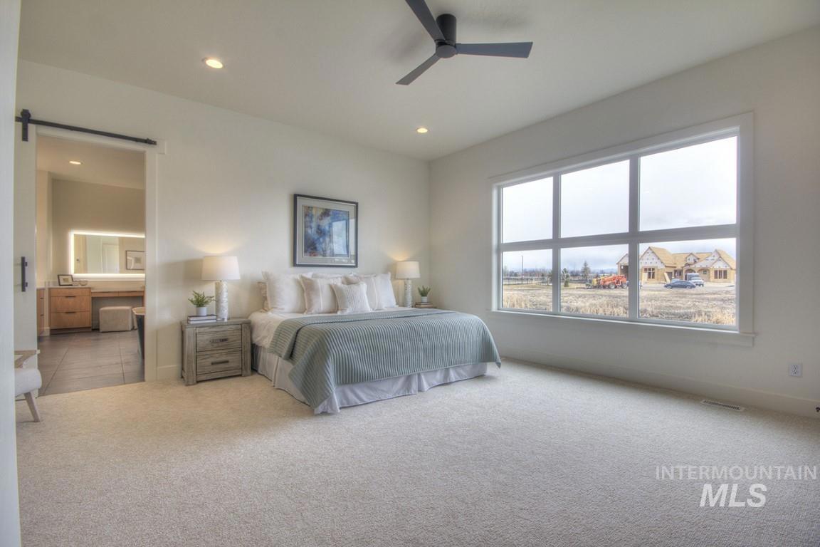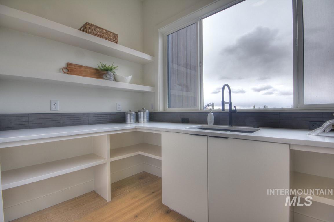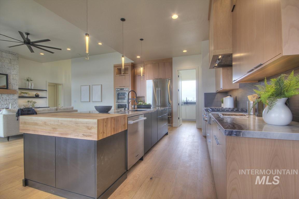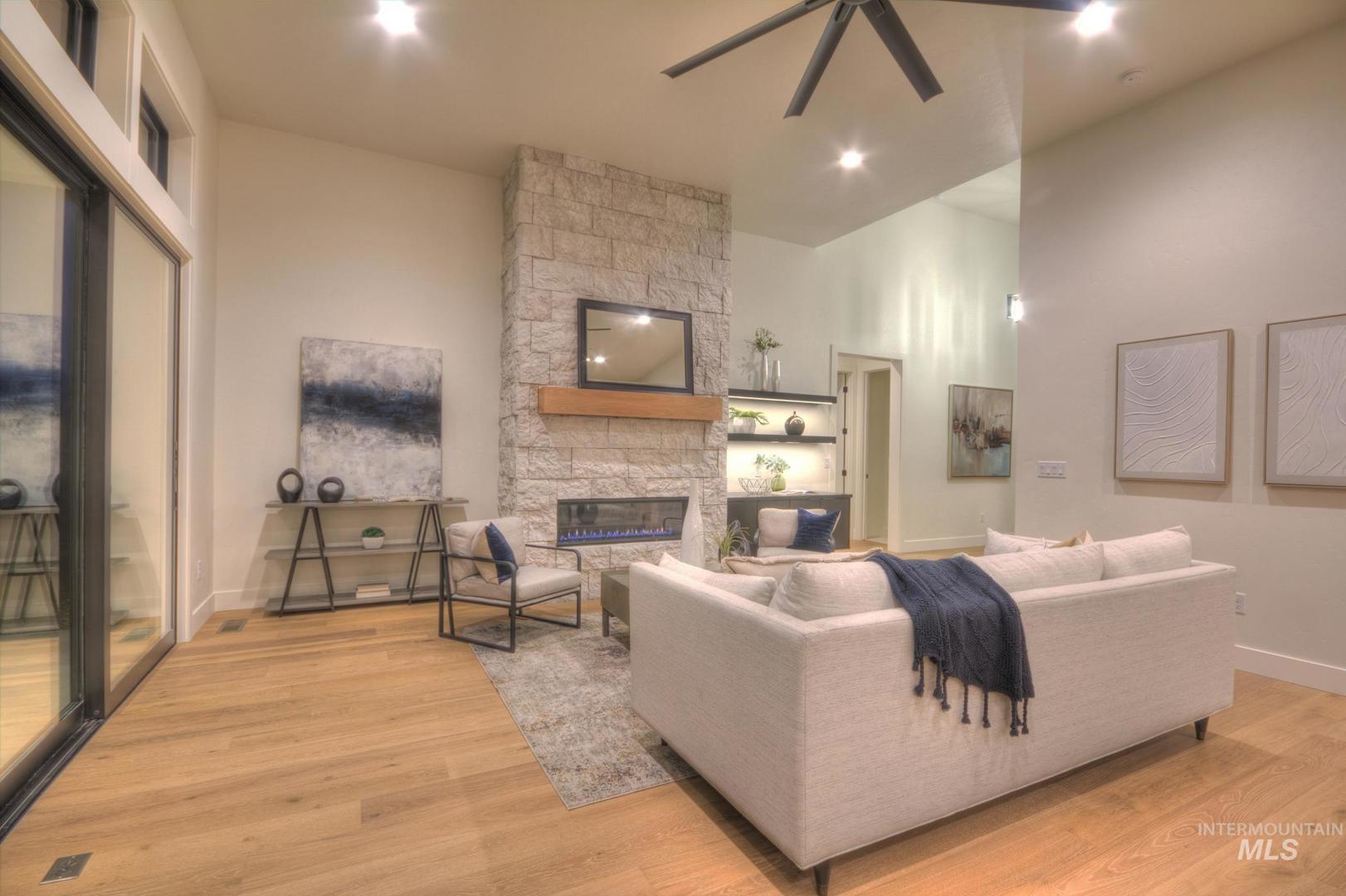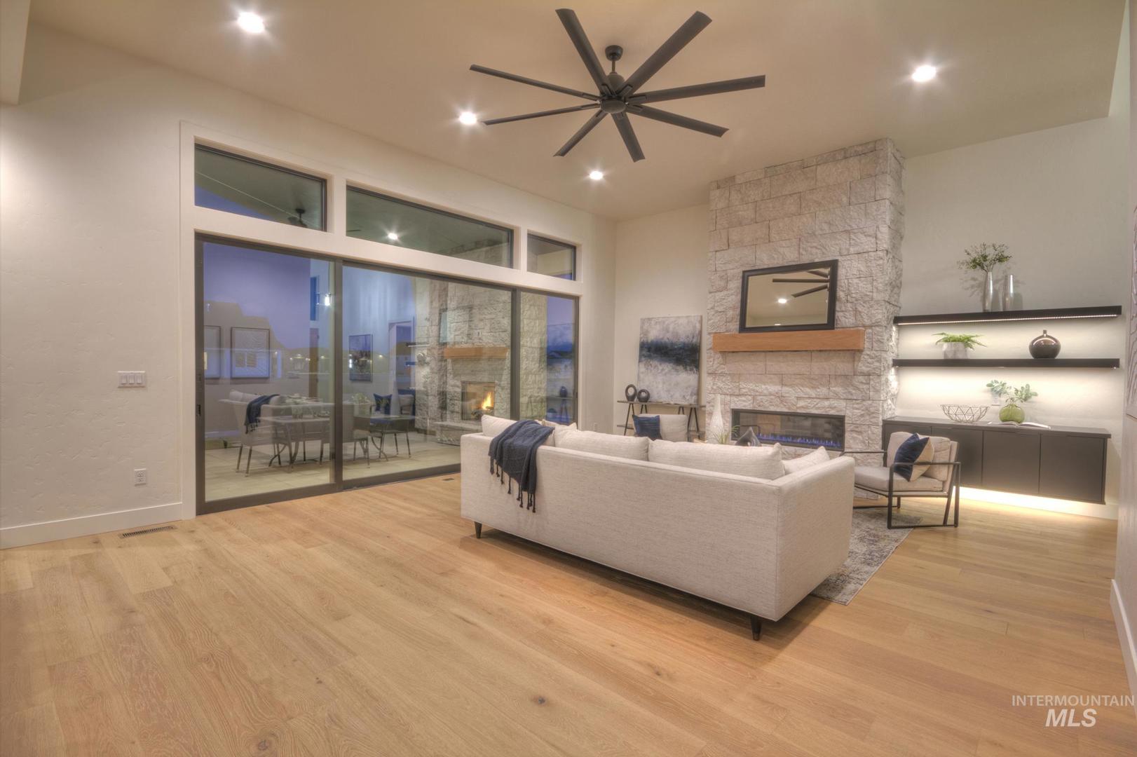 Beautiful modern contemporary waterfront home with an east-facing backyard. Ideally located just one minute from downtown Middleton amenities, five minutes to freeway access, and an easy commute to downtown Boise. Features include a spacious, fully insulated 2-car garage plus a 44` RV bay, and a convenient dog wash ideal for active lifestyles. The open-concept floor plan highlights a well-appointed kitchen with double ovens, custom butcher block, and an oversized refrigerator. The primary bath offers heated floors and a walk-in, dual-station shower with body jets and no glass for a clean, luxurious design. Oversized laundry room with extensive custom cabinetry and a true butler’s pantry complete with built-in shelving, beverage cooler, sink, and garbage disposal. The light-filled living room showcases large east-facing windows with water views. Enjoy indoor-outdoor living with a Western Window sliding system opening to a covered patio, wired for outdoor heating and featuring a stone fireplace—perfect for entertaining. Thoughtfully crafted by a builder with 34 years of experience in the Treasure Valley. A must-see home to fully appreciate all it offers.