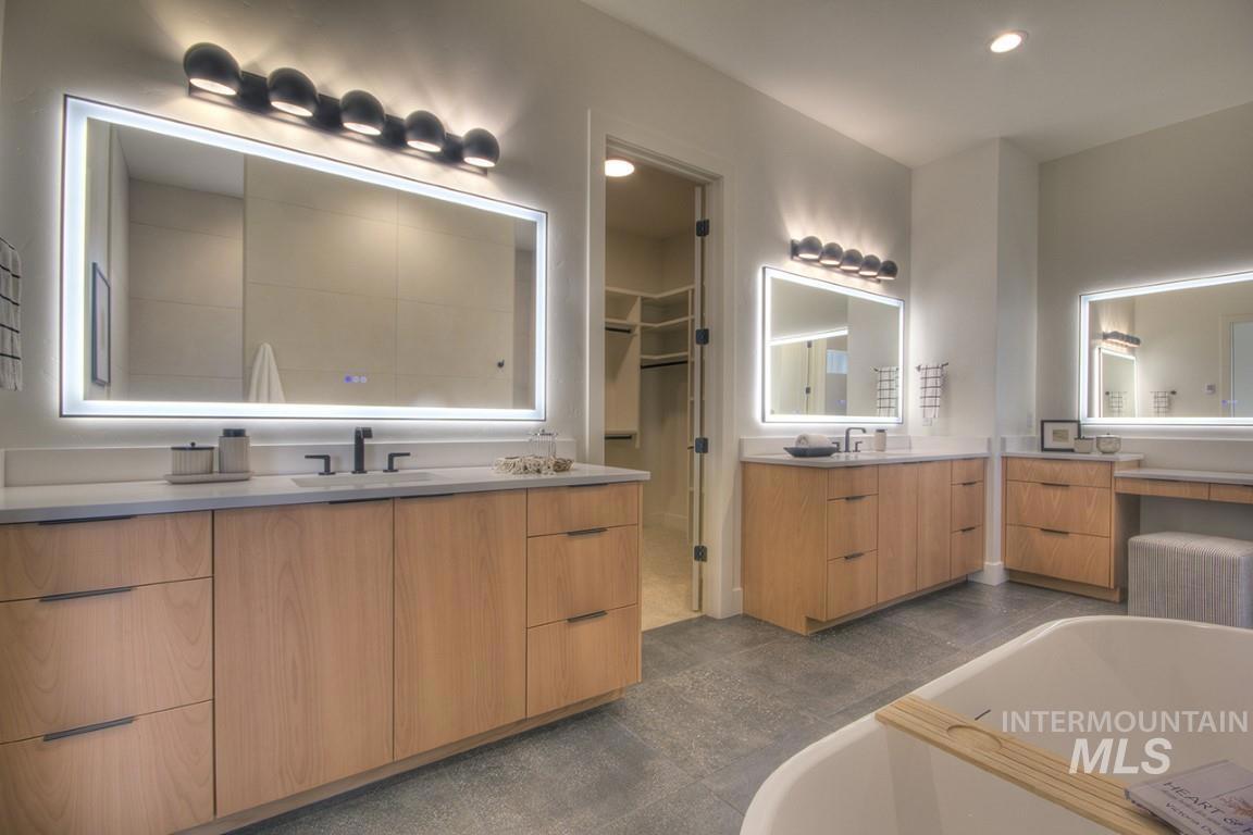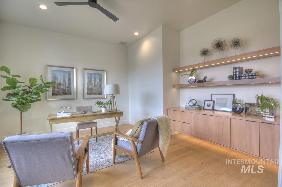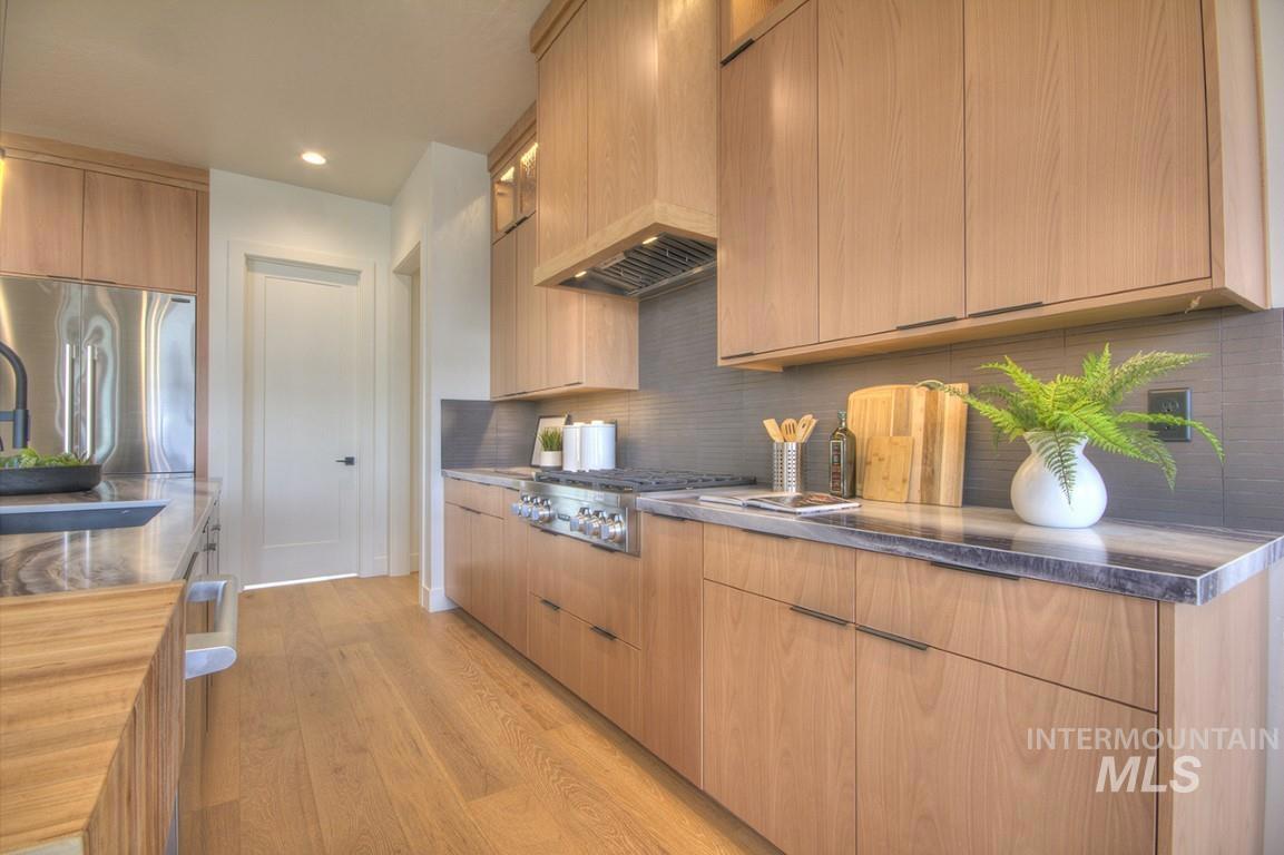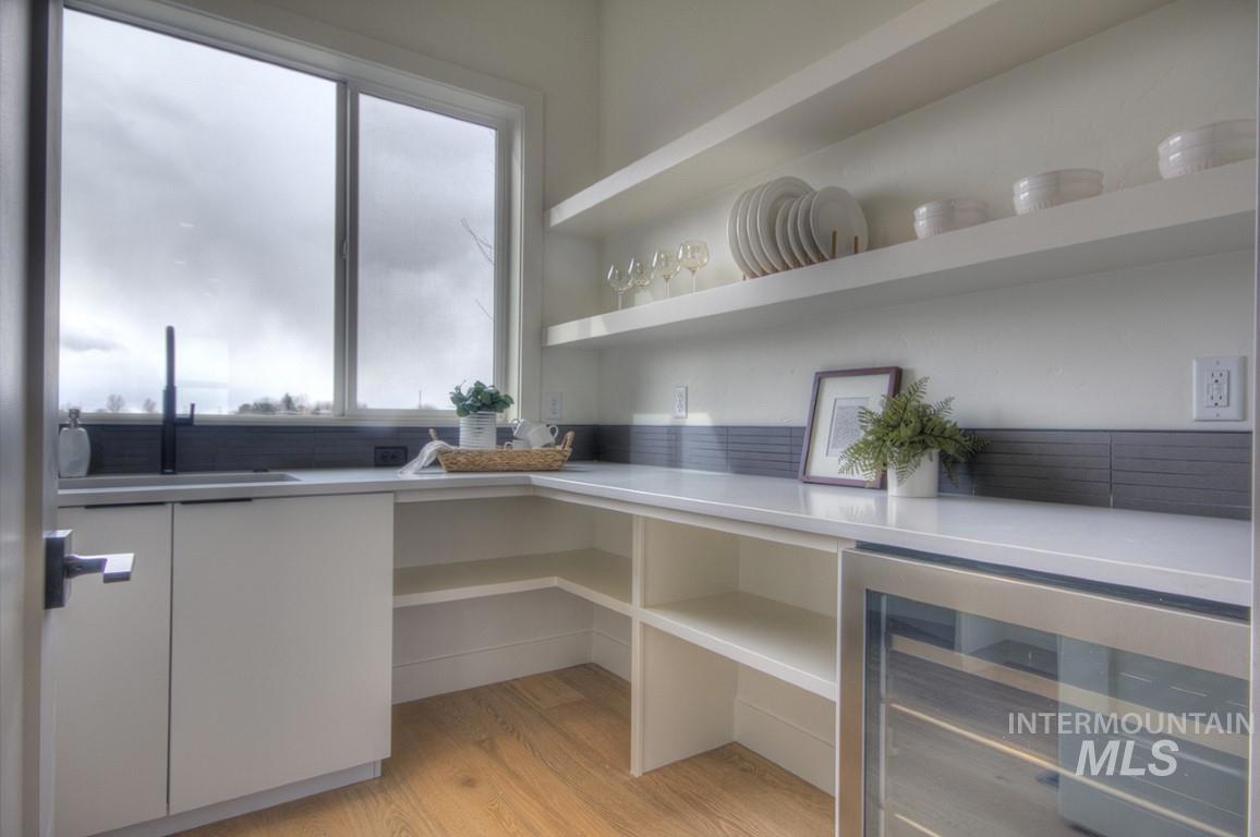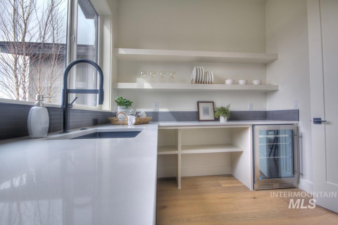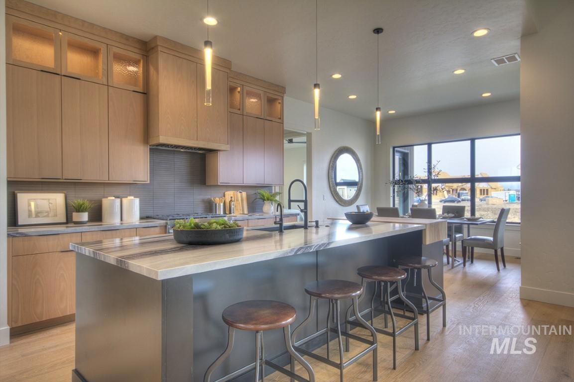Beautiful modern contemporary waterfront home with an east-facing backyard. Ideally located just one minute from downtown Middleton amenities, five minutes to freeway access, and an easy commute to downtown Boise. Features include a spacious, fully insulated 2-car garage plus a 44` RV bay, and a convenient dog wash ideal for active lifestyles. The open-concept floor plan highlights a well-appointed kitchen with double ovens, custom butcher block, and an oversized refrigerator. The primary bath offers heated floors and a walk-in, dual-station shower with body jets and no glass for a clean, luxurious design. Oversized laundry room with extensive custom cabinetry and a true butler’s pantry complete with built-in shelving, beverage cooler, sink, and garbage disposal. The light-filled living room showcases large east-facing windows with water views. Enjoy indoor-outdoor living with a Western Window sliding system opening to a covered patio, wired for outdoor heating and featuring a stone fireplace—perfect for entertaining. Thoughtfully crafted by a builder with 34 years of experience in the Treasure Valley. A must-see home to fully appreciate all it offers.