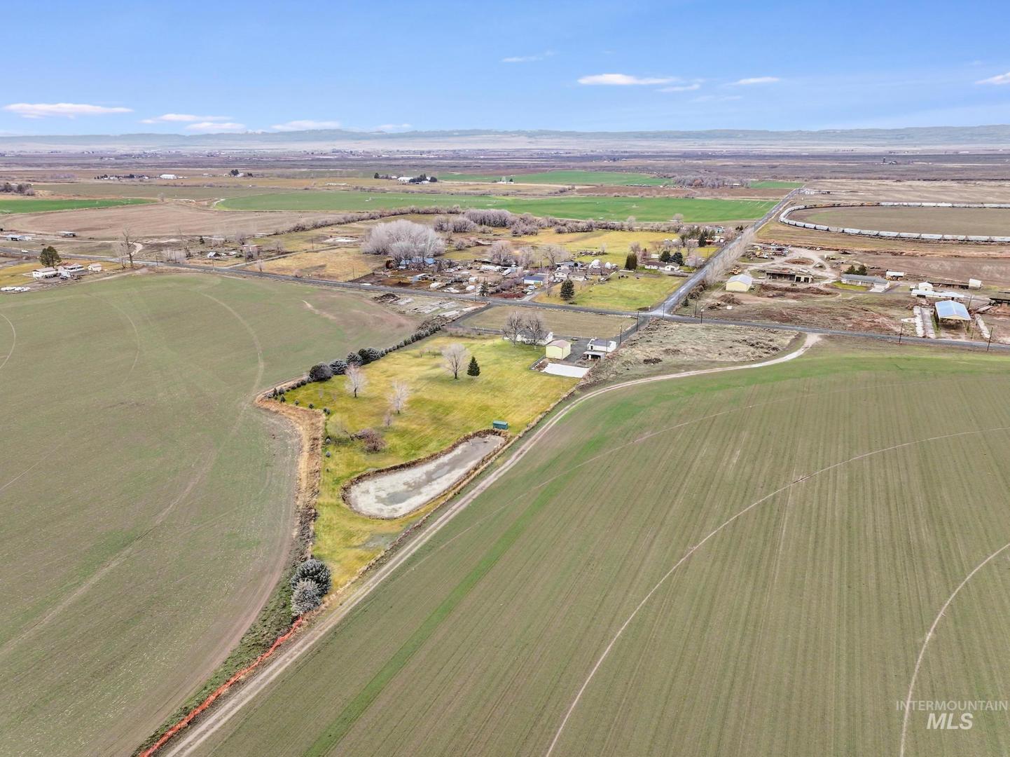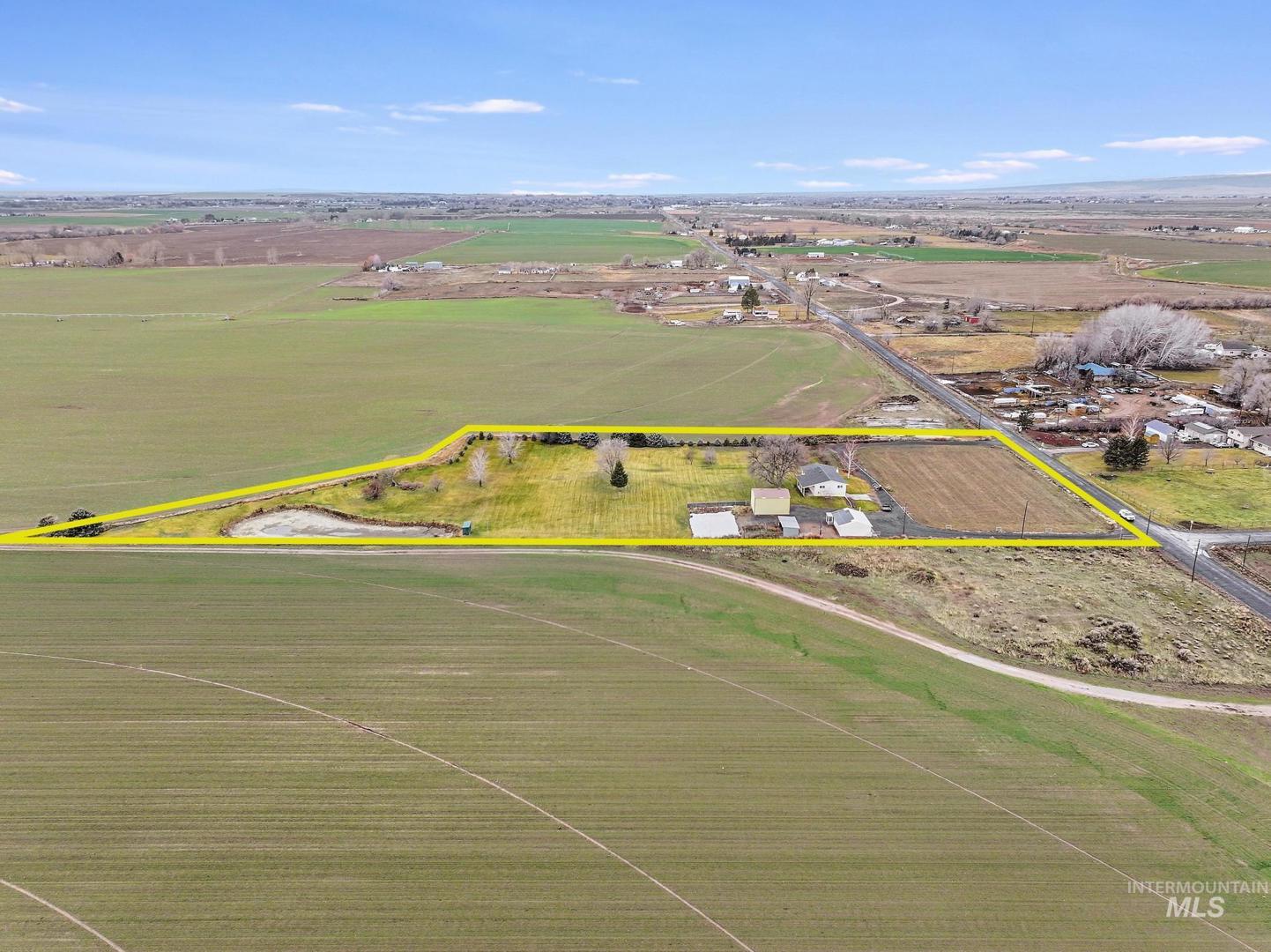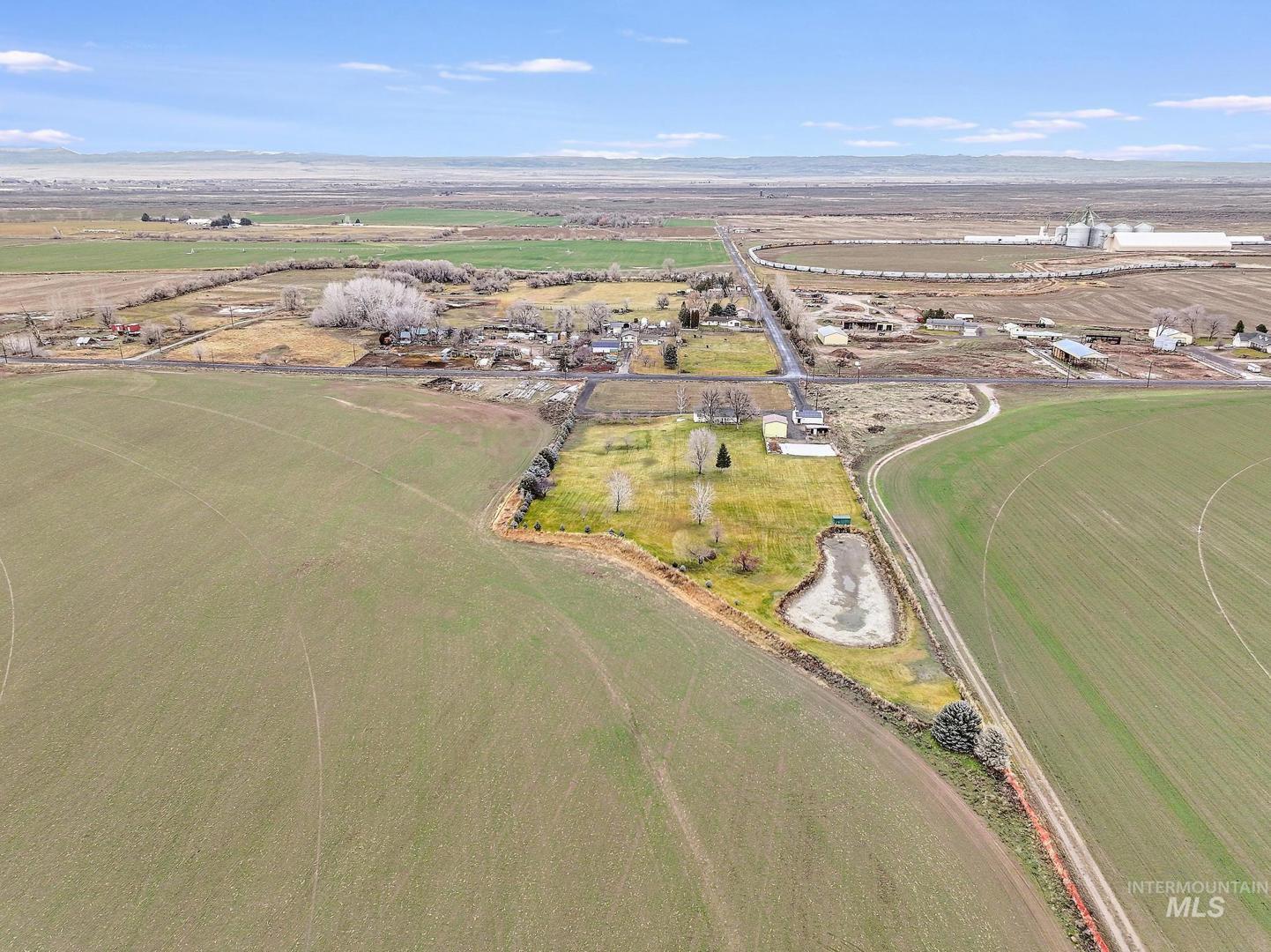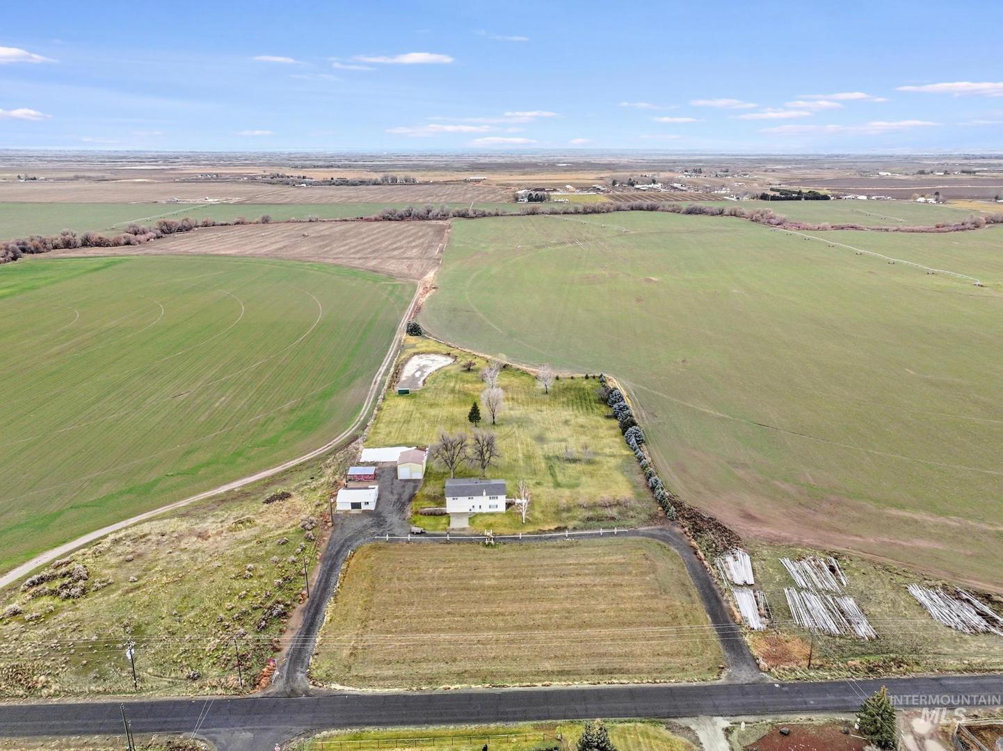 The comforts of country living with the convenience of the city of Gooding just 3 miles to the West. This 4.990 acre parcel features a spacious 2300 sq ft plus home that provides for ground level access to the main floor along with ground level main entry and daylight basement entry. its unique design provides for a 2-car attached garage with access to the daylight basement. Updated flooring, updated kitchen and baths. This property offers a country opportunity with 0ne acre currently in alfalfa with its own wheel line and pressurized main line from the private pond. An extensive manual sprinkler system has been installed to water the yard . Numerous fruit trees are present . Loafing shed and garden area. Two shops top off the list of amenities, one with concrete floors, overhead door, propane heat and home for the solar system that services the home. The solar system is owned. Ingress/egress from the county road is convenient with the improved circular driveway. Ample parking for all your toys, RV`s or equipment.