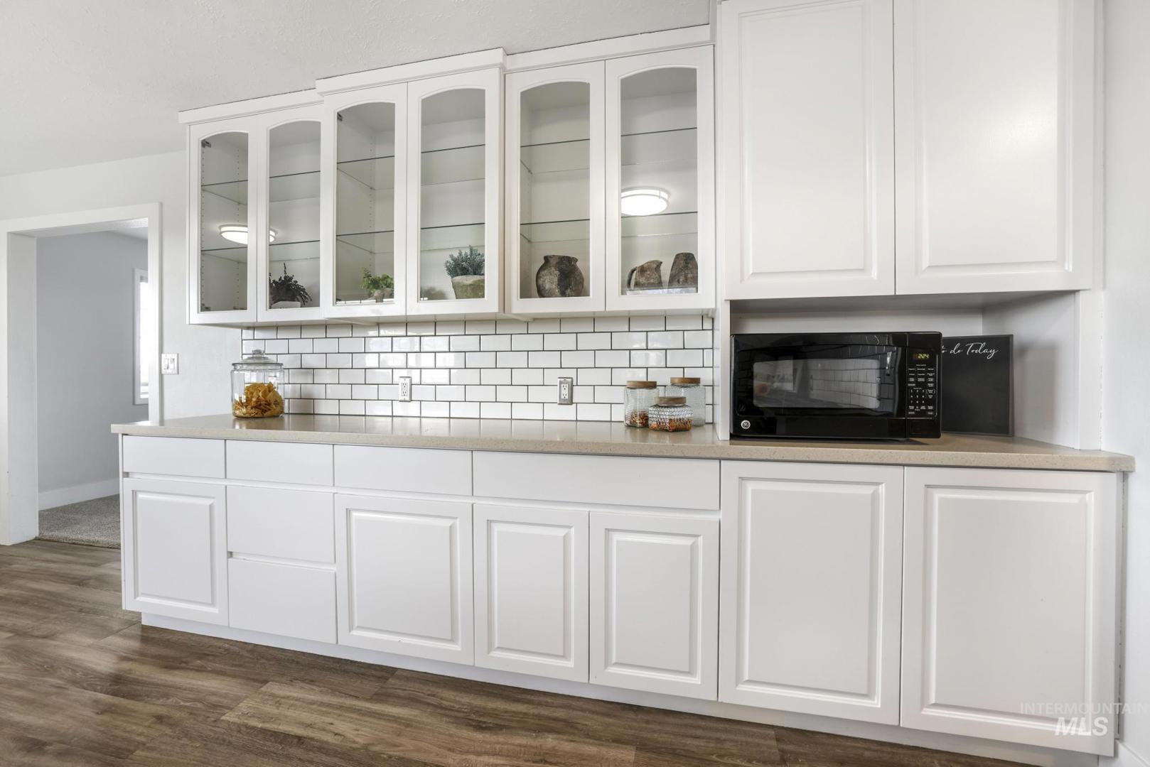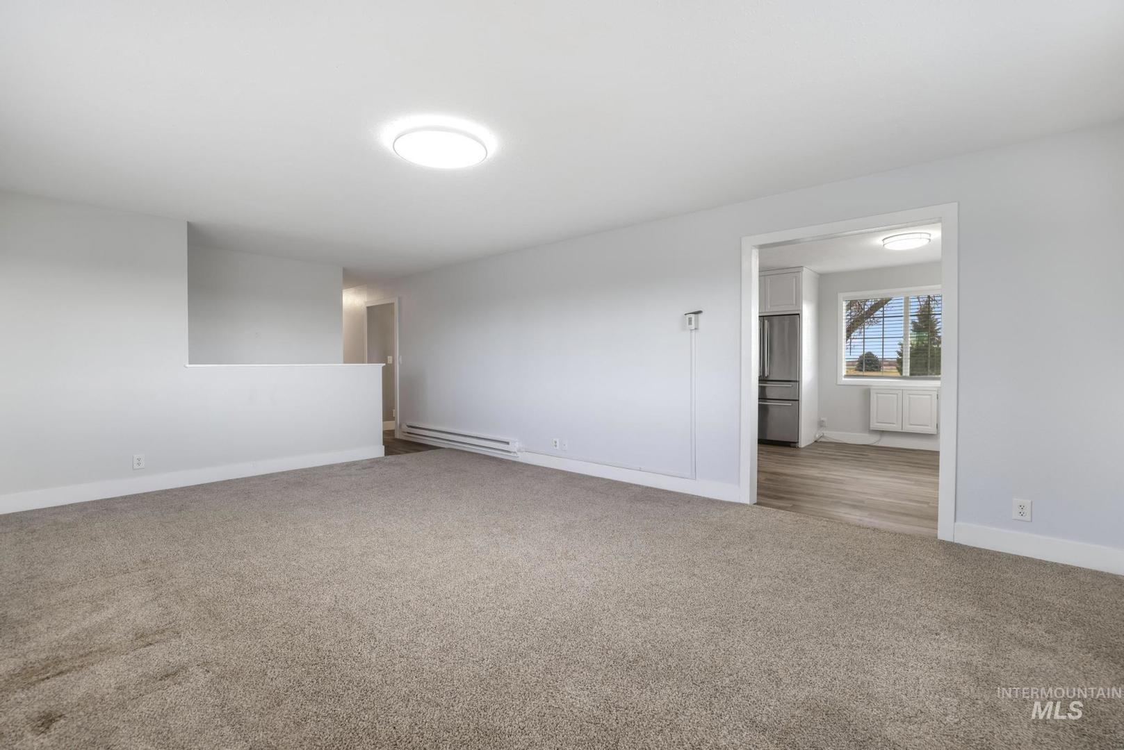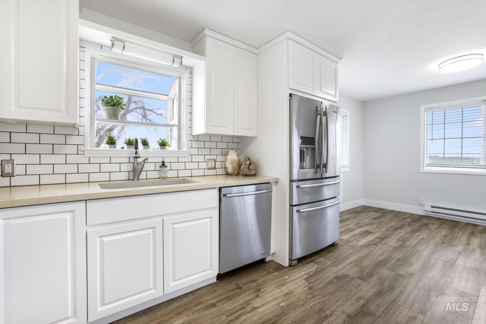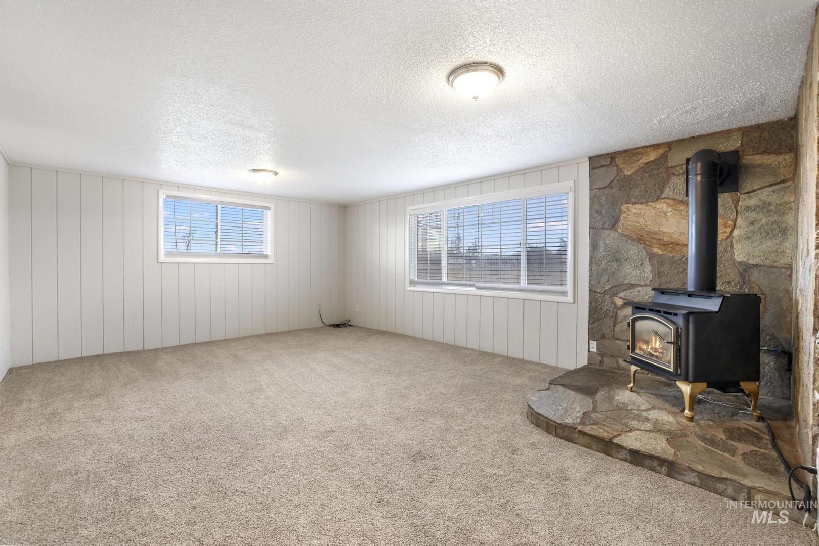 The comforts of country living with the convenience of the city of Gooding just 3 miles to the West. This 4.990 acre parcel features a spacious 2300 sq ft plus home that provides for ground level access to the main floor along with ground level main entry and daylight basement entry. its unique design provides for a 2-car attached garage with access to the daylight basement. Updated flooring, updated kitchen and baths. This property offers a country opportunity with 0ne acre currently in alfalfa with its own wheel line and pressurized main line from the private pond. An extensive manual sprinkler system has been installed to water the yard . Numerous fruit trees are present . Loafing shed and garden area. Two shops top off the list of amenities, one with concrete floors, overhead door, propane heat and home for the solar system that services the home. The solar system is owned. Ingress/egress from the county road is convenient with the improved circular driveway. Ample parking for all your toys, RV`s or equipment.