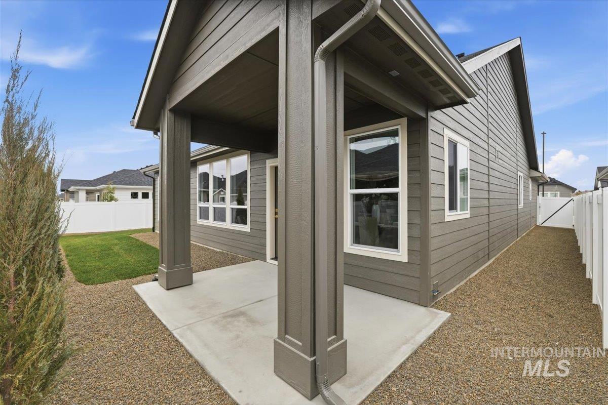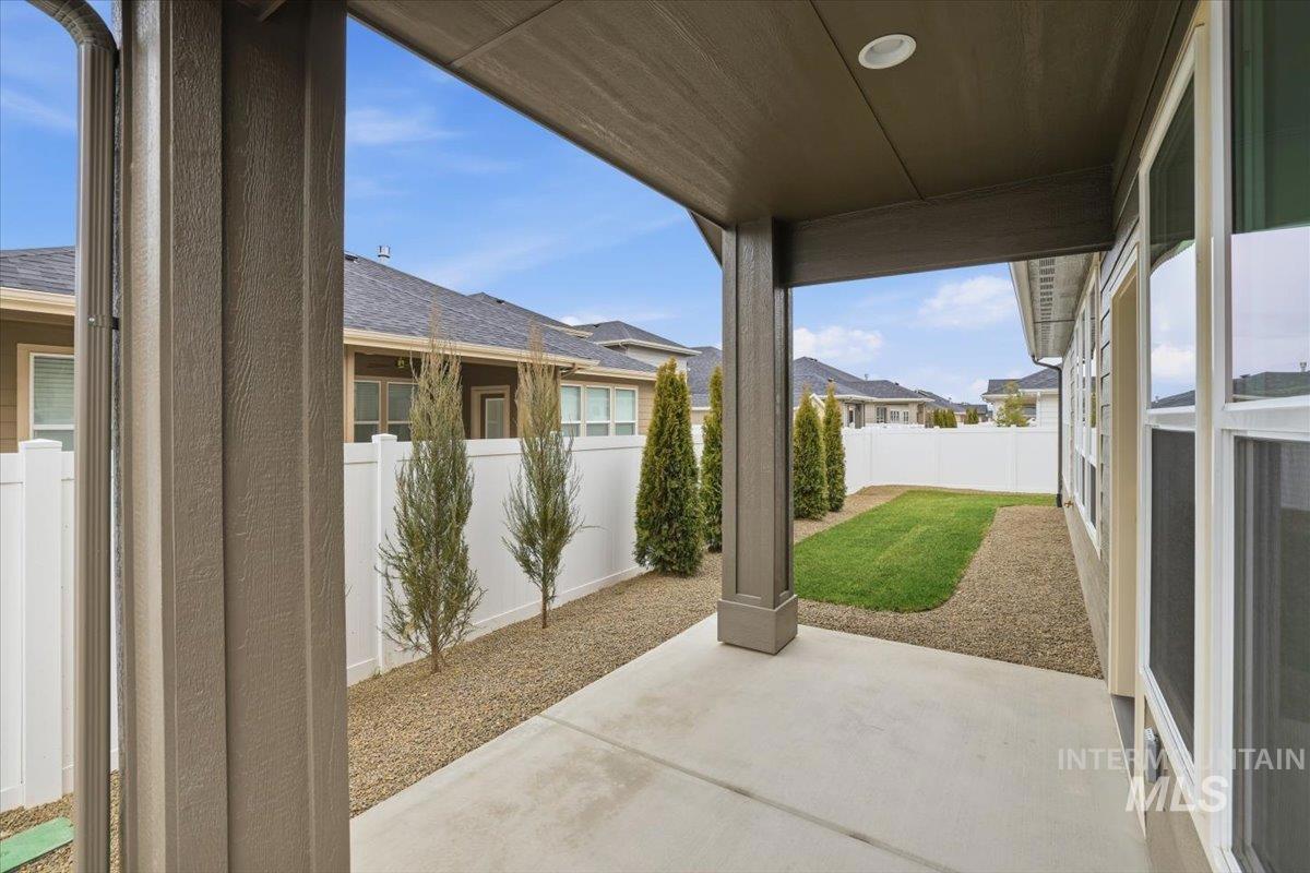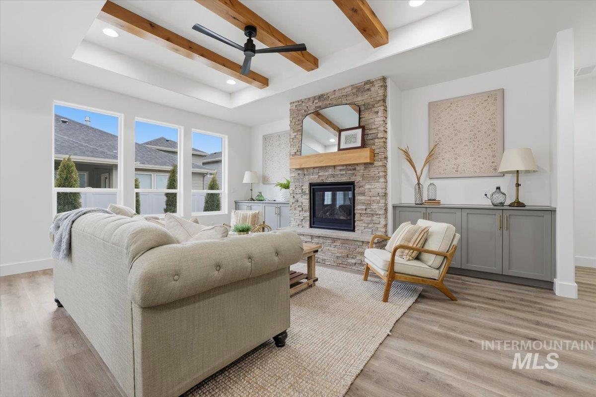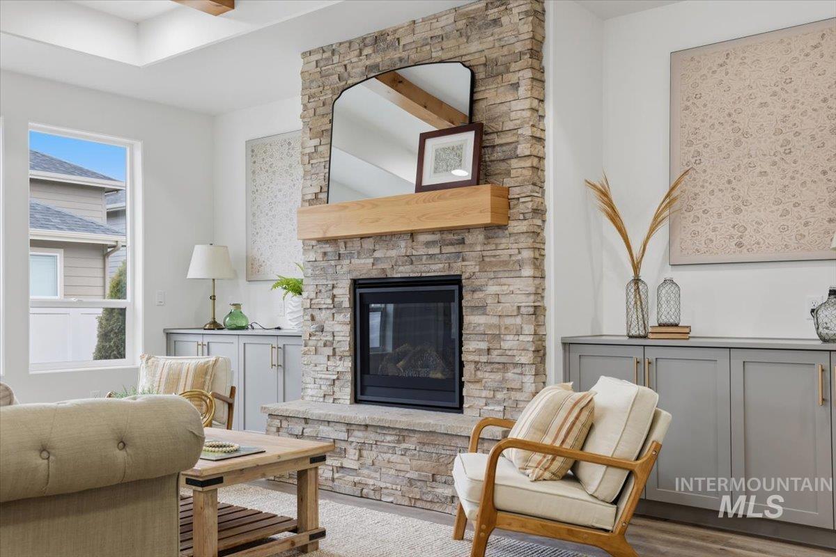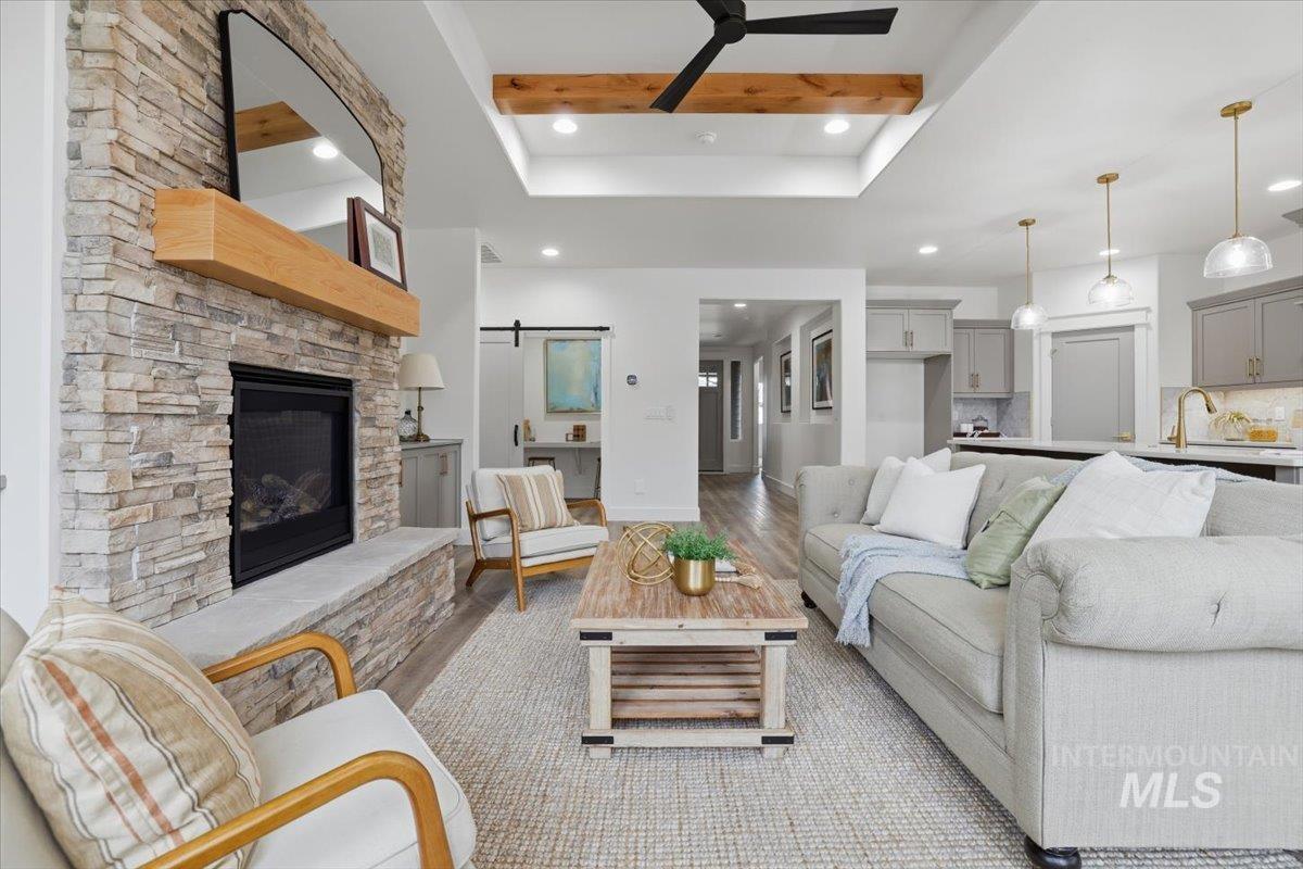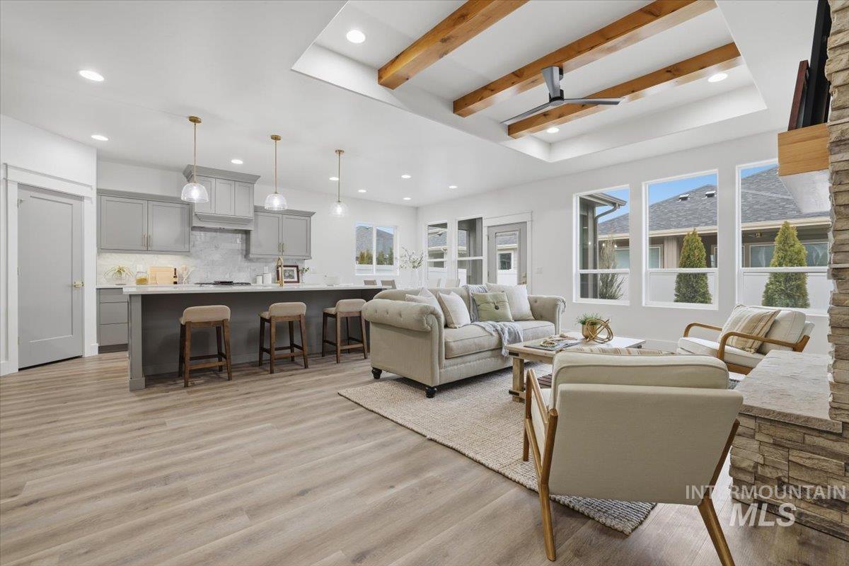 Welcome to the Owyhee by Sunrise Homes. This stunning home boasts 3 spacious bedrooms and a dedicated tech room. The open-concept layout features a captivating stone-wrapped fireplace, a grand coffered ceiling with exposed beams, an expansive dining area, and a gourmet kitchen with quartz countertops, custom cabinetry, and a full tile backsplash. The primary suite offers a serene retreat with a private bathroom featuring dual vanities, a walk-in shower, a soaking tub, and a generous walk-in closet. Enjoy year-round comfort on the covered back patio.