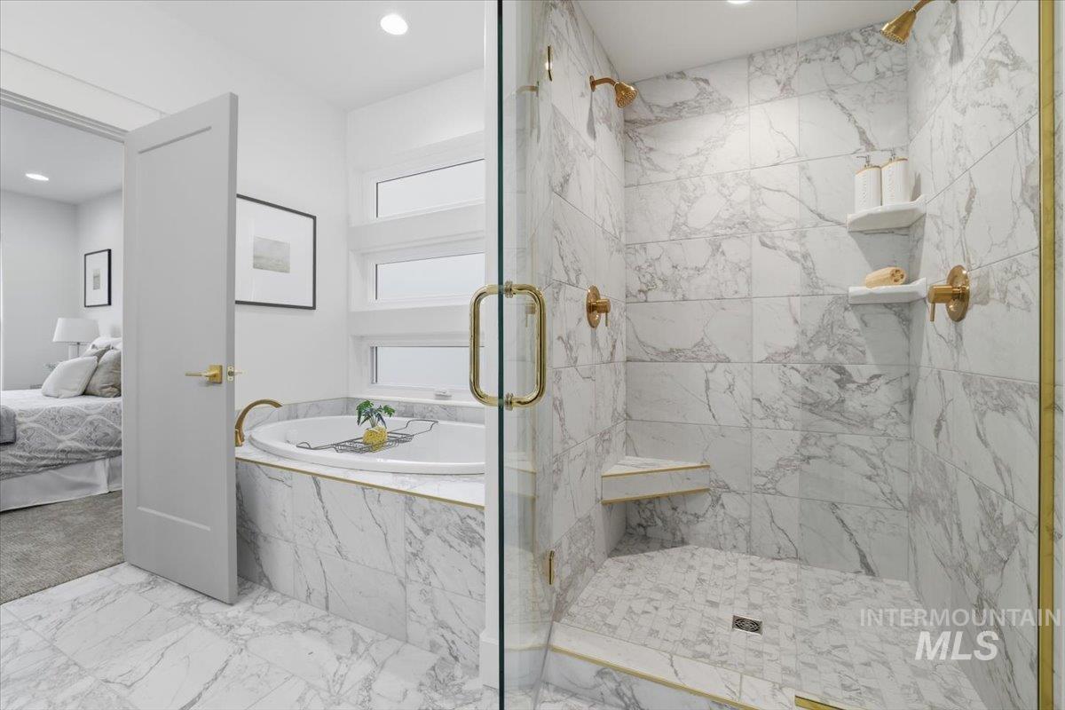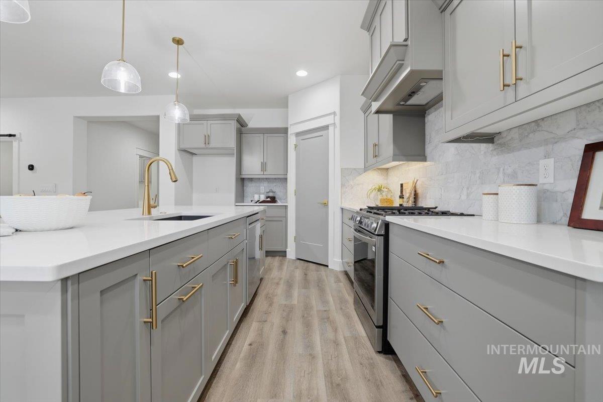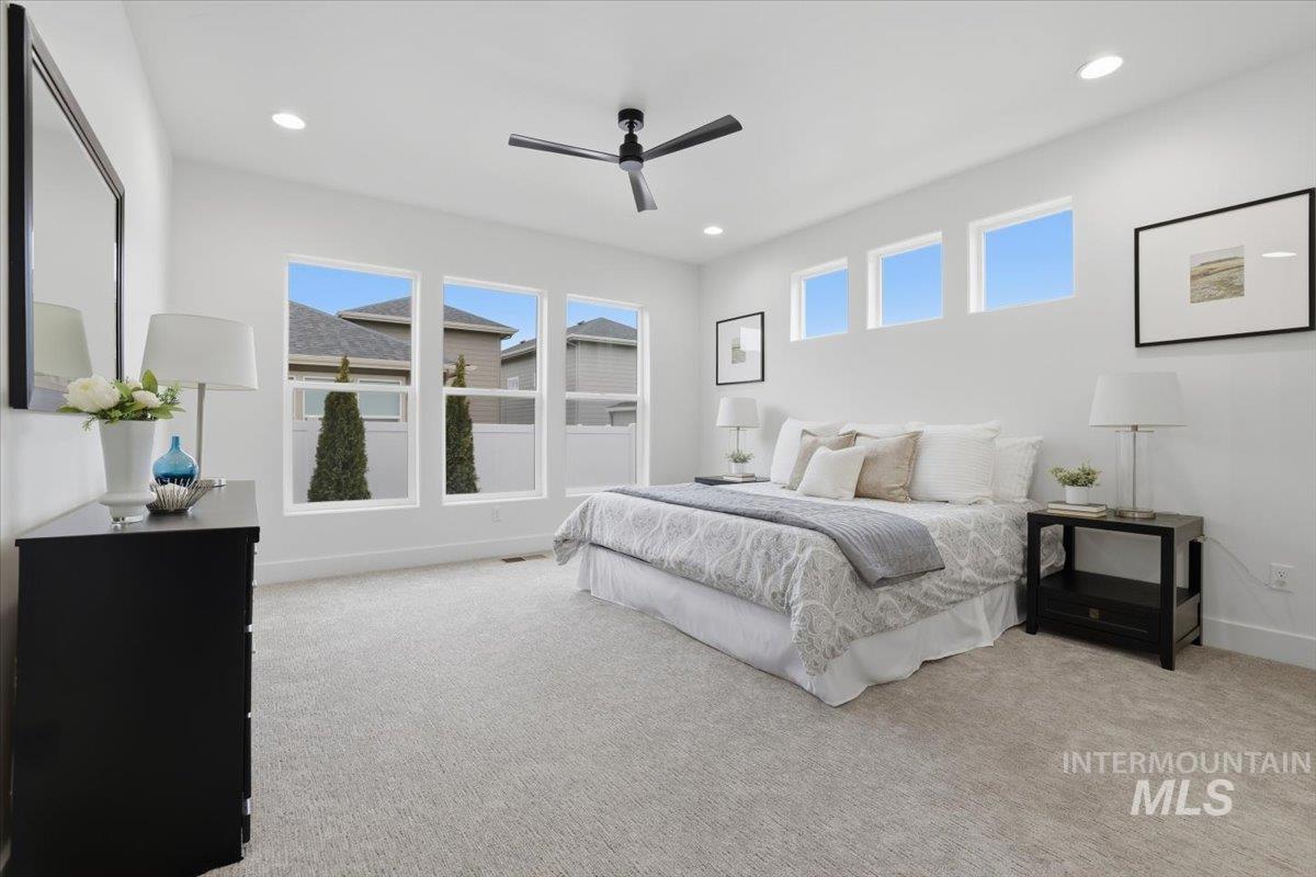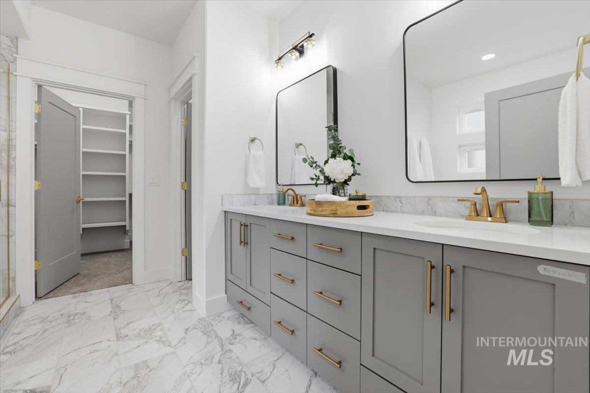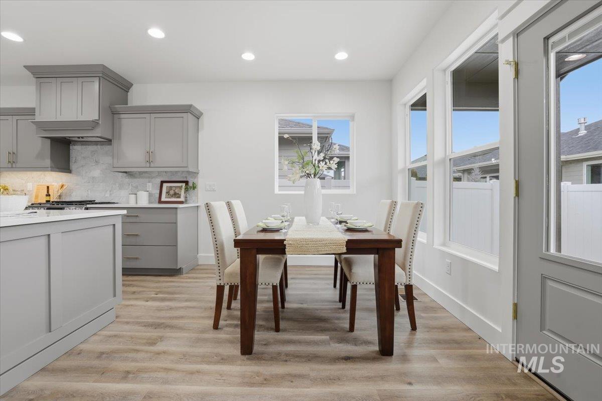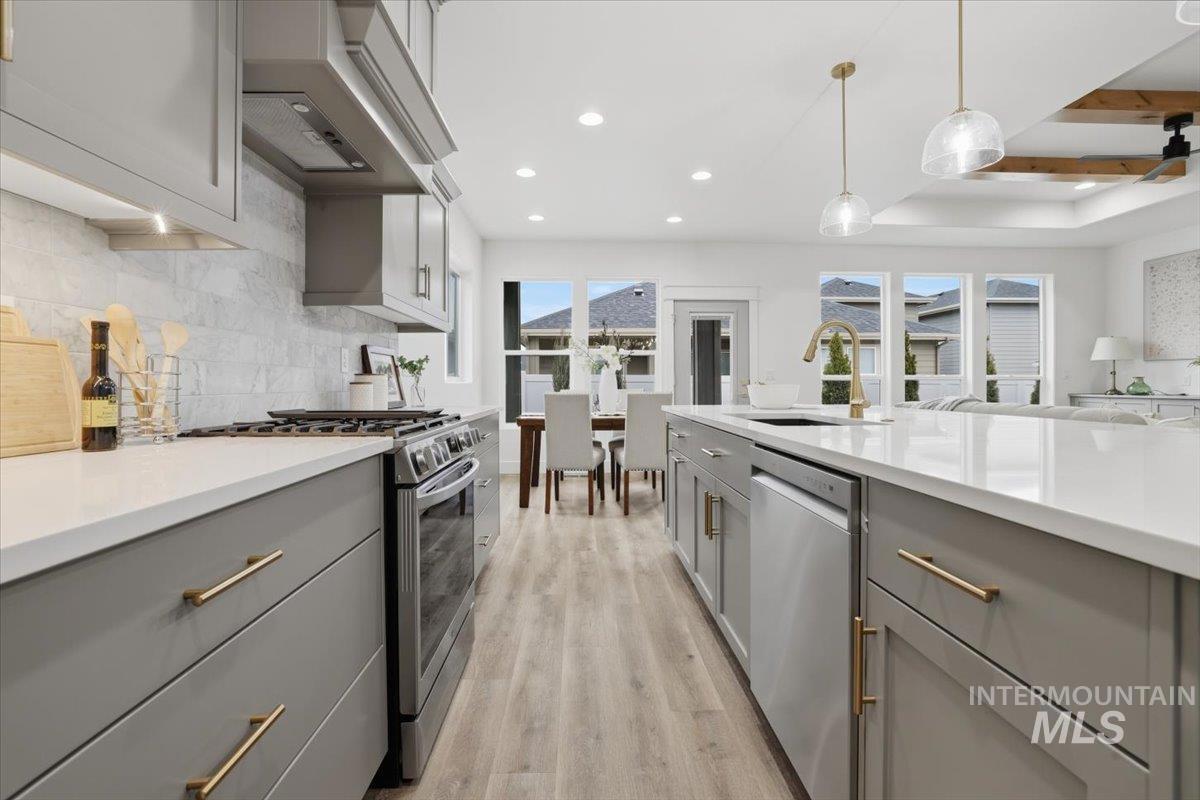 Welcome to the Owyhee by Sunrise Homes. This stunning home boasts 3 spacious bedrooms and a dedicated tech room. The open-concept layout features a captivating stone-wrapped fireplace, a grand coffered ceiling with exposed beams, an expansive dining area, and a gourmet kitchen with quartz countertops, custom cabinetry, and a full tile backsplash. The primary suite offers a serene retreat with a private bathroom featuring dual vanities, a walk-in shower, a soaking tub, and a generous walk-in closet. Enjoy year-round comfort on the covered back patio.