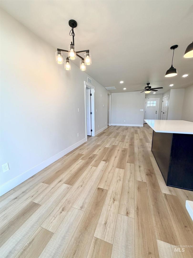 Introducing The Oregon — a thoughtfully designed single-level home with privacy, space, and comfort in mind. This 3 bedroom, 2 bathroom layout offers 1,200 square feet of builder-grade simplicity, featuring a desirable split-bedroom floor plan that places the primary suite on one side and secondary bedrooms on the other. The open-concept living area connects the kitchen, dining, and living spaces for easy daily living. LVP flooring runs throughout the main areas, while carpet brings warmth to each bedroom. The front yard is fully landscaped, and the backyard is ready for your vision. Located in an established Caldwell neighborhood with no HOA, The Oregon is minutes from Indian Creek Plaza, College of Idaho, Fairview Golf Course, and I-84. Built by a trusted local builder and move-in ready with no customization options — just clean lines, practical finishes, and a layout that works. The Oregon offers separation where you need it and simplicity where it counts. Pictures are renderings not actual home.
