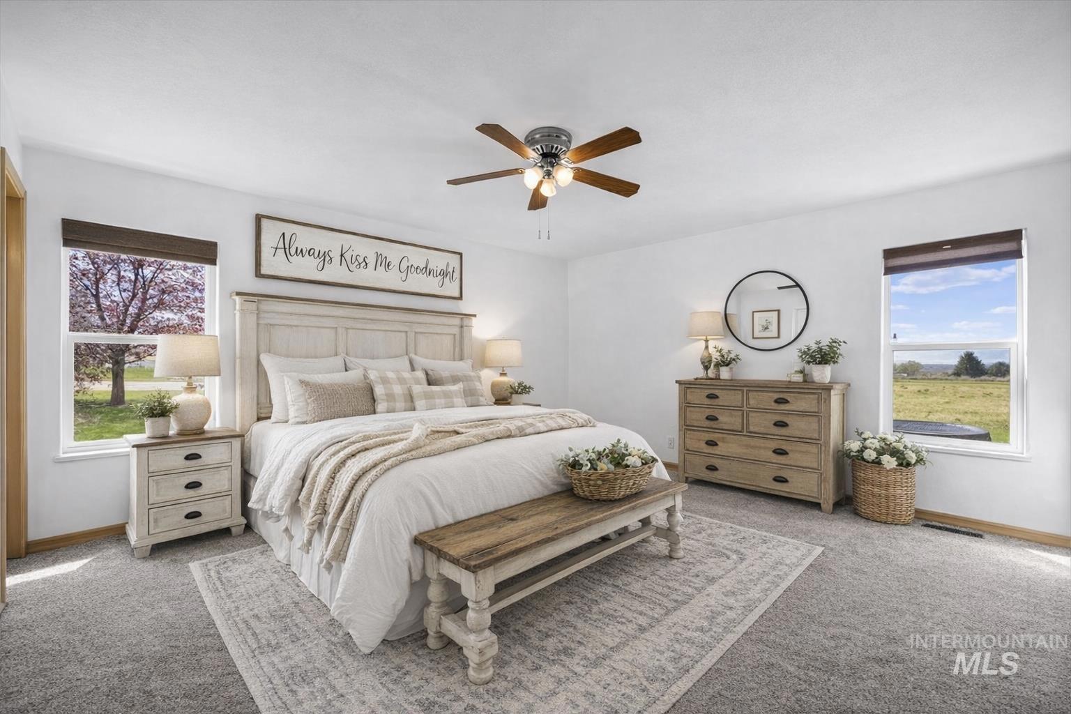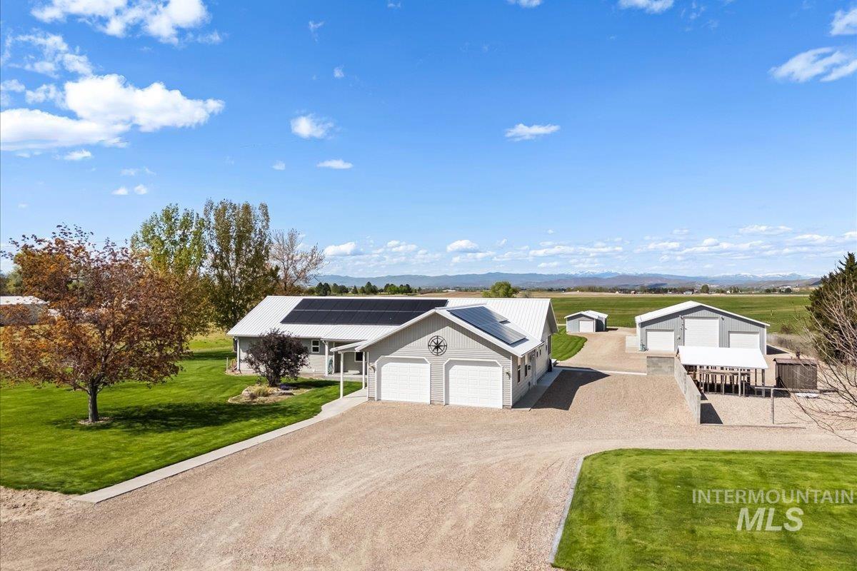 Multi generation home located just 400 yards from Scotch Pines Golf Course in Payette. This six bedroom three and a half bathroom residence offers approximately 3800 square feet of updated living space on 2.2 acres. The property features full solar power, a new steel roof and siding, a Lenox all electric HVAC system, and a new septic system. Designed for flexible living, the home includes two kitchens and a fully accessible (ADA) lower level. Recent updates include vinyl windows, LED lighting, and modernized bathrooms. The main level offers four bedrooms including a master suite with a walk in shower, generous living and dining spaces, a mudroom bathroom, laundry area, and a spa ready patio. The lower level includes two additional bedrooms, a full bathroom with walk in shower, a full kitchen, a large family room, and a walkout patio. Outbuildings include a 40 by 48 RV shop with a cooler and a heated and cooled bay, a 12 by 28 workshop, a 16 by 16 garden shed, and a 20 by 36 machinery shed. The property is fully landscaped with underground sprinklers and established garden areas. Enjoy open views, excellent energy efficiency, and peaceful country living just minutes from town. Ideal setup for multi generation living or business use.