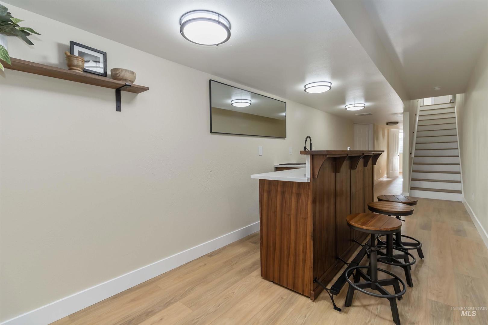 Set on a quiet corner in the Raintree subdivision, this residence opens into connected living, dining, and kitchen spaces finished with luxury vinyl plank flooring and custom hand-made thresholds that define transitions without interrupting flow. The kitchen sits at the center with stone countertops and backsplash, updated fixtures, and a pot filler above the stove. The breakfast nook overlooks the pond and brings in natural light throughout the day. The main level includes a primary suite and two additional bedrooms. The primary suite features a walk-in closet, direct walkout access, and a bathroom with dual vanity, custom shower, bidet, and spa-style finishes. Bathrooms are finished with luxury vinyl tile flooring, and storage is placed throughout the home. The lower level is a fully finished basement, continuing with luxury vinyl plank flooring and anchored by a custom walnut bar with integrated wine storage, built from solid wood and stone. An adjoining room functions naturally as a second living area or theater space. Above, an upstairs bonus room is set apart from the main living areas. The garage is fully finished and includes a 220-volt outlet. The corner lot provides spacing from neighboring homes. 5 bedrooms, 3 bathrooms, a fully finished lower level, and an upstairs bonus room.