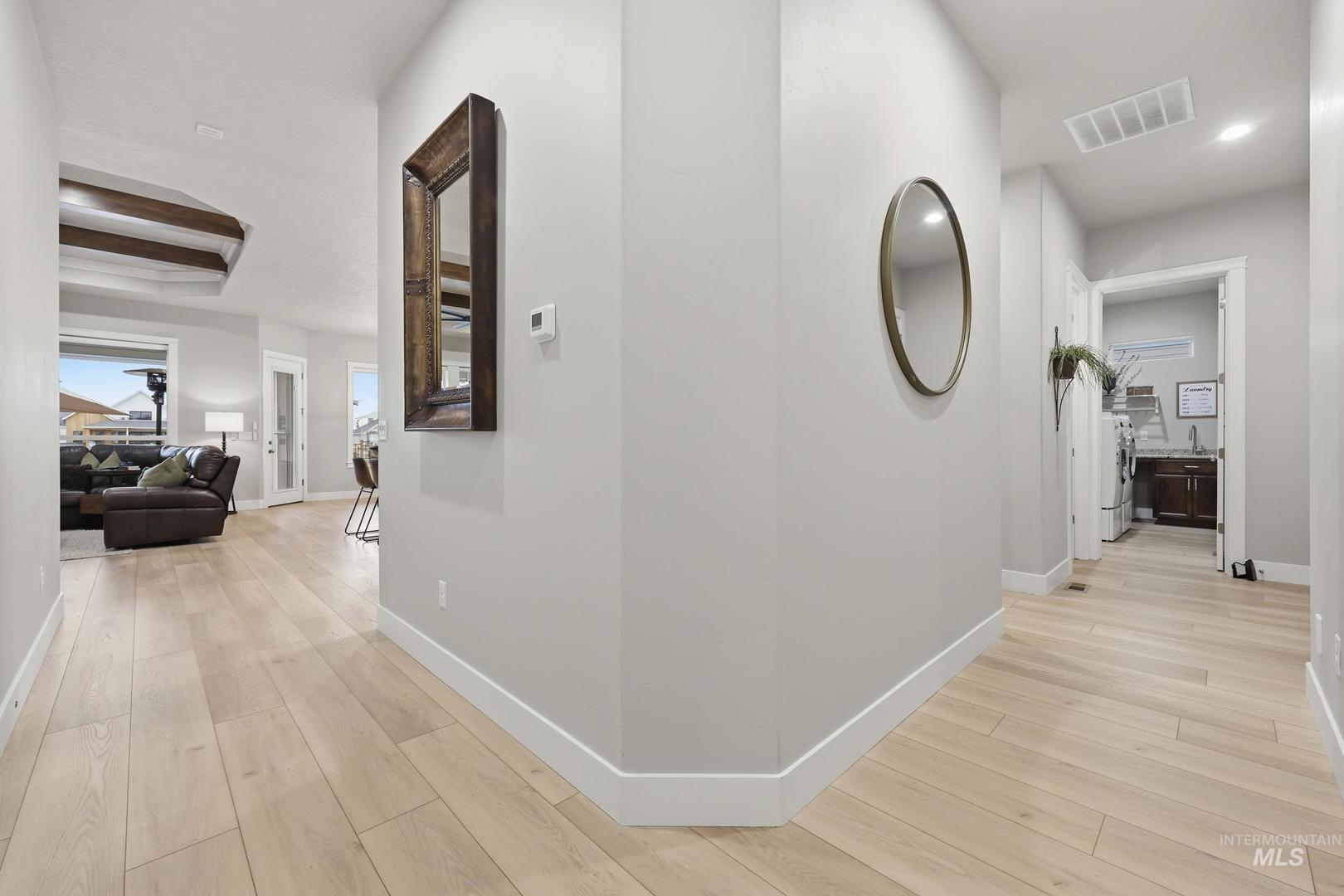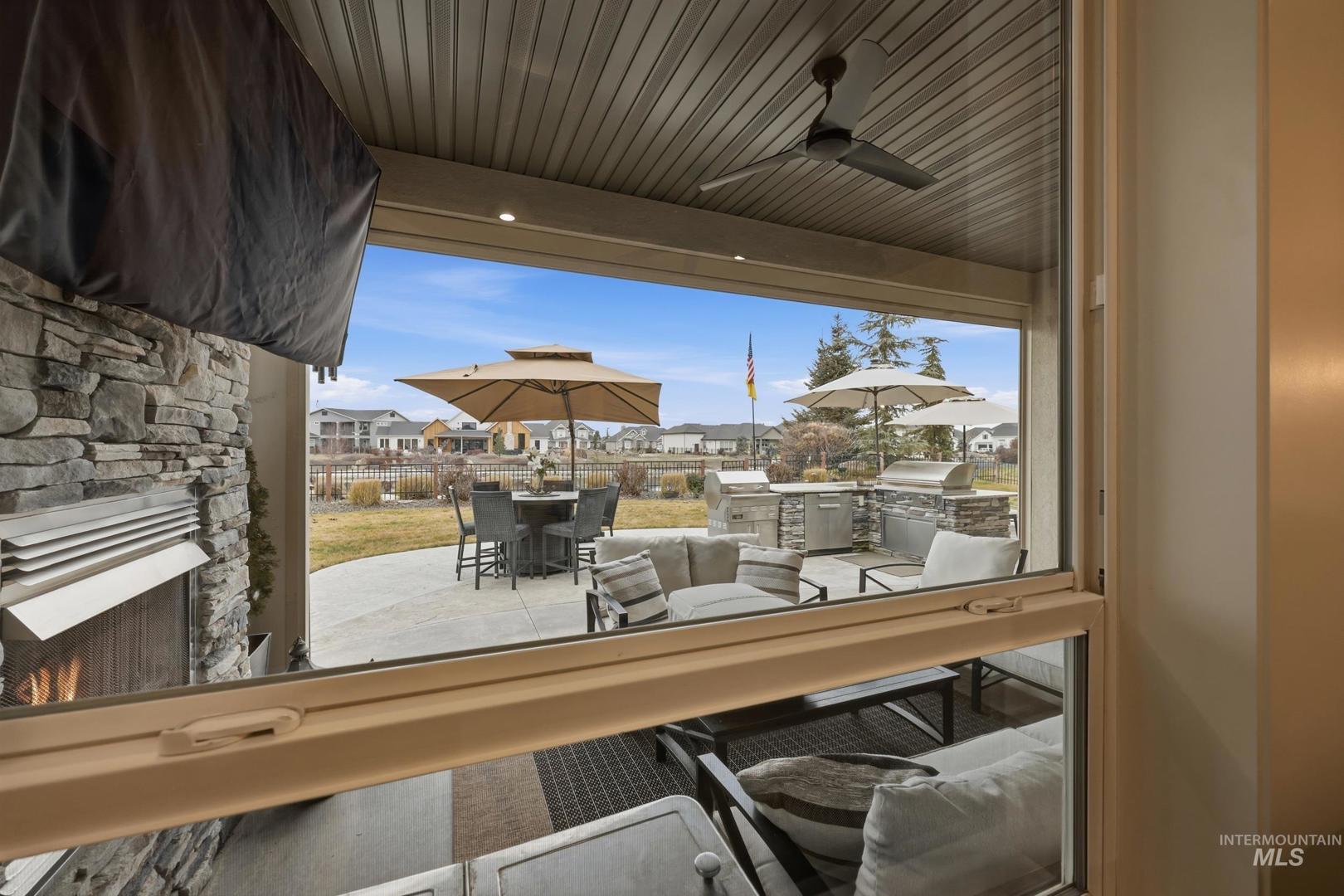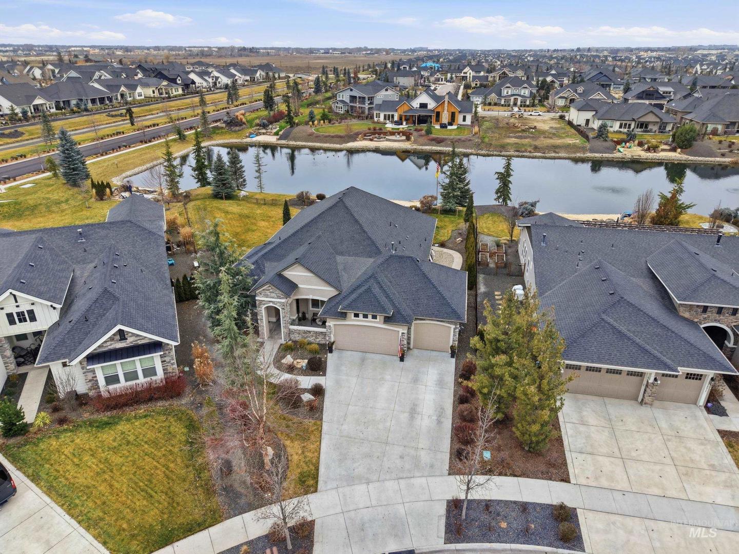Welcome to 1345 N. Triathlon Ave in the highly sought-after Legacy Subdivision in Eagle —where refined design meets exceptional waterfront & golf course living. This stunning single-level, open-concept home offers 2,492 square feet of thoughtfully designed space, featuring 3 bedrooms, a dedicated office, and 3.5 bathrooms. Perfectly positioned on a .27-acre pie-shaped lot, the property backs to the water and showcases rare beachfront access, lush green lawn, designated garden and breathtaking sunset views. Outdoor living is elevated with a spacious patio, complete with an outdoor fireplace and built-in BBQ, creating the perfect setting for entertaining or relaxing by the water. Inside, the home shines with a recently remodeled kitchen featuring crisp white cabinetry, a huge center island, quartz countertops, and top of the line stainless steel appliances, all flowing seamlessly into the expansive great room. The great room is highlighted by wood beam ceilings, silhouette blinds adding warmth and character throughout. The beautiful primary suite offers a private retreat with a luxurious soaking tub, walk-in shower, and a large walk-in closet, wood shutters, designed for comfort and relaxation. Additional highlights include luxury large-plank neutral vinyl flooring, newer carpeting, and granite countertops in all bathrooms & a whole house purification system and humidifier.