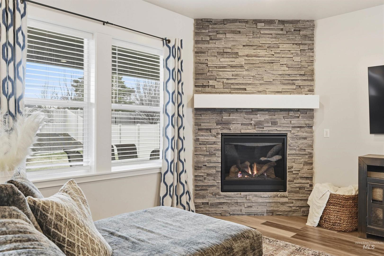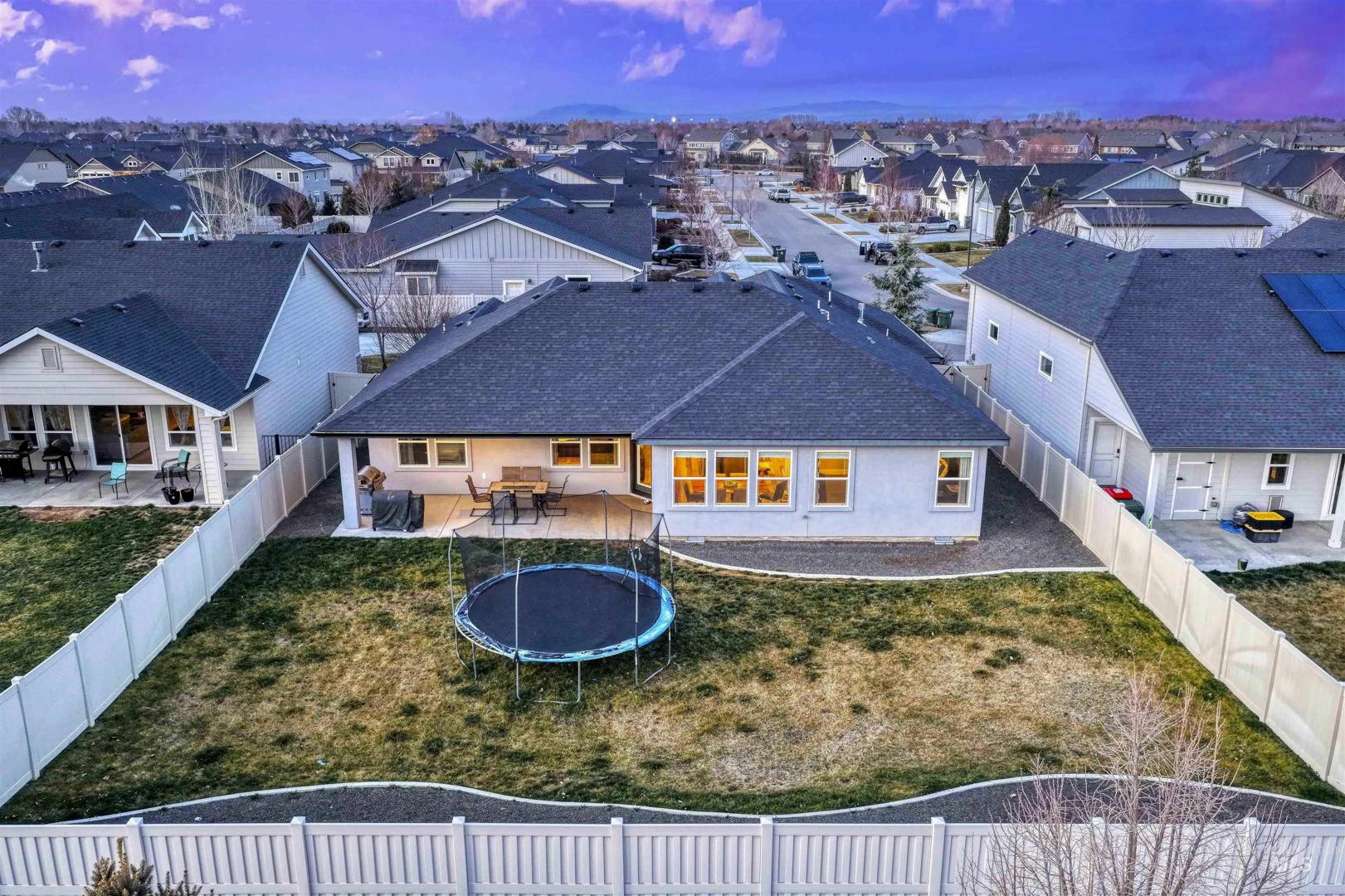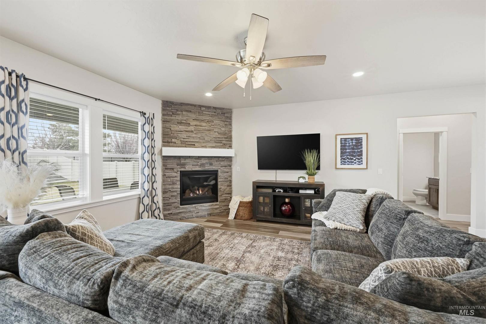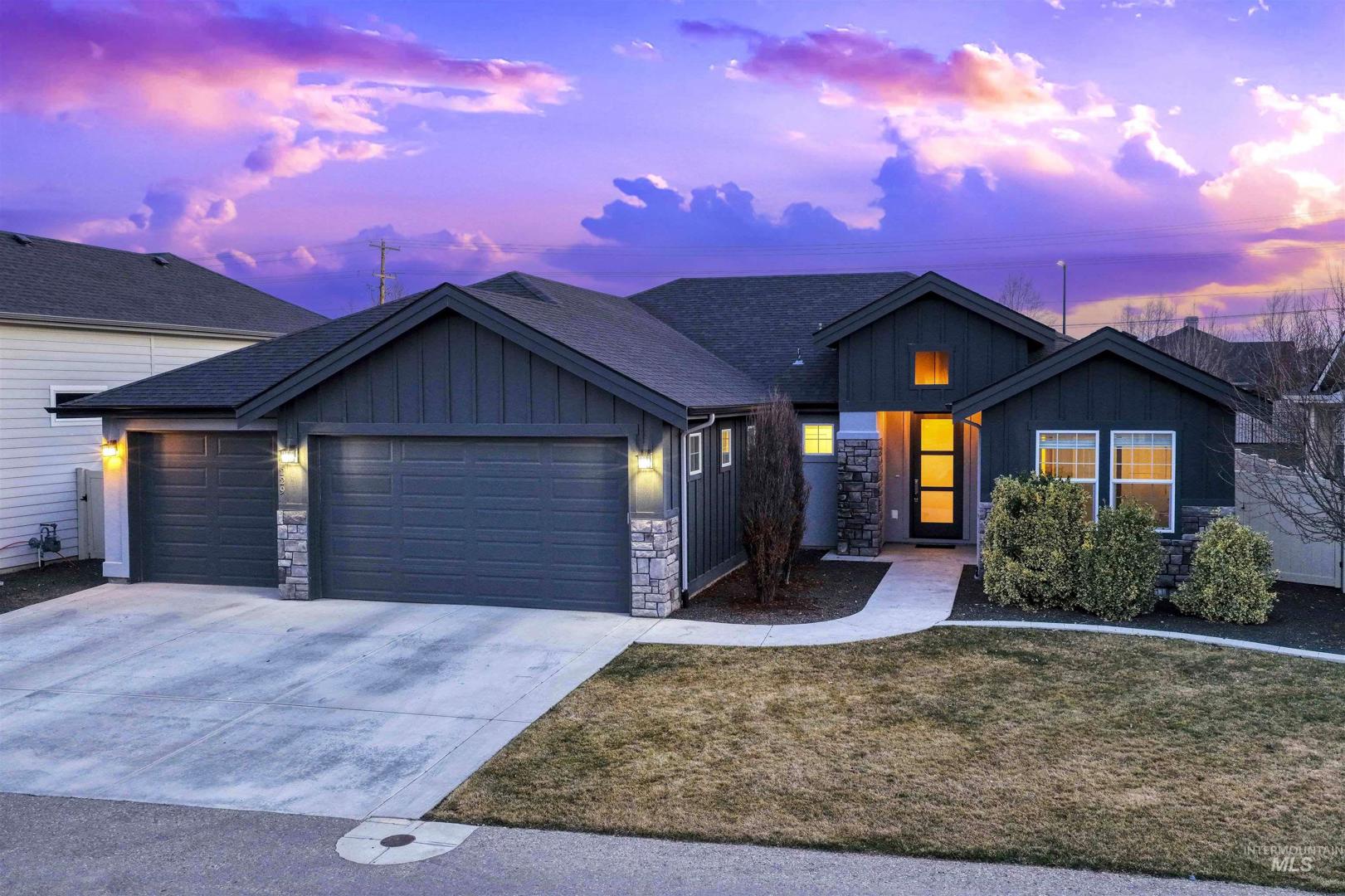 Step into this beautiful single-level home where comfort, style, and thoughtful design come together effortlessly! Rich hardwood floors guide you through the entry, kitchen, dining area, and expansive great room, anchored by a striking floor-to-ceiling stone fireplace that instantly sets the tone for cozy evenings and memorable gatherings. The kitchen is a true showstopper, offering stainless steel appliances, custom cabinetry, a large island perfect for entertaining, granite countertops, and a spacious pantry designed for everyday ease. The primary suite feels like a private retreat, highlighted by dual vanities with granite countertops, a luxurious soaker tub, a full tile walk-in shower, and an oversized walk-in closet. Step outside to the covered back patio: an ideal space for hosting friends, enjoying summer evenings, or simply unwinding at the end of the day. A roomy three-car garage adds both convenience and storage, while the home’s prime location places you just minutes from popular restaurants, shopping, and easy access to the Eagle Road interchange. This home truly offers the perfect blend of elegance, functionality, and location.